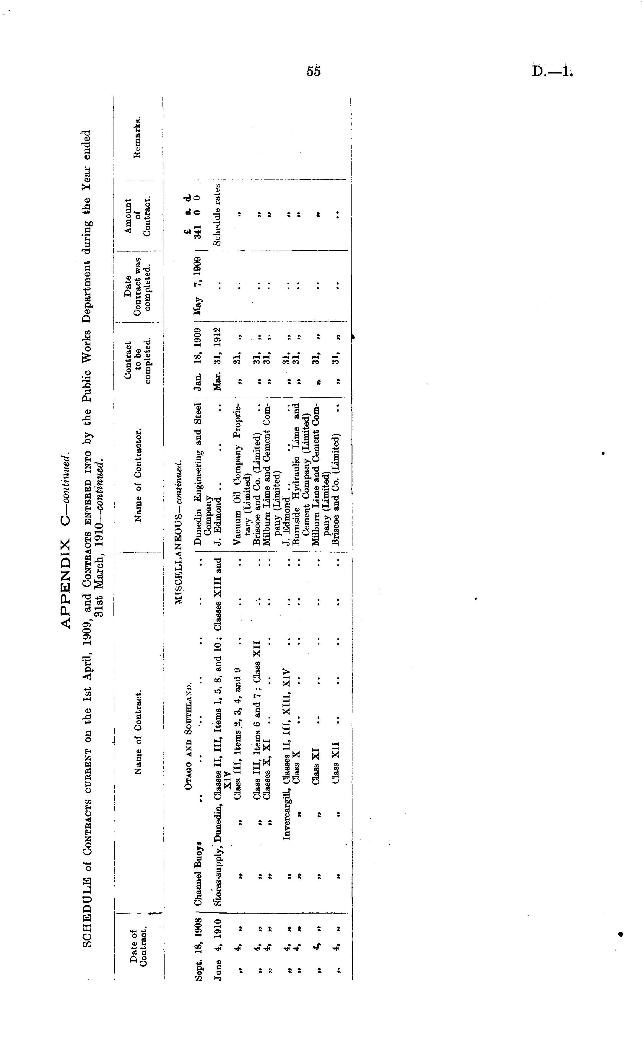 Date of Contract. Name of Contract. Name of Contractor. Contract to be completed. Date Contract was completed. Amount of Contract. Remarks. MISCELL Otago and Southland. NEOUS— continued. Sept. 18, 1908 Channel Buoys Dunedin Engineering and Steel Company J. Edmond Jan. 18, 1909 £ s. d. May 7, 1909 [ 341 0 0 June 4, 1910 Stores-supply, Dunedin, Classes II, III, Items 1, C, 8, and 10; Classes XIII and XlV „ „ Class III, Items 2, 3, 4, and 9 .. .. Mar. 31, 1912 Schedule rates »» *• >» „ 4, „ 4 9, ** t* 4 99 *» 9* „ „ Class III, Items 6 and 7 ; Class XII „ ,, Classes X, XI Invercargill, Classes II, III, XIII, XIV .. .. „ „ Class X Vacuum Oil Company Proprietary (Limited) Briscoe and Co. (Limited) Milburn Lime and Cement Company (Limited) J. Edmond Burnside Hydraulic Lime and Cement Company (Limited) Milburn Lime and Cement Company (Limited) Briscoe and Co. (Limited) 99 *>A> »» n oi, »• « ' oi, »f „ 31, „ * - .9 99 • • tt 99 **» 99 „ „ Class XI »> 31, „ M 99 "*» 99 „ „ Class XII f# oi, „