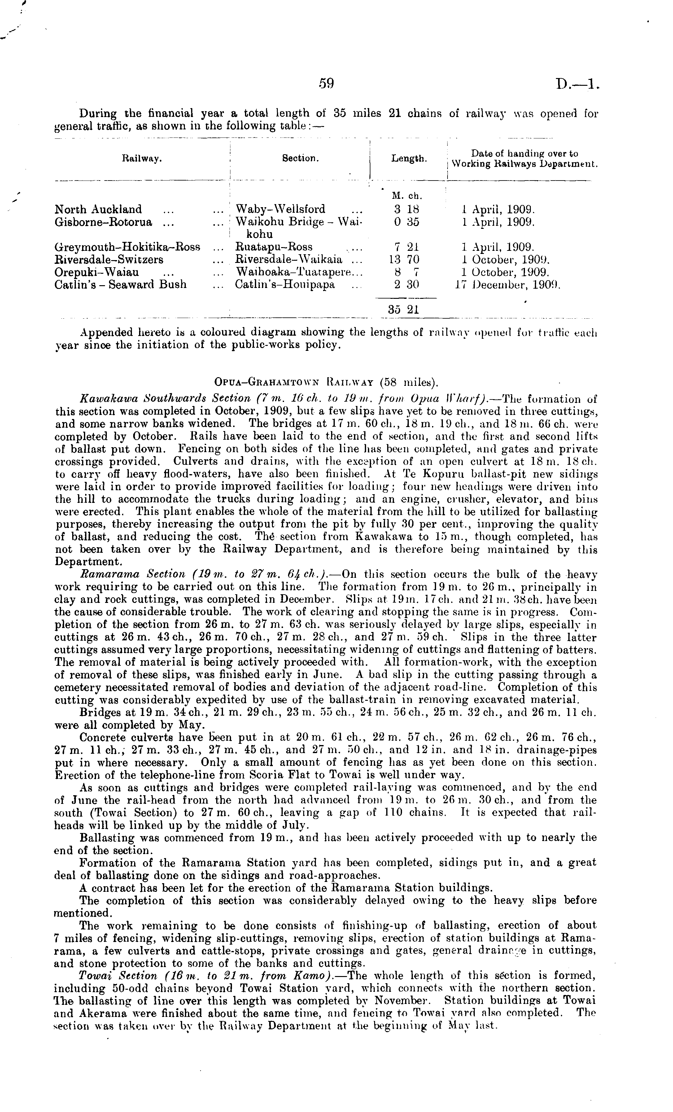 Railway. Railway. Section. - Length. Date of handing over to Working Railways Department. J North Auckland Gisborne-Eotorua ... Greymouth-Hokitika-Ross Riversdale-Switzers Orepuki-Waiau Catlin's - Seaward Bush ... Waby-Wellsford ... Waikohu Bridge - Waikohu ... Ruatapu-Ross ... Riversdale-Waikaia ... ... Waihoaka-Tuatapere... ... Catlin's-Houipapa M. ch. 3 18 0 35 7 21 13 70 8 7 2 30 I April, 1909. 1 April, 1909. 1 April, 1909. 1 October, 1909. 1 October, 1909. 17 December, 1909. » 30 21