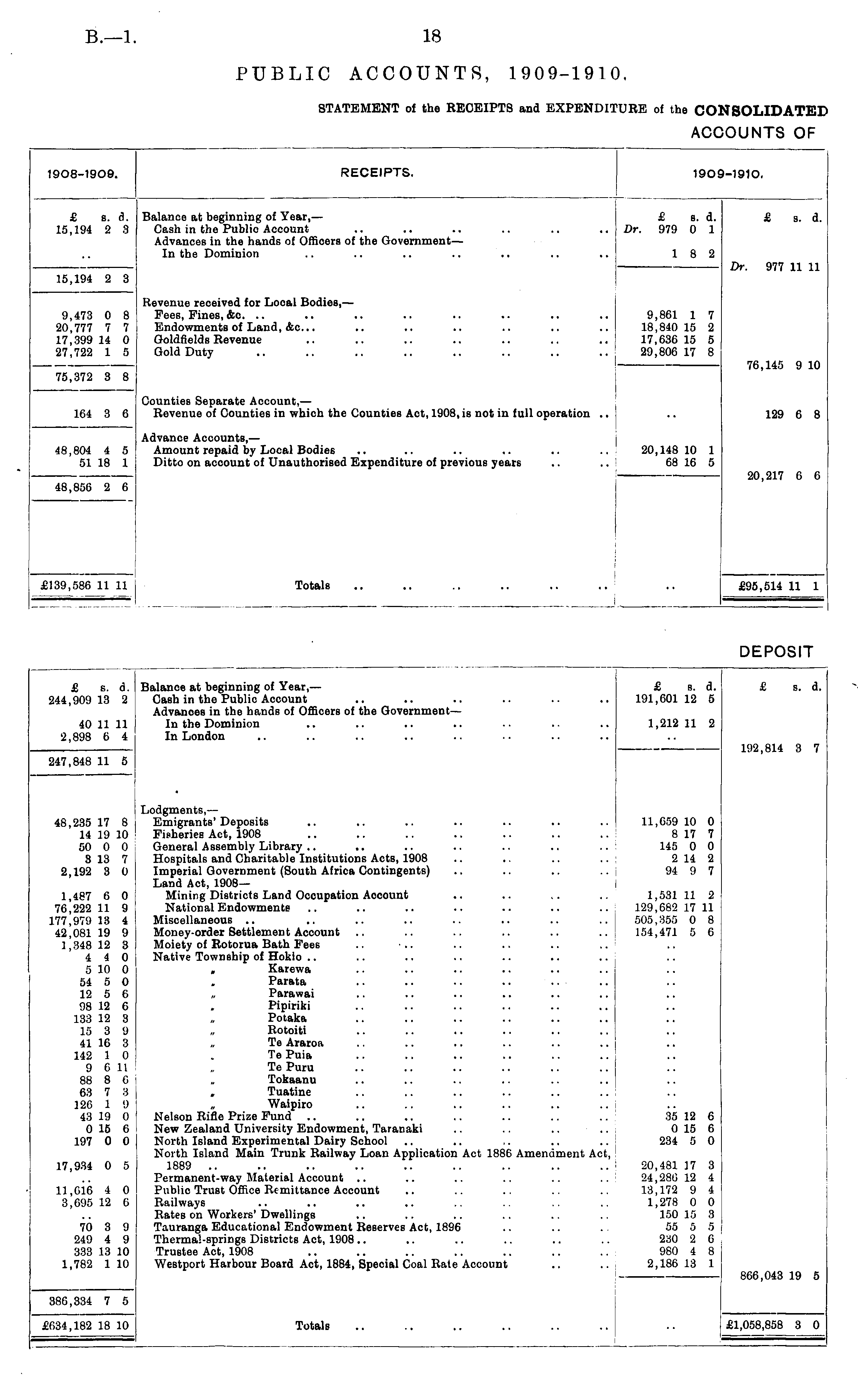 AC OUNTS OF 1908-1909. RECEIPTS. 190 |-1910. £ s. d. 15,194 2 3 Balance at beginning of Year, — Cash in the Public Account Advances in the hands of Officers of the Government— In the Dominion Dr. £ s. d. 979 0 1 18 2 Dr. £ s. d. . 977 11 11 15,194 2 3 Revenue received for Local Bodies, — Fees, Fines, &c. .. Endowments of Land, <fec.. Goldfields Revenue Gold Duty 9,473 0 8 20,777 7 7 17,399 14 0 27,722 1 5 75,372 3 8 9,861 1 7 18,840 15 2 17,636 15 5 29,806 17 8 76,145 9 10 Counties Separate Account, — Revenue of Counties in which the Counties Act, 1908, is not in full operation .. 129 6 8 164 3 6 48,804 4 5 51 18 1 Advance Accounts, — Amount repaid by Local Bodies Ditto on account of Unauthorised Expenditure of previous years 20,148 10 1 68 16 5 20,217 6 6 48,856 2 6 Totals £139,586 11 11 £95,514 11 1 DEPOSIT £ s. d. 244,909 13 2 Balance at beginning of Year, — Cash in the Public Account Advances in the hands of Officers of the Government— In the Dominion In London £ s. d. 191,601 12 5 1,212 11 2 £ s. d. 40 11 11 2,898 6 4 192,814 3 7 247,848 11 5 48,235 17 8 14 19 10 50 0 0 3 13 7 2,192 3 0 1,187 6 0 76,222 11 9 177,979 13 4 42,081 19 9 1,348 12 3 4 4 0 5 10 0 54 5 0 12 5 6 98 12 6 133 12 3 15 3 9 41 16 3 142 1 0 9 6 11 88 8 6 63 7 3 126 1 9 43 19 0 0 15 6 197 0 0 Lodgments,— Emigrants' Deposits Fisheries Act, 1908 General Assembly Library .. Hospitals and Charitable Institutions Acts, 1908 Imperial Government (South Africa Contingents) Land Act, 1908— Mining Districts Land Occupation Account National Endowments Miscellaneous Money-order Settlement Account Moiety of Rotorua Bath Fees Native Township of Hokio .. . Karewa Parata Parawai Pipiriki Potaka Rotoiti Te Araroa Te Puia Te Puru Tokaanu , Tuatine Waipiro Nelson Rifle Prize Fund New Zealand University Endowment, Taranaki .. .. .. North Island Experimental Dairy School North Island Main Trunk Railway Loan Application Act 1886 Amendment Act, 1889 .. Permanent-way Material Account Public Trust Office Remittance Account Railways Rates on Workers' Dwellings Tauranga Educational Endowment Reserves Act, 1896 Thermal-springs Districts Act, 1908 .. Trustee Act, 1908 Westport Harbour Board Act, 1884, Special Coal Rate Account 11,659 10 0 8 17 7 145 0 0 2 14 2 94 9 7 1,531 11 2 129,682 17 11 505,355 0 8 154,471 5 6 35 12 6 0 15 6 234 5 0 20,481 17 3 24,286 12 4 13,172 9 4 1,278 0 0 150 15 3 55 5 5 230 2 6 980 4 8 2,186 13 1 17,934 0 5 11,616 4 0 3,695 12 6 70 3 9 249 4 9 333 13 10 1,782 1 10 866,043 19 5 386,334 7 5 Totals £634,182 18 10 £1,058,858 3 0