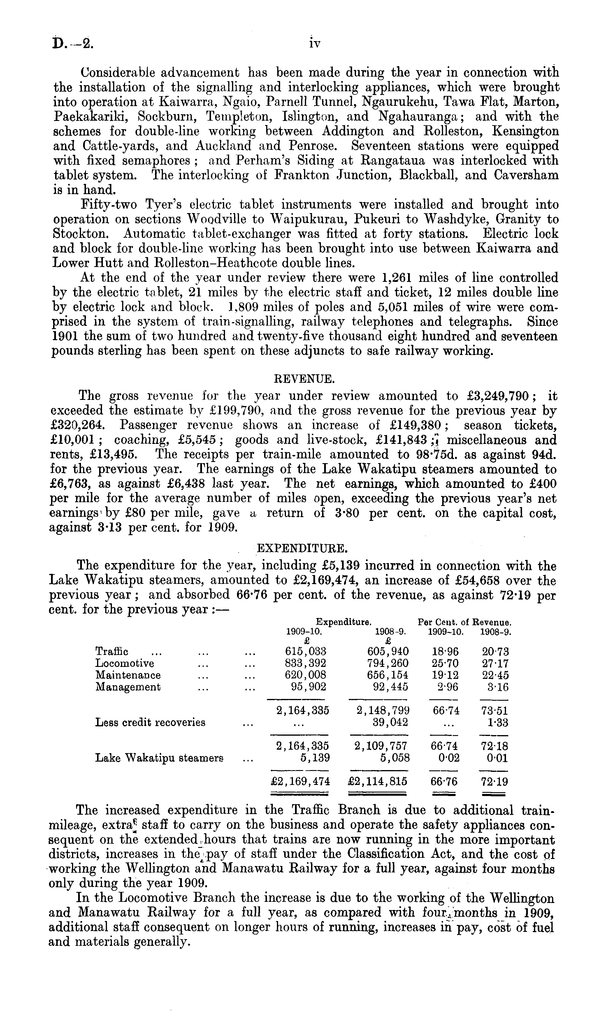 Considerable advancement has been made during the year in connection with the installation of the signalling and interlocking appliances, which were brought into operation at Kaiwarra, Ngaio, Parnell Tunnel, Ngaurukehu, Tawa Flat, Marton, Paekakariki, Sockburn, Templeton, Islington, and Ngahauranga; and with the schemes for double-line working between Aldington and Rolleston, Kensington and Cattle-yards, and Auckland and Penrose. Seventeen stations were equipped with fixed semaphores ; and Perham's Siding at Rangataua was interlocked with tablet system. The interlocking of Frankton Junction, Blackball, and Caversham is in hand. Fifty-two Tyer's electric tablet instruments were installed and brought into operation on sections Woodville to Waipukurau, Pukeuri to Washdyke, Granity to Stockton. Automatic tablet-exchanger was fitted at forty stations. Electric lock and block for double-line working has been brought into use between Kaiwarra and Lower Hutt and Rolleston-Heathcote double lines. At the end of the year under review there were 1,261 miles of line controlled by the electric tablet, 21 miles by the electric staff and ticket, 12 miles double line by electric lock and block. 1,809 miles of poles and 5,051 miles of wire were comprised in the system of train-signalling, railway telephones and telegraphs. Since 1901 the sum of two hundred and twenty-five thousand eight hundred and seventeen pounds sterling has been spent on these adjuncts to safe railway working. REVENUE. The gross revenue for the year under review amounted to £3,249,790; it exceeded the estimate by £199,790, and the gross revenue for the previous year by £320,264. Passenger revenue shows an increase of £149,380; season tickets, £10,001 ; coaching, £5,545 ; goods and live-stock, £141,843 ;] miscellaneous and rents, £13,495. The receipts per train-mile amounted to 98 - 75 d. as against 94d. for the previous year. The earnings of the Lake Wakatipu steamers amounted to £6,763, as against £6,438 last year. The net earnings, which amounted to £400 per mile for the average number of miles open, exceeding the previous year's net earnings •by £80 per mile, gave a return of 3'Bo per cent, on the capital cost, against 3-13 per cent, for 1909. EXPENDITURE. The expenditure for the year, including £5,139 incurred in connection with the Lake Wakatipu steamers, amounted to £2,169,474, an increase of £54,658 over the previous year; and absorbed 66-76 per cent, of the revenue, as against 7219 per cent, for the previous year : — Expenditure. Per Cent, of Revenue. 1909-10. 1908-9. 1909-10. 1908-9. £ £ Traffic ... ... ... 615,033 605,940 18-96 2073 Locomotive ... ... 833,392 794,260 25-70 27-17 Maintenance ... ... 620,008 656,154 19-12 22-45 Management ... ... 95,902 92,445 2-96 3-16 2,164,335 2,148,799 66-74 7351 Less credit recoveries ... ... 39,042 ... 1-33 2,164,335 2,109,757 6674 72-18 Lake Wakatipu steam ere ... 5,139 5,058 002 001 £2,169,474 £2,114,815 66-76 72-19 The increased expenditure in the Traffic Branch is due to additional trainmileage, extra* staff to carry on the business and operate the safety appliances consequent on the extended hours that trains are now running in the more important districts, increases in of staff under the Classification Act, and the cost of working the Wellington and Manawatu Railway for a full year, against four months only during the year 1909. In the Locomotive Branch the increase is due to the working of the Wellington and Manawatu Railway for a full year, as compared with fourVmonths in 1909, additional staff consequent on longer hours of running, increases in pay, cost of fuel and materials generally.