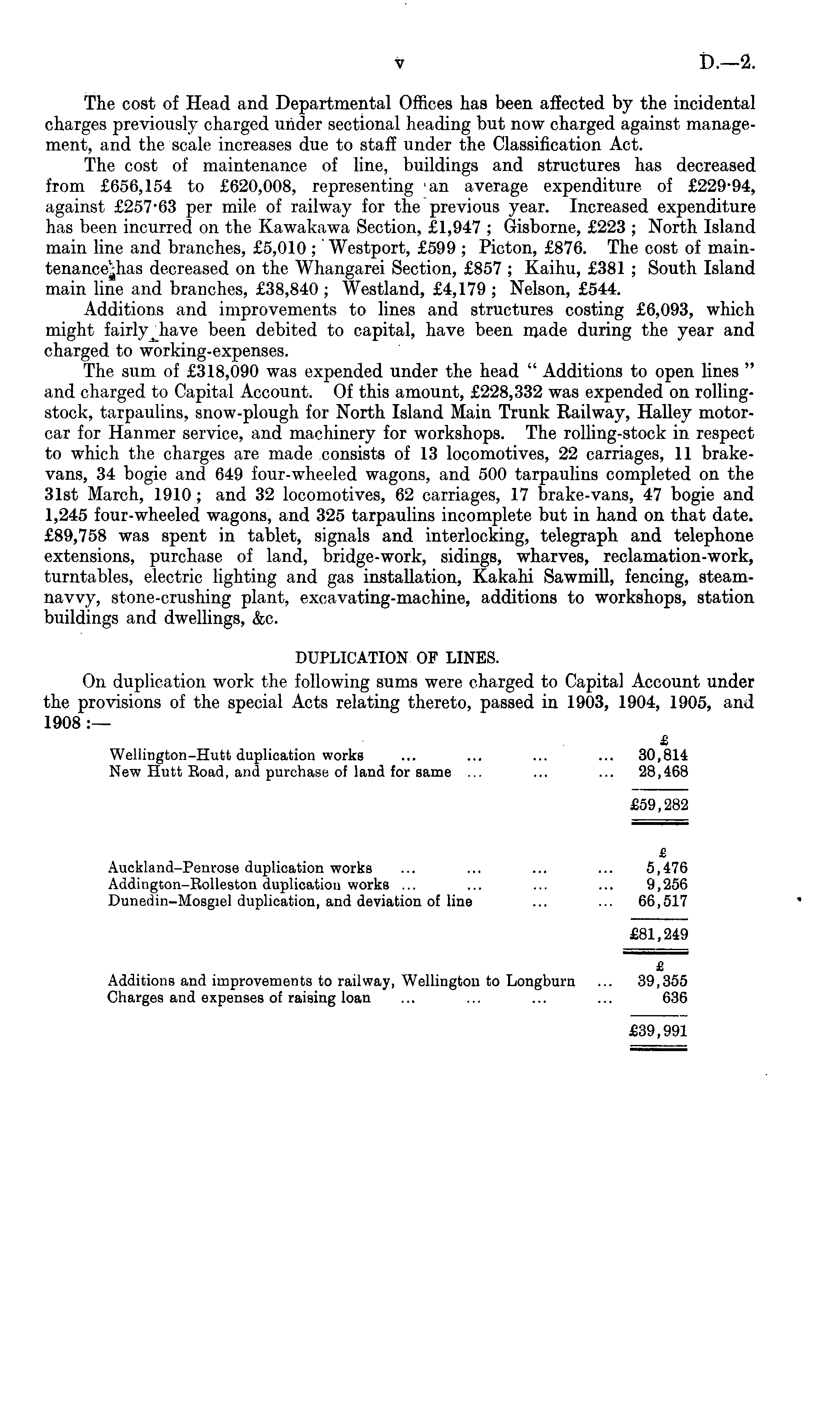 The cost of Head and Departmental Offices has been affected by the incidental charges previously charged under sectional heading but now charged against management, and the scale increases due to staff under the Classification Act. The cost of maintenance of line, buildings and structures has decreased from £656,154 to £620,008, representing an average expenditure of £229-94, against £257-63 per mile of railway for the previous year. Increased expenditure has been incurred on the Kawakawa Section, £1,947 ; Gisborne, £223 ; North Island main line and branches, £5,010 ; Westport, £599 ; Picton, £876. The cost of maindecreased on the Whangarei Section, £857 ; Kaihu, £381 ; South Island main line and branches, £38,840 ; Westland, £4,179 ; Nelson, £544. Additions and improvements to lines and structures costing £6,093, which might been debited to capital, have been made during the year and charged to working-expenses. The sum of £318,090 was expended under the head " Additions to open lines " and charged to Capital Account. Of this amount, £228,332 was expended on rollingstock, tarpaulins, snow-plough for North Island Main Trunk Railway, Halley motorcar for Hanmer service, and machinery for workshops. The rolling-stock in respect to which the charges are made consists of 13 locomotives, 22 carriages, 11 brakevans, 34 bogie and 649 four-wheeled wagons, and 500 tarpaulins completed on the 31st March, 1910; and 32 locomotives, 62 carriages, 17 brake-vans, 47 bogie and 1,245 four-wheeled wagons, and 325 tarpaulins incomplete but in hand on that date. £89,758 was spent in tablet, signals and interlocking, telegraph and telephone extensions, purchase of land, bridge-work, sidings, wharves, reclamation-work, turntables, electric lighting and gas installation, Kakahi Sawmill, fencing, steamnavvy, stone-crushing plant, excavating-machine, additions to workshops, station buildings and dwellings, &c. DUPLICATION OF LINES. On duplication work the following sums were charged to Capital Account under the provisions of the special Acts relating thereto, passed in 1903, 1904, 1905, and 1908 :— £ Wellington-Hutt duplication works ... ... ... ... 30,814 New Hutt Eoad, and purchase of land for same ... ... ... 28,468 £59,282 £ Auckland-Penrose duplication works ... ... ... ... 5,476 Addington-Bolleston duplication works ... ... ... ... 9,256 Dunedin-Mosgiel duplication, and deviation of line ... ... 66,517 £81,249 £ Additions and improvements to railway, Wellington to Longburn ... 39,355 Charges and expenses of raising loan ... ... ... ... 636 £39,991
