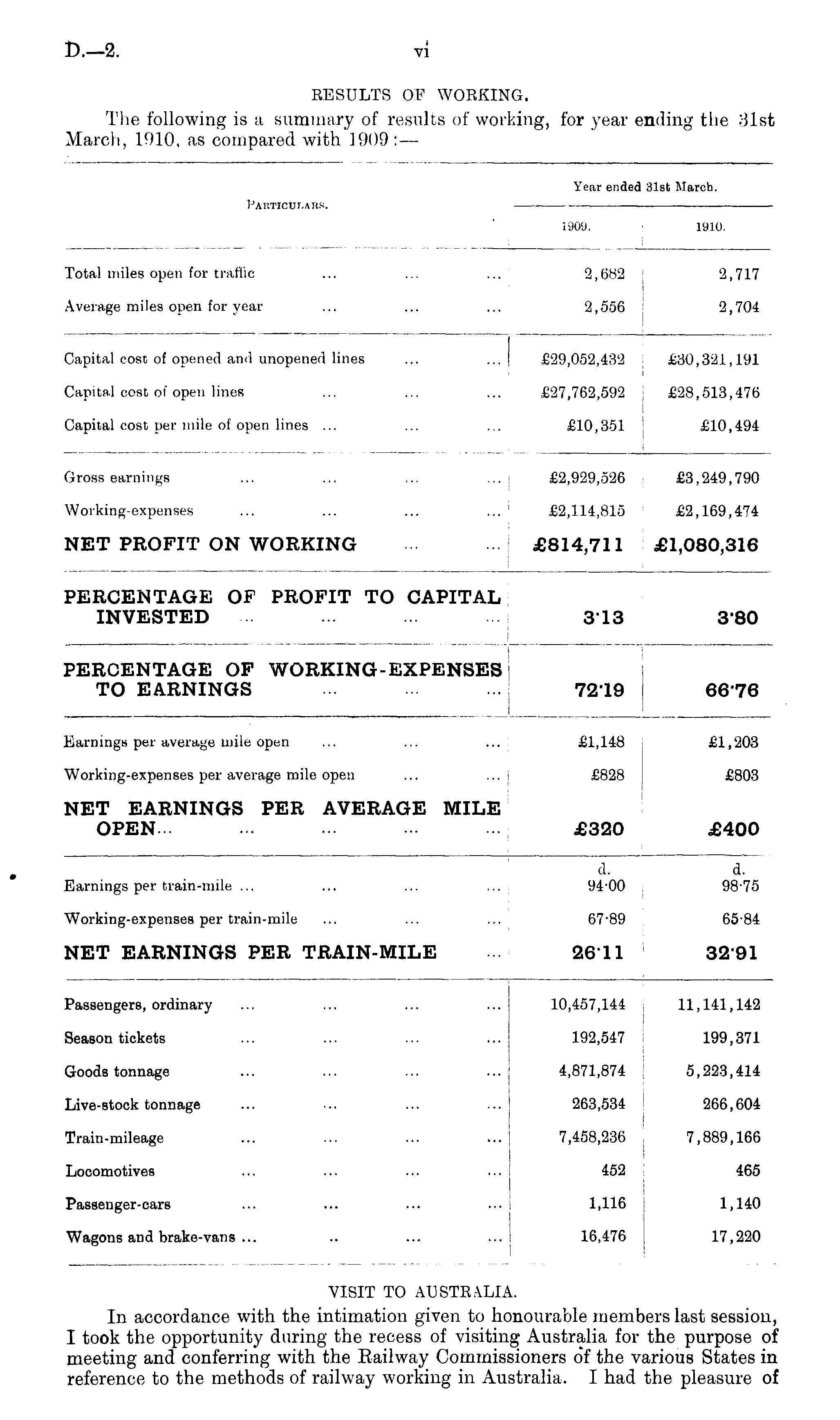 VISIT TO AUSTRALIA. In accordance with the intimation given to honourable members last session, I took the opportunity during the recess of visiting Australia for the purpose of meeting and conferring with the Railway Commissioners of the various States in reference to the methods of railway working in Australia. I had the pleasure of