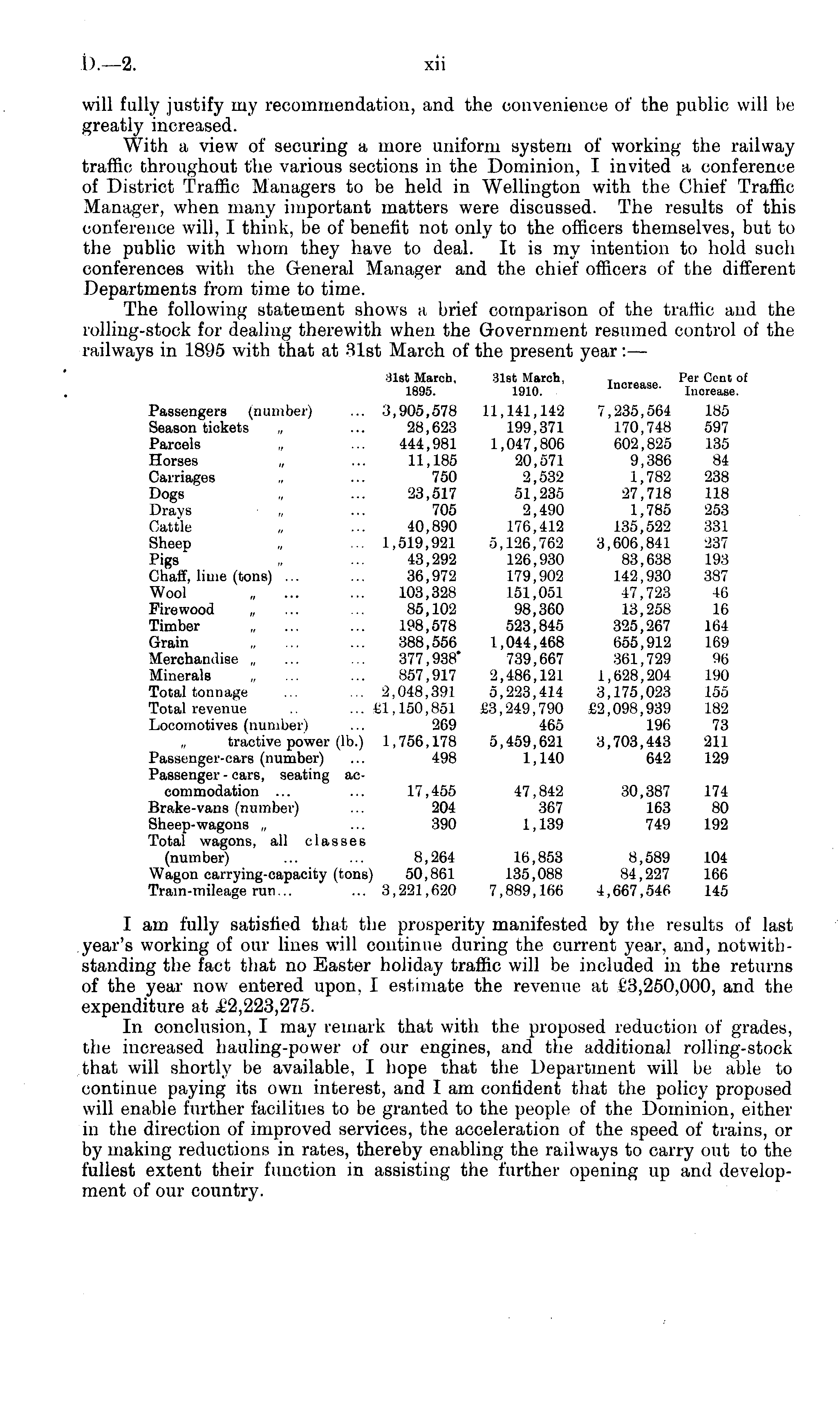 will fully justify my recommendation, and the convenience of the public will be greatly increased. With a view of securing a more uniform system of working the railway traffic throughout the various sections in the Dominion, I invited a conference of District Traffic Managers to be held in Wellington with the Chief Traffic Manager, when many important matters were discussed. The results of this conference will, I think, be of benefit not only to the officers themselves, but to the public with whom they have to deal. It is my intention to hold such conferences with the General Manager and the chief officers of the different Departments from time to time. The following statement shows a brief comparison of the traffic and the rolling-stock for dealing therewith when the Government resumed control of the railways in 1895 with that at 81st March of the present year:— 31st March, 31st March, T Per Cent of 1895. 1910. increase. Increase Passengers (number) ... 3,905,578 11,141,142 7,235,564 185 Season tickets „ ... 28,623 199,371 170,748 597 Parcels „ ... 444,981 1,047,806 602,825 135 Horses „ ... 11,185 20,571 9,386 84 Carriages „ ... 750 2,532 1,782 238 Dogs „ ... 23,517 51,235 27,718 118 Drays • „ ... 705 2,490 1,785 253 Cattle „ ... 40,890 176,412 135,522 331 Sheep „ ... 1,519,921 5,126,762 3,606,841 237 Pigs „ ... 43,292 126,930 83,638 193 Chaff, lime (tons) ... ... 36,972 179,902 142,930 387 Wool ... 103,328 151,051 47,723 46 Firewood „ ... ... 85,102 98,360 13,258 16 Timber ... 198,578 523,845 325,267 164 Grain „ ... ... 388,556 1,044,468 655,912 169 Merchandise ... 377,938' 739,667 361,729 96 Minerals „ ... ... 857,917 2,486,121 1,628,204 190 Total tonnage ... ... 2,048,391 5,223,414 3,175,023 155 Total revenue .. ....£1,160,851 £3,249,790 £2,098,939 182 Locomotives (number) ... 269 465 196 73 tractive power (lb.) 1,756,178 5,459,621 3,703,443 211 Passenger-cars (number) ... 498 1,140 642 129 Passenger - cars, seating accommodation ... ... 17,455 47,842 30,387 174 Brake-vans (number) ... 204 367 163 80 Sheep-wagons „ ... 390 1,139 749 192 Total wagons, all classes (number) ... ... 8,264 16,853 8,589 104 Wagon carrying-capacity (tons) 50,861 135,088 84,227 166 Train-mileage run... ... 3,221,620 7,889,166 4,667,546 145 I am fully satisfied that the prosperity manifested by the results of last year's working of our lines will continue during the current year, and, notwithstanding the fact that no Easter holiday traffic will be included in the returns of the year now entered upon. I estimate the revenue at £3,250,000, and the expenditure at £2,223,275. In conclusion, I may remark that with the proposed reduction of grades, the increased hauling-power of our engines, and the additional rolling-stock that will shortly be available, I hope that the Department will be able to continue paying its own interest, and I am confident that the policy proposed will enable further facilities to be granted to the people of the Dominion, either in the direction of improved services, the acceleration of the speed of trains, or by making reductions in rates, thereby enabling the railways to carry out to the fullest extent their function in assisting the further opening up and development of our country.