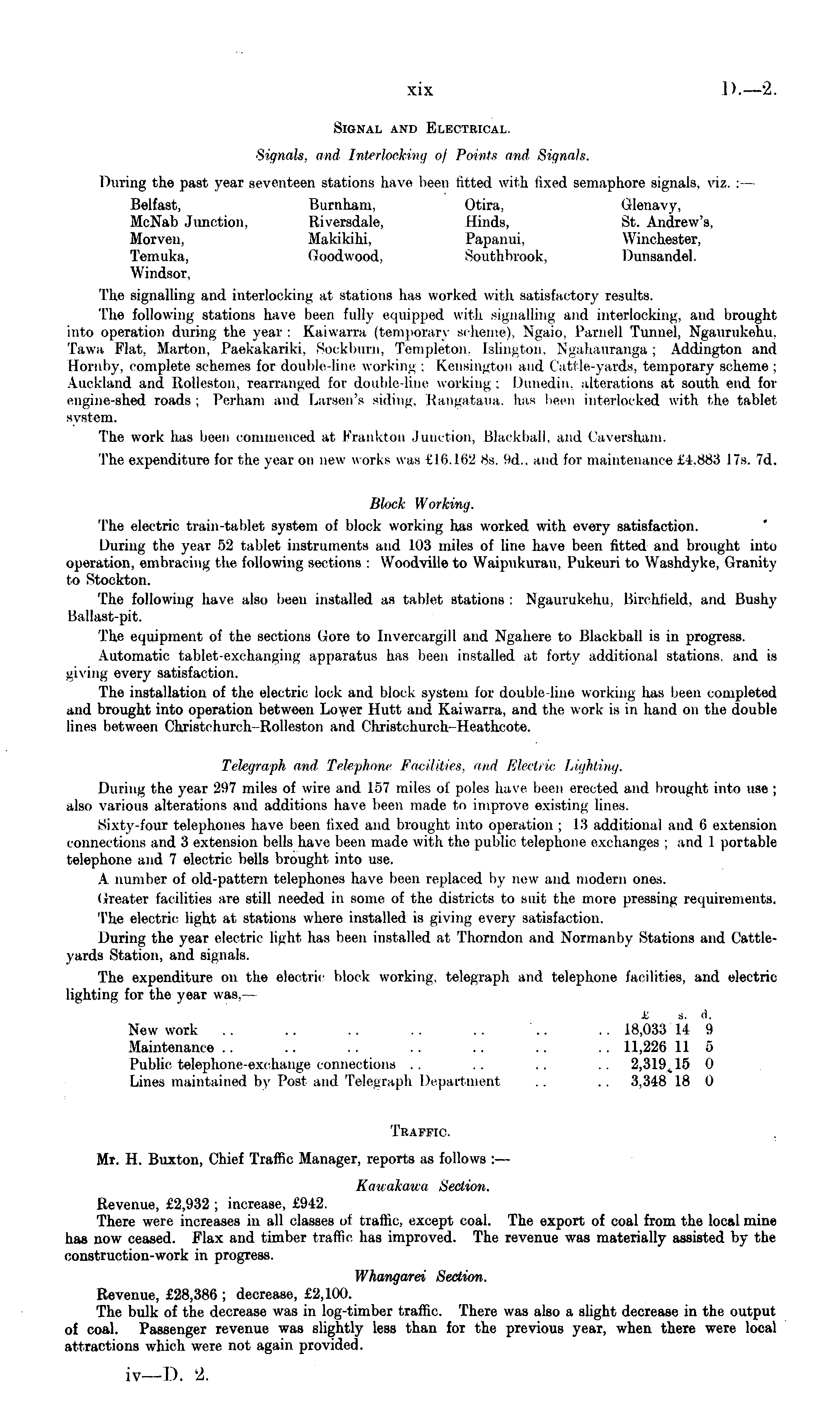 Signal and Electrical. Signals, and Interlocking of Points and Signals. During the past year seventeen stations have lieen fitted with fixed semaphore signals, viz. : — Belfast, Burnham, Otira, Glenavy, McNab Junction, Hiversdale, Hinds, St. Andrew's, Morveu, Makikihi, Papanui, Winchester, Temuka, I'oodwood, Southbrook, Dunsandel. Windsor, The signalling and interlocking at stations has worked with satisfactory results. The following stations have been fully equipped with signalling and interlocking, and brought into operation during the year : Kaiwarra (temporary scheme), Ngaio, I'arnell Tunnel, Ngaurukehu. Tawa Flat. Marton, Paekakariki, Sockbuin, Templeton, [slington, Ngahauranga ; Addington and Hornby, complete schemes for double line working ; Kensington and Cattle-yards, temporary scheme : Auckland and Rolleston, rearranged lor double line working : Dunedin. alterations at south end for engine-shed roads; Perham and Larsen's eiding, Rangataua interlocked with the tablet system. The work has been commenced at Frankton Junction, Blackball, and Caveisham. The expenditure for the year on new works was £16, 11>2 Bs. 9d., and for maintenance £4.883 17s. 7d. Block Working. The electric train-tablet system of block working has worked with every satisfaction. During the year 52 tablet instruments and 103 miles of line have been fitted and brought into operation, embracing the following sections : Woodvilleto Waipukurau, Pukeuri to Washdyke, Granity to Stockton. The following have also been installed as tablet stations : Ngaurukehu, Birchfield, and Bushy Ballast-pit. The equipment of the sections Gore to Invercargill and Ngahere to Blackball is in progress. Automatic tablet-exchanging apparatus has been installed at forty additional stations, and is giving every satisfaction. The installation of the electric lock and block system for double-line working has been completed and brought into operation between Lower Hutt and Kaiwana, and the work is in hand on the double lines between Christchurch-Rolleston and Christchurch Beathcote. Telegraph «m/ T</<-/>li<)n, Facilities, <in<l Electric Lighting. During the year 2U7 miles of wire and 157 miles of poles have been erected and brought into use; also various alterations and additions have been made to improve existing lines. Sixty-four telephones have been fixed and brought into operation ; 13 additional and 6 extension connections and 3 extension bells have been made with the public telephone exchanges : and 1 portable telephone and 7 electric bells brought into use. A number of old-pattern telephones have been replaced by new and modern ones. Greater facilities are still needed in some of the districts to suit the more pressing requirements. The electric light at stations where installed is giving every satisfaction. During the year electric light has been installed at Thorndon and Norman by Stations and Cattleyards Station, and signals. The expenditure on the electric block working, telegraph and telephone facilities, and electric lighting for the year was, — a b. <). New work .. .. .. .. .. .. .. 18,033 14 9 Maintenance.. .. .. .. .. .. .. 11,226 11 5 Public telephone-exchange connections .. .. .. .. 0 Lines maintained by Post and Telegraph Departmeni .. .. 3,348 18 0 Traffic. Mr. H. Buxton, Chief Traffic Manager, reports as follows :— Kawakaua Section. Revenue, £2,932 ; increase, £942. There were increases in all classes of traffic, except coal. The export of coal from the local mine has now ceased. Flax and timber traffic has improved. The revenue was materially assisted by the construction-work in progress. Whangarei Section. Revenue, £28,386 ; decrease, £2,100. The bulk of the decrease was in log-timber traffic. There was also a slight decrease in the output of coal. Passenger revenue was slightly less than for the previous year, when there were local attractions which were not again provided.