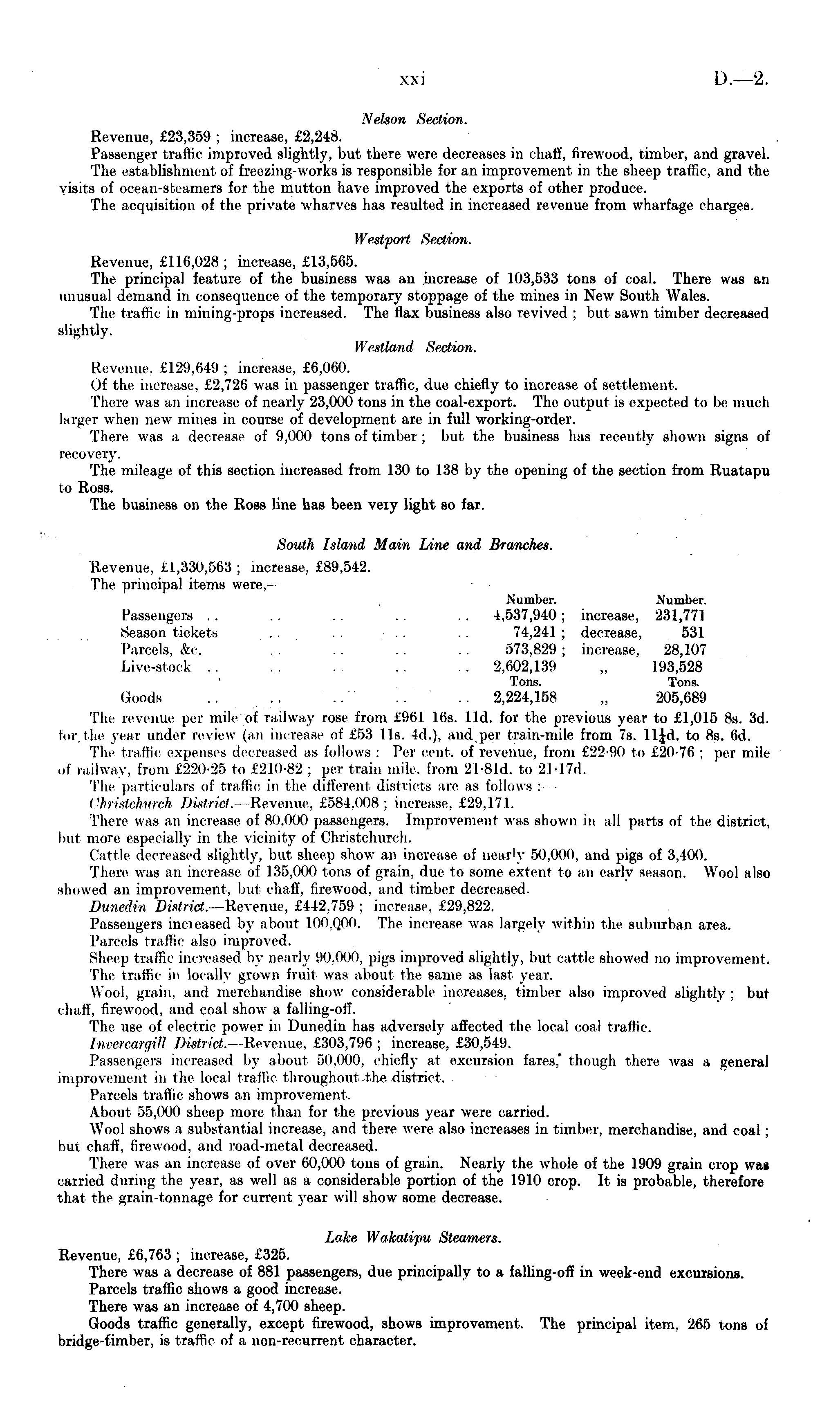 Nelson Section. Revenue, £23,359 ; increase, £2,248. Passenger traffic improved slightly, but there were decreases in chaff, firewood, timber, and gravel. The establishment of freezing-works is responsible for an improvement in the sheep traffic, and the visits of ocean-steamers for the mutton have improved the exports of other produce. The acquisition of the private; wharves has resulted in increased revenue from wharfage charges. Westport Section. Revenue, £116,028 ; increase, £13,565. The principal feature of the business was an increase of 103,533 tons of coal. There was an unusual demand in consequence of the temporary stoppage of the mines in New South Wales. The traffic in mining-props increased. The Wax business also revived ; but sawn timber decreased slightly. fVestland Section. Revenue, £129,649; increase, £6,060. Of the increase, £2,726 was in passenger traffic, due chiefly to increase of settlement. There was an increase of nearly 23,000 tons in the coal-export. The output is expected to be much larger when new mines in course of development are in full working-order. There was a decrease of 9,000 tons of timber ; but the business has recently shown signs of recovery. The mileage of this section increased from 130 to 138 by the opening of the section from Ruatapu to Ross. The business on the Ross line has been veiy light so far. South Island Main Line and Branches. Revenue, £1,330,563 ; increase, £89,542. The principal items were. Number. Number. Passengers . . .. . . .. . . 4,537,940; increase, 231,771 Season tickets .. .. .. .. 74,241 ; decrease, 531 Parcels, &c. . . .. . . .. 573,829 ; increase, 28,107 Live-stock .. .. .. . . .. 2,602,139 „ 193,528 Tons. Tons. Goods .. .. .. .. .. 2,224,158 „ 205,689 'The revenue per mile of railway rose from £!)(>! 16s. lid. for the previous year to £1,015 Bs. 3d. for,the year under review (an increase (if £53 lls. Id.), and per brain-mile from 7s. lljd. to Bs. 6d. The traffic expenses decreased as follows : Pel rent, of revenue, from £22*90 to £20-76; per mile of cailway, from £220:25 to £210-82 : per train mile, from 21-81 d. to 2117 d. The particulars of traffic in the different districts are as follows : Christchurch District. Revenue, £584,008; increase, £29,171. There was an increase of 80,000 passengers. Improvement was shown in all parts of the district, luit more especially in the vicinity of Christchurch. Cattle decreased slightly, l>ut sheep show an increase of nearly 50,000, and pigs of 3,400. There was aii increase of 135,000 tons of grain, due to some extent to an early season. Wool also showed an improvement, bul chaff, firewood, and timber decreased. Dunedin District.—Revenue, £442.759 ; increase, £29,822. Passengers increased by about 100.Q00. The increase was largely within the suburban area. Parcels t raffic also improved. Sheep traffic increased by nearly 90,000, pigs improved slightly, but cattle showed no improvement. The traffic in locally grown fruit was about the same as last year. Wool, grain, and merchandise show considerable increases, timber also improved slightly ; but ehan I . firewood, and coal show a falling-off. The use of electric power in Dunedin has adversely affected the local coal traffic. Invercargill District. Revenue, £303,796 ; increase, £30,549. Passengers increased by about 50,000, chiefly at excursion fares' though there was a general improvemeni in the local traffic throughout the district. Parcels traffic shows an improvement. About 55,000 sheep more than for the previous year were carried. Wool shows a substantial increase, and there were also increases in timber, merchandise, and coal; bul chaff, firewood, and road-metal decreased. There was an increase of over 60,000 tons of grain. Nearly the whole of the 1909 grain crop wan carried during the year, as well as a considerable portion of the 1910 crop. It is probable, therefore that the grain-tonnage for current year will show some decrease. Lake, WakatijM Steamers. Revenue, £6,763 ; increase, £325. There was a decrease of 881 passengers, due principally to a falling-off in week-end excursions. Parcels traffic shows a good increase. There was an increase of 4,700 sheep. Goods traffic generally, except firewood, shows improvement. The principal item. 265 tons of bridge-timber, is traffic of a non-recurrent character.
