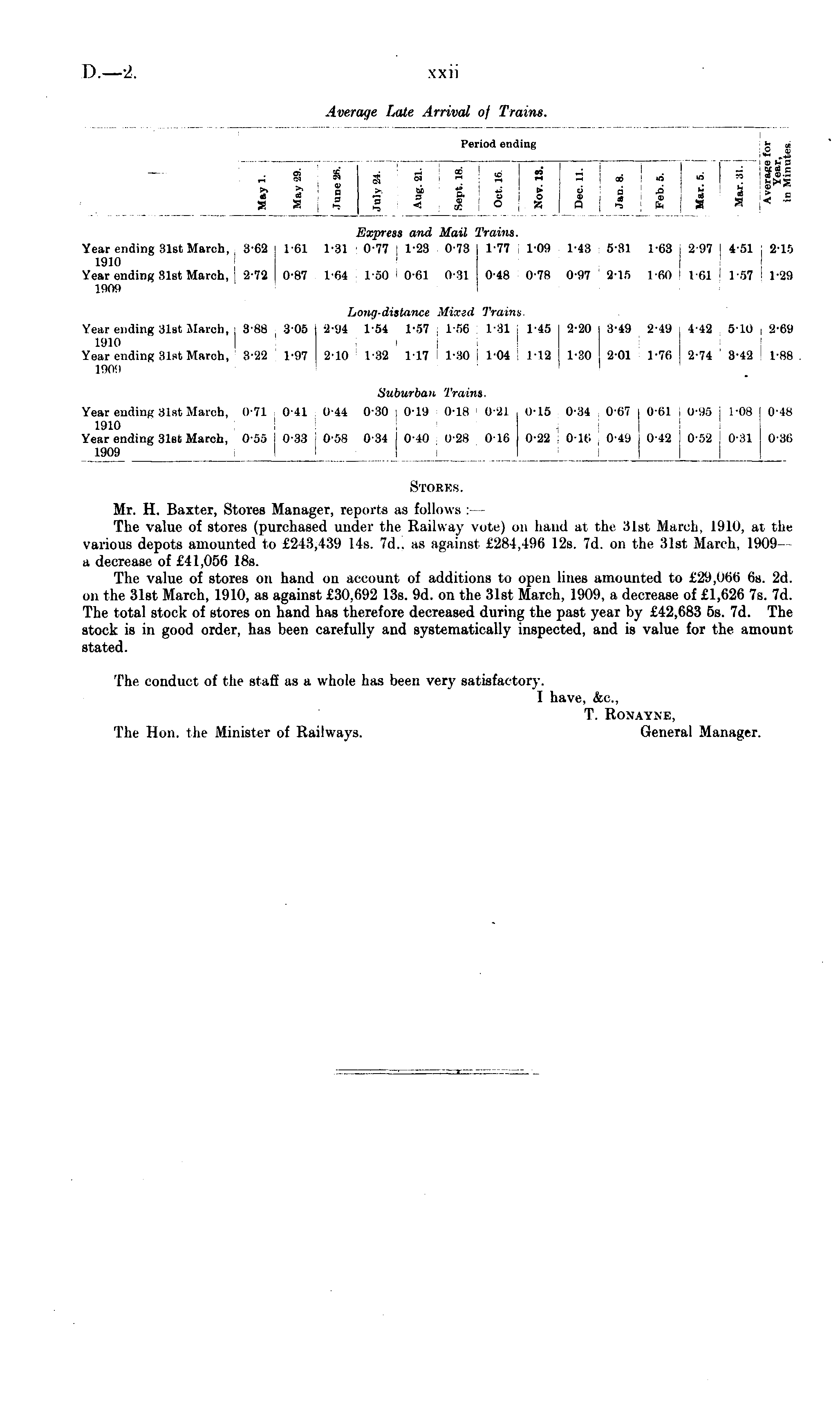 Storks. Mr. H. Baxter, Stores Manager, reports as follows : — The value of stores (purchased under the Railway vote) on hand at the 31st March, 1910, ai the various depots amounted to £243,439 14s. 7d.. as against £284,496 12s. 7d. on the 31st March, 1909--a decrease of £41,056 18s. The value of stores on hand on account of additions to open lines amounted to £29,066 6s. 2d. on the 31st March, 1910, as against £30,692 13s. 9d. on the 31st March, 1909, a decrease of £1,626 7s. 7d. The total stock of stores on hand has therefore decreased during the past year by £42,683 ss. 7d. The stock is in good order, has been carefully and systematically inspected, and is value for the amount stated. The conduct of the staff as a whole has been very satisfactory. I have, &c., T. RONAYNE, The Hon. the Minister of Railways. General Manager.
