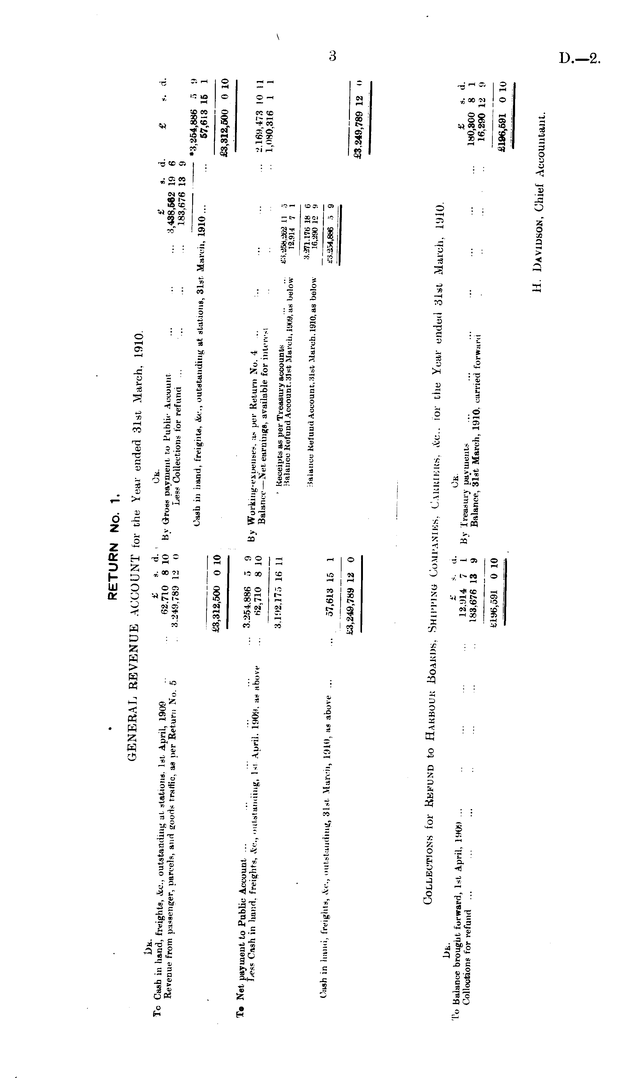RETURN No. 1. GENERAL REVENUE ACCOUNT for the Year ended 31st March. 1910 To Oash in hand, freights, &c., outstanding at stations, let April 1909 B »L tk (i ° Kp ~ ... £9.v. £ « d Revenue from p !W . enger , parcel,, and 2 oocts ,™ffio. „ ~erVtur, No. 6 3 -49 789 1- 0 * !9 6 °— * a '' OJ »- " Collections ior refund ... ... 183 676 13 1 oaBh "' ijl "i<l, freights, &c., outetaiiding at stations, 31st March, 1910... . 15 1 £3,312,500 0 10 £3,312,500 0 10 Tβ Net payment to Public Account ... ... ... .. 3,2541886 5 9 Lees Cash in hand, freights, 4c., outstanding, Ist April, 1909, ac above '" "ri2710 8 10 By rkiu g- e JP eneee . » per Return No. 4 ... :.. ... ~ ]fi ... ... "«."» »J" Balance— Net earnings, available for interesi '" " , iS'JIJ , , 3,192,175 16 11 ' Keceiiits as per Treasury accounts ... £; , ~gu ~m i, s balance Kefund Account. :«Bt.Mdrch,iy(J9, as below "if.'sH 7 1 :Jalancc Refund Account, aist .March. 1910, as below 12 9 Cash in hand, freights, &c., ouUtaudiug, 31et March, 1910, as above ... ... 57,613 15 1 .> 1 t3,249,789 12 0 £3.249,789 12 0 Oouaom for Kkkund to Habbouk Boabdb, Shaping Gompaniks, Cakki XK k Si fa., for the Year ended 31*t March. 1910. LV> Balance brougut forward, Ist April. l'.IO!! .. ~™, S . ,n,Kf- . ,i Collections for refund ... ■ ,«!««,i .By Ireasury paymente IsOSOO 8 1 9 Balance, 31st March, 1910. carried fo.-w.uM •' "_ - jg , *s J t1y6,591 0 10 £196,591 0 10 H. Davidson, Chief Accountant.