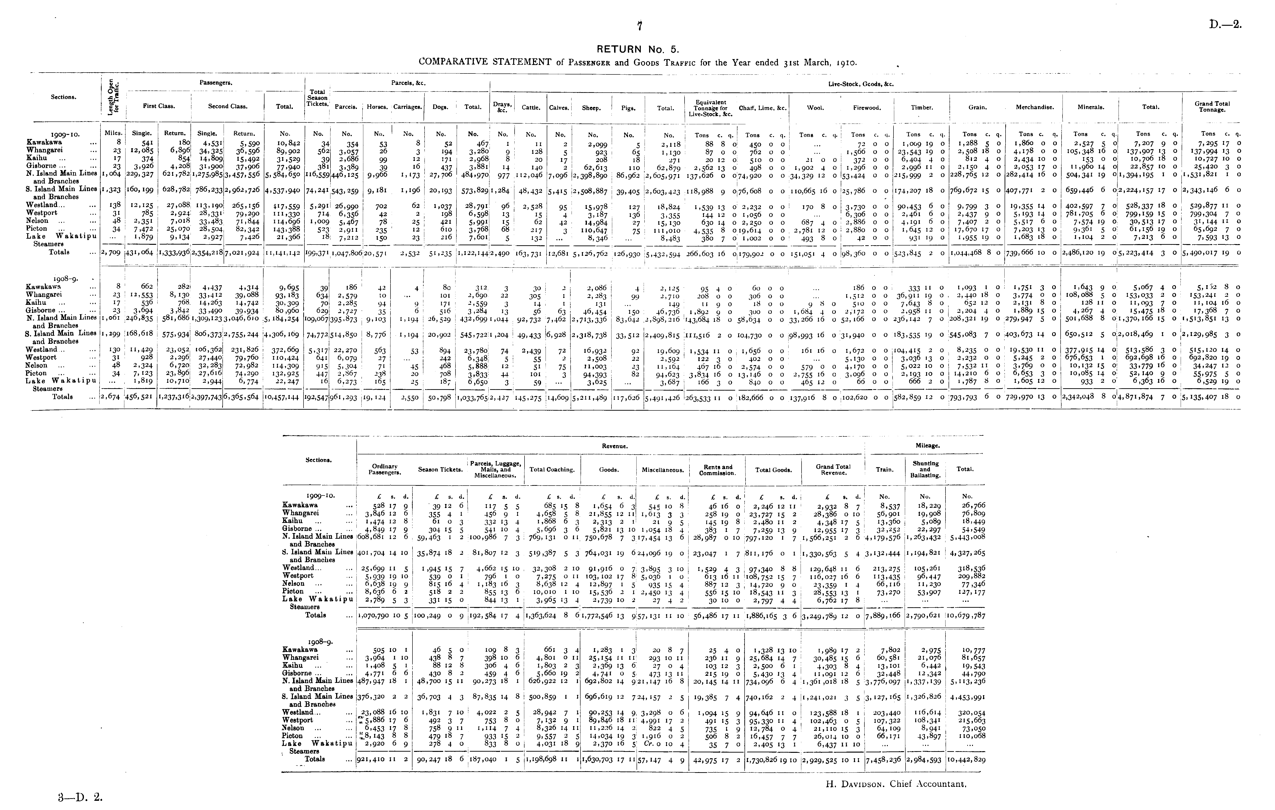 Sections. First Class. Passengers. Second Class. Total Season Tickets. Parce|s _ Horses. Carriages. Dogs. Parcels, &c. Equivalent Calves. Sheep. Pigs. Total. Tonnage for Chaff, Lime, &c. Wool. Firewood. Live-Stock, &c. No. No. No. No. Tons c. q. Tons c. q. Tons c. q. ! Tons c. q. 2 2,099 5 2,118 88 8 o 450 00 ... 72 o o 5 923 i 65 1,130 87 o o 762 o o ... 1,566 o o 17 2O8 18 27I 1 20 12 O. 510 0 0 21 O 0 372 O O 2 62,613 110 62,879 2,562 13 O 498 O O 1,902 4 O 1,296 O O 7,096 2,398,890 86,962 [2,605,971 137,626 O 074,920 O O 34,329 12 O 53,424 O 0 5,415 2,508,887 ■ 39,405 2,603,423 118,988 9 Oj76,6o8 0 o 110,665 16 o 25,786 o o Lire-Stock, Goods, &c. t , , Grand Total Total - Tonnage. Total. Total. D £? s ' Cattle. Timber. Grain. Merchandise. Minerals. I 1909-10. Kawakawa Whangarei Kaihu Gtisborne ... N. Island Main Lines and Branches S. Island Main Lines and Branches Westland... Westport Nelson Pieton Lake Wakatipu Steamers Totals Miles. 8 23 17 23 1,064 Single. 541 12,085 374 3,926 229,327 Return. Single. 180 4,531 6.896 34,325 854 14,809 4,208 31,900 621,7821,275,985 Return. 5.590 36,596 15.492 37.9O6 3.457.556 No. 10,842 89,902 31.529 77.940 5,584,650 No. No. 34 354 562 3,057 39 2,686 381 3,389 446.125 No. ' 53 26 99 39 9.966 No. No. 8 52 3 194 12 171 16 4^ 1,173 27,706 No. j No. No. 467 I 11 3,280 .1 128 2,968 8 20 3.881 14 140 484,970 977 112,046 Tons c, q. 1,009 S 9 o 23.543 !9 O 6,404 4 0 2,996 11 o 215,999 2 O Tons c. q. I,288 5 O 2,508 18 o 812 4 o 2,150 4 o 228,765 12 O Tons c. q. 1,860 o O 4,178 O O 2,434 10 o 2,053 17 o 282,414 16 o Tons c. q. 2,527 s o 105,348 16 o 153 o 0 11,960 14 o: 504.341 19 o Tons c. q. Tons c. q. 7,207 9 o 7,295 17 o 137.907 13 o 137.994 13 o 10,706 18 o 10,727 10 o 22,857 Io ° 25,420 3 o 1.394.195 1 o ,1,531,821 1 o 2,224,157 17 o 12,343,146 6 o 1.323 160,199 628,782 786,233 2,962,726 4.537.940 74.241 543.259 9,181 1,196 20,193 573,8291,284 48,432 28,791: 96 ! 2,528 6.598| 13 15 5>99i| 15 62 3,768; 68 217 7,601 5 132 174,207 18 o 769,672 15 o 407,771 2 O 659,446 6 o 138 3i 48 34 12,125 785 2,351 7 .472 1,879 27,088: 113,190 2,924] 28,331^ 7.OI8 33,483 25,070 28,504 9,134 2,927 265,156 79,290 71,844 82,342 7.426 +17.559 m>330 114,696 143,388 21,366 5,291! 26,990 7H 6,356 1,009 5.467 523 2,911 18: 7,212 702 42 78 235 150 62 : 1,037 2 198 25 ; 421 12 610 23 216 95 15.978 I 127 18,824 1,539 13 o : 2,232 00: 170 8 o 3,730 o o 4 3,187 136 3,355 144 12 o 1,056 o o ... 6,306 o o 42 14,984 27 15,130 630 14 o 2,250 o o 687 4 o 1 2,886 0 o 3 110,647 75 111,010 4,535 8 019,614 o o 2,781 12 o I 2,880 o o 8,346 ... 8,483 380 7 o 1,002 o o ' 493 8 o I 42 o o 90,453 6 o 2,461 6 o 4,191 6 o 1,645 I2 o 931 19 o 9.799 3 o 2,437 9 o 7.407 2 o 17,670 17 o 1.955 '9 o 19.355 14 O 5.193 14 O 5.SI7 6 o 7,203 13 o 1,683 18 o 402,597 7 o 781,705 6 o; 7.574 19 o. 9.361 5 o 1,104 2 o' 528,337 18 o 529.877 11 o 799.159 15 o 799.304 7 o 30,513 17 o ! 31,144 11 o 61,156 19 o 65,692 7 o 7,213 6 o 7,593 13 o 2,709 431,064 1.333.9362,354,218 7,021,924 11,141,142 199.371 1,047,806 20,571 2,532 5L235 1,122,1442,490 163,731 12,681 5,126,762 126,930 5,432,594 266,603 16 o o 151,051 4 o 98,360 o o 523,845 2 o 1,044,468 8 o 739,666 10 o 2,486,120 19 05,223,414 3 o s.490,017 19 o 1908-9. Kawakawa Whangarei Kaihu Gisborne ... N. Island Main Lines and Branches S. Island Main Lines and Branches Westland .. Westport Nelson Pieton Lake Wakatipu Steamers Totals 8 662 23 ".553 17 536 23 3.694 1,061 1246,835 1,299 168,618 282 4,437 4,314 9,695 8,130 33.412 39,088 93.183 768. 14,263 14.742 ! 30.309 3,842 33,490 39,934 80,960 581,686 1,309,1233,046,610 5, 184,254 575.934 806,3732,755,244 4,306,169 39 634 70 629 109,067 74,772 186 42 2,579 10 2,285 94 2.727 : 35 395.873 9.103 514,850 8,776 4 80 101 9 171 6 516 1,194 26,529 1,194 20,902 53 894 242 45 468 20 708 -5 187 3«2 3 30 2 2,690 22 305 1 2,559 3 14 1 3.284 13 56 ! 63 432,6991,044 92,732 7,462 545.7221.204 49,433(6,928 23.780 74 2,439 72 6.348 5 55 5.888 12 51 75 3.833 44 101 3 6,650 3 59 I 2,086 2,283 131 46,454 2.713.336 2,318.738 t I 4 2,125 95 4 o 60 o o ... 186 o o I 333 11 o 1,093 ' ° i>751 3 o 99 2,710 208 o o 306 o o ... 1,512 o o 36,911 19 o , 2,440 18 o 3,774 o o 149 11 9 o 18 o o 980 510 o o 7,643 8 0 652 12 o 2,131 8 o 150 : 46,736 1,892 90 100 o o 1,684 4 o 2,172 o o 2,958 11 o 2,204 4 o 1,889 15 o 83,642 ,2,898,216 '143,684 18 o 58,634 o o 33,266 16 o 52,166 o o 236,142 7 o 208,321 19 o 279,947 5 o 33,512 2,409,815 1111,516 2 o 104,730 o o 98,993 16 o 31,940 0 o 183,535 19 o !545>o83 7 o 403,673 14 o . 1,643 9 o 5.067 40! 5,152 8 o 108,088 5 o 153.033 2 o ; 153,241 2 o 128 11 o 11,093 7 ° 11,104 16 o 4,267 4 o 15.475 l8 o 17,368 7 o 501,688 8 01,370,166 15 o 1,513,851 13 o 650,512 5 0,2,018,469 1 o (2,129,985 3 o 377,915 14 o; 513.586 3 o 515.120 14 o 676,653 1 o 692,698 16 o I 692,820 19 o 10,132 15 o 33>779 16 o ! 34.247 12 o 10,085 14 o 52,140 9 o 55.975 5 o 933 2 o 6,363 16 o , 6,529 19 o 130 11,429 31 928 48 2,324 34 7. 123 ... , 1,819 23,052 106,362 231,826 372,669 2,296! 27,440 79,760 110,424 6,720 32,283 72,982 : 114,309 23,896 27,616 74.290 132,925 10,710 2,944 6,774 I 22,247 5.317 641 915 447 16 22,270 563 6,079 ; 27 5.304 i 7 1 2,867 238 6,273 i 165 16,932 2,508 11,003 94.393 3.625 92 19,609 j 1,534 11 o ; 1,656 00' 161 16 0 1,672 0 o .104,415 2 o 8,235 o o 19,530 11 o 22 2,592 I 122 3 o 402 o o ... 5.130 o o 3,036 13 o 2,232 o o 5,245 2 o 23 11,164 i 467 16 o 2,574 o o 579 o 0 4,170 o o 5,022 10 o 7>53 2 11 o : 3,769 o o 82 94,623 3,834 16 o 13,146 o o 2,755 l6 o 3,096 o o 2,193 10 o 14,210 6 o 6,653 3 o 3,687 [66 3 o 840 00 465 12 o 66 0 o • 666 2 o ',787 8 o 1,605 12 o 2,674 456,521 1,237.316 2,397.743 6,365.564 '0,457.144 192,547 961,293 19,124 2,55° 50.798 ".033,7652,4*7 145.275 [14.609 5,211,489 117,626 5,491,426 263,53311 o 182,666 o o 137,916 8 o 102,620 o o 582,859 12 o J793.793 6 o 729.970 13 o 2,342,048 8 04,871,874 7 o 5,135,40718 o __t___ Revenue. Mileage. Sections. Ordinary Passengers. Parcels, Lugg