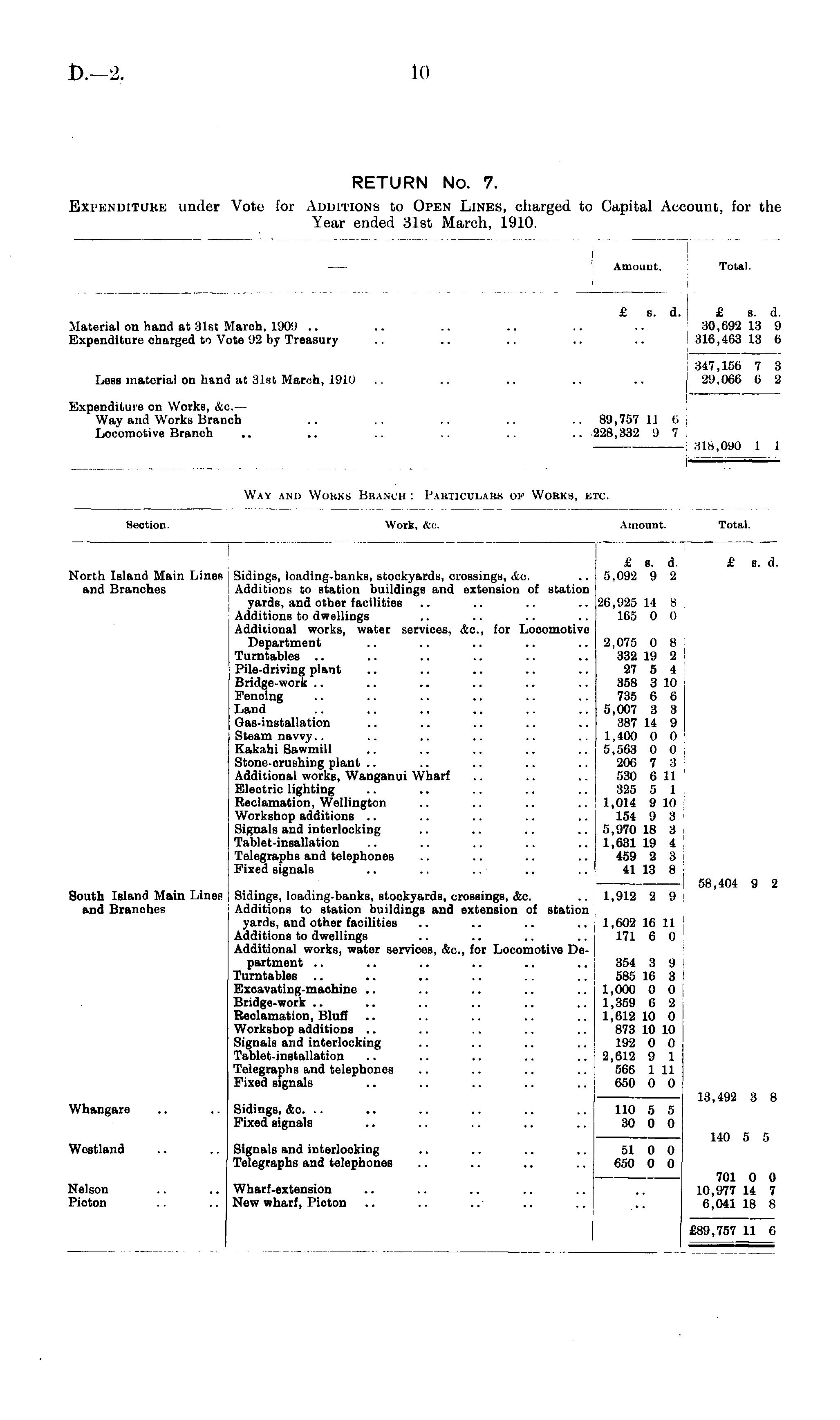 RETURN No. 7. Expenditure under Vote for Additions to Open Lines, charged to Capital Account, for the Year ended 31st March, 1910.