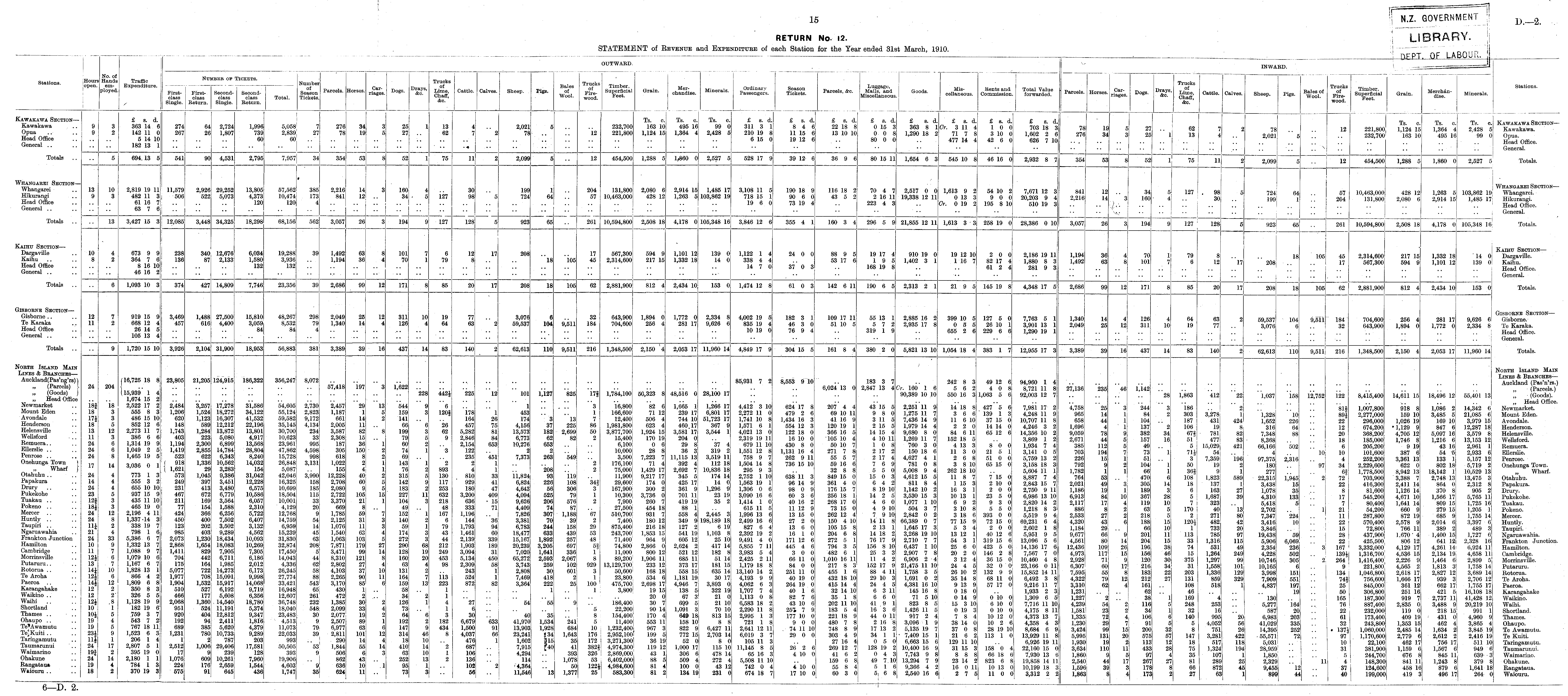 Stations. No. of Hours Hands open, employed. OUTWARD VINWARD. Traffic Kxjxmditure. Firstclass Single. Number op Tickets. First- Second- Secondclass class class Total. Kefeurn. Single. Return. Number of Season Tickets. Parcels. [Horses. Carriages. Dogs. Drays, &c. Trucks ot Lime, Chaff, &c. Cattle. Calves. Bales T ™? ks Timber, o' viL Superficial Wool. £S. Feet. I j [ rvnin Mer " : %Tir>oralR Ordiliarv Gra,m - chandise. M merals. p asBGngers . i 'l Parcels, &c. Mails, and \ ilckets - Miscellaneous. 1 i 1 Goods. Miscellaneous. Kents and Commission 1 Total Value forwarded. Car1 riages. Drays, &e. Trucks of Lime, Chaff, &c. Bales of Wool. Trucks Timber , Fire- Superficial Grain, wood. Poet - ...... Meretaan- ! diee. Minerals. Stations. Sheep. Pigs. Parcels. Horses. Doge. Cattle. Calves. Sheep. Pigs. ECawakawa Section— Kawakawa Opua Head Office General I) 9 3 2 £ s. d. 363 14 6 142 11 0 5 14 10 182 13 1 274 267 6< 21 2,724 1,807 1,996 739 60 5,058 2,839| 60 7 27 276 78 3' li 3 25 27 1 13 62 lj 75 ' 7 2,021 78 5 12 232,700 221,800 I Ts. c. Ts. c. Ts. c. £ s. d. 163 10 495 16 99 0 311 3 1 1,124 15 1,364 4 2,428 5 210 19 8| 6 15 0 Ts. 0. 163 10 1,124 15 £ s. d.l £ a. d. £ s. d. 8 4 6 22 18 8 0 15 3 11 15 6: 13 10 10 0 0 8] 19 12 6i .. 80 0 0 £ s. d. 22 18 8 13 10 10 £ s. d. 0 15 3 0 0 8 80 0 0 £ s. c 363 8 1,290 18 £ s. d. 363 8 1 1,290 18 2 d. £ s. c l\Or. 3 11 2 71 7 477 14 £ s. d. |O. 3 11 4 71 7 8 477 14 4 £ s. d. 10 0 3 10 0 42 6 0 £ s. d. 703 18 3 1,602 2 6 626 7 10 78 276 19 34 5 3 27 25 1 62 13 78 2,021 12 221,800 232,700' Ts. c. 1,124 15 163 10 Ts. c. 1,364 4 495 16 Ts. c. 2,428 5 9E> 0 Kawakawa Section— Kawakawa. Opua. Head Office. General. •« •■ Totals .. 5 694, 13 5 .541 90 4,531 2,795 7,957: 34 35' 53 r>2 Jl 2,099 12 454,500 1,288 5 1,860 2,527 528 17 9 39 12 6l 36 9 6 80 15 11 1,654 6 3 545 10 8 46 16 0 2,932 8 7 354 53 75 11 2,099 5 12 454,500 1,288 5! 1,860 0 2,527 5 Totals. iVhangakei Section - — Whangarei Hikurangi Head Office General 13 9 10 3 2,819 19 11 482 11 3l 61 16 7! 63 7 6 11,679 506 2,926 522 29,252 5,073 13,805 4,373 120 57,562 10,474: 120] 1 385 173 4 2,216 841 14 12 3 160 34 4 5 127 301 98 19! 72' 1 64 204 57 131,800 10,463,000 2,080 6 428 12 2,914 15 1,263 5 1,485 17 103,862 19 3,108 11 5 718 15 1 19 6 0 190 18 9 90 6 0 73 19 41 116 18 2 43 5 2 70 4 7 2 16 11 223 4 3 2,517 0 0 19,338 12 11 1,613 9 2 0 13 3 Or. 0 19 2 54 10 2 9 0 0 195 8 10 7,671 12 3 20,203 9 4 510 19 3 841 2,216 1! 1. 34 160 5 4 127 98 30; 5! 724i 199 (14 1 67 204 10,463,000 131,800: 428 12 2,080 6 1,263 5! 2,914 16 103,862 19 1,485 17 Whattoarei Section — Whangarei. Hikurangi. Head Office. General. 5 3! I - •■ / ■• •• I Totals 13 3,427 15 3 12,085 3,448 34,325 18,298 68,156 r>112 3,057 26 104 127 128 :i2;( 2(il 10,594,800; 2,608 18 4,178 0 105,348 16 3,846 12 6 355 4 l! 160 3 4 296 5 9| 21,855 12 11 1,613 3 3 258 19 28,386 0 10 3,057 21) 194 127 128 923i 2lil 10,594,800j 2,508 18 4,178 0 105,348 16: Totals. Saihu - Section— Dargaville Kaihu Head Office General 10 8 4 2 673 9 9 364 7 6 8 16 10 46 16 2 23! 131 340, 87| 12,676 2,133 6,034 1,580 132 19,288 3,936 132 39 1,492 1,194 63 36 101 70 7 1 6 79 12 8 17 208 "11 " io; 17 45 567,300! 2,314,600! 594 9 217 15 1,101 12| 1,332 18 139 0 14 0 1,122 1 4| 338 4 4 14 7 0 24 0 0 88 9 5 53 17 6 19 17 4 1 1 9 5| 168 19 8 910 19 0 1,402 3 1 19 12 10 1 16 7 2 0 0 82 17 4 61 2 4 2,186 19 11 1,880 8 3' 281 9 3 1,194: 1,492 36 63 4 8 70 101 1 7 79 6 8! 12 18 105 45 17 2,314,600 567,300 217 15 594 9 1,332 18 1,101 12 ' 14 0! 139 0 Kaihtj Section — Dargaville. Kaihu. Head Office. General. 37' 0 3 "l7 208' .. I I Totals .. 1,093 10 3 37' 127 14,809 7,746 23,356 :« 2,686 99 171 85 20 17 20b 10; 62 2,881,900 812 4 2,434 10 153 0 1,474 12 8 61 0 3 142 6 11 190 6 2,313 2 1 21 9 5 145 19 8 4,348 17 5 2,681 9!) 12 171 85 20 17 20S 18 IK 112 2,881,900 812 4 2,434 10 153 0! Totals. Gisborne Section— Gisborne Te Karaka Head Office General 12 11 7 2 919 15 9 668 12 4 26 14 5 105 13 4 3,469 457 1,488 616 27,500 4,400! 15,810 3,059 84 48,267 8,532 84 29S 79 4 2,049 1,340 28 14 12 4 311 126 li 19 64 77 63 3,076 59,537 9,511 32 1S4 643,900 704,600; 1,894 0 256 4 1,772 0 281 17 2,334 8 9,626 6 4,002 19 5! 835 19 4; 10 19 0 182 3 1 46 3 0 76 9 4 109 17 11 51 10 5 55 13 1 5 7 2 319 1 9 2,885 16 2 2,935 17 8 399 10 5 0 5 5 655 2 6 127 5 0 26 10 1 229 6 6 7,763 5 1 3,901 13 1 1,290 19 1 1,34( 2,04! 14 25 41 12 126; 311: 4 10 64 19 63 771 2 59,537' 3,076 104 6 9,511 184 32 704,601 643,901 256 4 1,894 0 281 17 1,772 0 9,626 6 2,334 8 GisBonNB Section — Gisborne. Te Karaka. Head Office. General. 2 10' ■• Totals .. 1,720 15 10 3,921 2,104 31,900 18,953 56,881 381 3,389 39 43' 83 140 62,613 111 9,511 216 l,348,500 : 2,150 4 2,053 17! 11,960 14 4,849 17 9 304 15 5 161 8 4 380 2 0 5,821 13 10 1,054 18 4 383 1 7 12,955 17 3 3,38! 39 16 437 14 83 140 62,613 110 9,511 210 1,348,500 2,150 4 2,053 17 11,960 14 Totals. *fORTH Island Main Lines & Branches— Auckland(Pas'ng'rs) j (Parcels) I (Goods) J Head Office Newmarket Mount Eden Avondale Henderson Helensville Wellsford Remuera Ellerslie Penrose Onehunga Town ) Wharf f Otahuhu Papakura Drury Pukekohe Tuakau Pokeno Mercer Huntly . . Taupiri Ngaruawahia Frankton Junction Hamilton Cambridge Morrinsville Putaruru Rotorua Te Aroha Paeroa .. Karangahake .. ] Waikino .. .. Waihi .. Shortland Thames Ohaupo .. Te^Awamutu Kuiti .. Taringamutu .. | Taumarunui Waimarino .. j Ohakune Rangataua Waiouru .. .. | 24 18f 18 17i 18 13 11 24 24 24 17 24 14 24 23 12? I8J 24 24 HI 21 24 10 11 12J 13 14.1m HI 12 12 12; 10 lOi 19 19 23 J Hi 24 19? 24 19 18 204 18 3 3 5 12 3 6 6 8 14 4 4 4 5 3 3 12 8 2 4 33 9 7 6 7 10 6 12 2 2' 8 1 5 4 5 9 1 17 2 14 2 (16,725 18 8 (15,939 1 4 1,674 15 2 2,522 17 2 555 8 3 486 15 10 852 12 6 2,273 11 7 386 6 6 1,314 19 9 1,049 2 5 1,465 19 5 3,036 0 1 773 1 3 555 3 2 655 10 10 937 15 9 435 11 10 465 19 0 2,196 4 11 1,337 14 3 338 19 7 798 1 6: 5,386 6 7 1,332 13 7 1,088 9 7 1,079