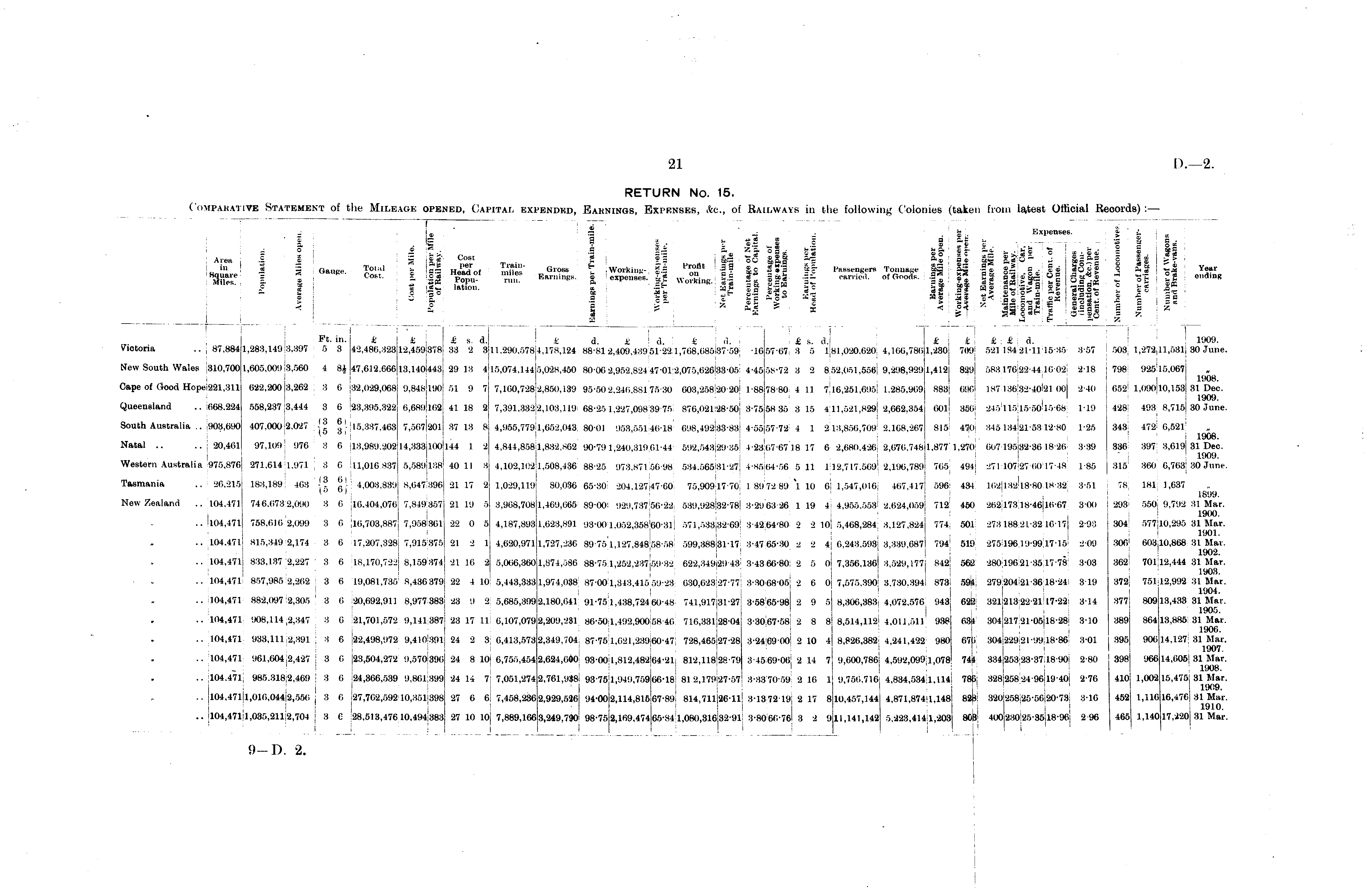 Comparative Statement of the Mileage opened, Capital expendkd, Earnings, Expenses, <fcc, of Railways in the following Colonies (taken from latest Official Kecords) :— ! '. £ |« a _: . Si Expenses. % i. i § ? i ■ S «3 J i % -i t I % !«■ Are. if Ms- <•■•- 1 u 3 Hi si I! j j! ag !&sP \l \uU \ § ! h : If '» 3 3 Gauge Total Z C| H £» T Gross Working- U V ™** = ? &S «l "I Paeeengere Tonnage || g| .S* »* g g< K|| 5 gj |4 Yew « I I Cost. £ Hg£ , ;Z s Baraingg j I expend || ||| Jjgjj j≤ carried, of GoX j |J | ■ || |||ggj 11| ||J| - j| || ending i -. i — - — Ft- 'n- £ £ 6 a d. £ d. i £ d. £ (I. £. s. d. t t t t d. 1909. Victoria .. 87,8841,283,149 3.397 5 3 42,486,32812,459878 33 2 811,290,578 4,178,124 88-81J2,409,489 l 51-22jl,768,686 8759 1657-67 3 5 181,020,620 1,166,7861,280 Ton 5-21 21-11 15-35 8-57 503 1,27211,581 80 June New South Wales- 310,7001.605.009 3,560 4 29 13 115,074,144 5,028,460 80-06 -2 95- 8-M 47-01 2 070 (126 33-05 4-4558'72 3 2 852,051,556 9,298,9291,412 829 583:176 22-44il602 218 798 925]l5,067 1908. Cape of Good Hope<221.311 (122.200 3,262 8 (i 32,029,068 9.848 190 51 9 7 7,160,728 2,850,139 95-50!2,246,881,75-80 603,258 20-20 188788o! 4 11 7 16,251,695 1,285,969 ss:; i,:.r, is? 13d32-40'-21 on 240 652 1,09010,158 81 Dec. 1909. Queensland ..668.224 568,287 3,444 3 6 28,895,322 6,689162 4118 2 7,391.3322,103,119 68-251.227,008 39 75 876,02128-50 3-7568 85 3 15 4 11,521,8-29 2,662,854 601 386 245 l 11515-50Jl5-68 119 428 198 8.715 30 June South Australia .. 908,690 407.000'2.027 |j 15.337.463 7.5(17201 37 13 8 4,965,7791,652,0*8 80-01 953,55l|4618 698,49283-88 4-5557-72 1 1 2jl3,856,709 2.168.267 815 470 34518421-53J12-80 125 343 : 472 6,521 Natal .. .. 20,461 97.loo 976 3 6 18,989,20214,883100144 1 2 4,844,8581,832,862 90-79;l,240,319;61-44 5'. 12.543 29 35 l-2867-67il8 17 6 2,680,426 2,676,748 1,87711,270 607195 82-36il8-26 3-89 33d 897 3.619 31 Dec. 1909. Western Australia 975,876: 271.614 1.1171 3 6 11,016837 5,589138 loll 8 1,102,1021,508,486 88-25 973,87ll56-98 584,56581-27 1-8564-56 5 11 112,717,569 2,196,789 765 V.t\ 271107 27(10 1718 1-85 315 360 6,763 30 Jutk Tasmania .. 2(1.215 183,189 168 '•' !." 1,008,889 8,647896 21 17 2 1,029,119 80.036 6580 204,12747-60 75,9091770 1 89 72 89 \ 10 61 1,547,016. 467,417 596 484 l62|l32|l8-80il8-82 3-51 7s 181 1,037 1 ' L899. New Zealand .. 104.471 746,6732,090 3 6 16.404.07(1 7,8491,857 21 19 5 3,968,7081,469,665 89-00! 929,78756-22 589,92882-78 3-21)63 26 1 19 4 4,955,553 2,624,059 712 450 26217318-4616-67 3-00 293 560 9,792i 31 Mat ionn 'oMPAKATIVE 8 STATEMENT Ol e a. d. 88 '2 811,290,578 1909. 503 1,27211,581 30 June. 29 18 t 15.074.144 798 '.125 15.067 1908. 652 1,090 10,158 81 Dec. 1909. 128 um 8,715 30 June. 51 9 7 7,160,728 41 18 2 7,391.332}' 37 18 8 4,955,779 343 172 6,521 1908. 336 897 3,619 31 Dec. L909. 815 360 6,768 30 June. 144 1 '2 4,844,858 40 1 1 8 1,102,102 21 17 '2 1,029,119 Ts 181 1,637 L899. 293 560 9,792 31 Mar. 1900. 304 577 10,295 81 Mar. 1901. 306 60310,868 31 Mar. 1902. 362 701 12.444 31 Mar. 1903. 372; 75112.992 31 Mar. 1904. 377 80913,433 31 Mar. 1905. 389 864 13,885 31 Mar. 1906. 395 906 14.127 31 Mar. 1907 398 96614.(105 31 Mar. 1908. 410J 1,002 15,475 31 Mar. 1909. 452 1,11616,476 81 Mar. 1910. 465 1,14017,120 81 Mar. 21 19 5 3,968,708 lyoo. .. 104,471 758,616 2.(11111 :: 6 16,703,887 7.958 361 22 0 5 4,187,8931,623,893 93-00il,052,858'60-81 571,58882-69 :!t204-8O 2 2 10 5.468,284 3.127.824 774 501 273 188 21-32 10-17 2-93 304 577 10.295 31 Mar 1901. .. 104.471 815,349 2,174 3 6 17.207.328 7,915875 21 2 1 4,620.9711.727,236 89-75,1,127,84858-58 599,3883117 3-47 65-30 2 2 4 6,248,598 3,339,687 794 519 27519619-99 17-15 2-09 306 60310,868 31 Mar 1 1902. .. 104,471 833,18712,227 3 6 18,170,722 8,159374 21 111 2 5.0(1(1.3(10 1.874,586 88-751,252,237 59-82 622,84929-43 S-4866'80 2 5 0 7,356,136 3,529,177 842 562 28019621-351778 3-03 362 701 12.444 31 Mar 1903. .. 104,471 857.985 2.262 3 6 19,081.735 8.43637! 22 I Hi 5,443,3831,974,088 87-001,348,415 59-23 630,6232777 3-30 68-0512 6 0 7,575.39013 730.394 873 594 279 204 21-3618-24 319 372 751 12.992 31 Mar 1904. .. 104.471 882,097 2.305 8 6 20,692,911 8,977 383 23 9 2 5,685,399 2.180,641 91-751.438,724 60-48 741,917131-27 3-58 65-98 2 9 5 8,306,388 4,072.576 943 622 82121822-21 17-22 3-14 377 80913,433 31 Mar 1905. .. 104,471 908,11412,347 3 6 21,701.572 9,141387 23 17 11 6,107,079 2,209,231 86-501.492,90058 46 716,38128-04 3-3067-58 2 8 8 8,514,112 4,011,511 938 (134 304 217 21-05:18-28 3-10 389 86413,885 31 Mai 190(1. .. 104,471 933,1112,391 3 6 B2,498,972 9,410'39l| 24 2 3 6,413,573 2,349.704 87-751.(121.239 60-47 728.46527-28 8-246900 2 10 4 8,826,882 4,241,422 980 671 304 22921-9918-86 3-01 395 90(> 14.127: 31 Mat 1907 .. 104,471 961,604 2,427 I 3 6 123,504,272 9,570396 24 8 1016,755,454 2.624,600 93-001,812,48264-211 812.1182879 3-4569-06 2 14 7 9,600,78614,592,0991,078 744 334 253 23-37 1890: 2-80 j 398 96614.(105 31 Miu 1908. .. 104.471 985.3182.Kill 3 6 24,366,539 9,861399 24 14 7 7,051,274 2,761,9*8 98751,949,75966-18 812,17927-57 :',-:!37O'59 2 16 1 9,756.716 ■ 4,884,5341.114: 786 328258-24-9619-40! 2-76 410 1,002 15,475: 31 Mai 1909. •• 104,4711,016,044 2,556 3 6 27,762,592)10,351398 27 6 6 7,458,236 2,929,526 94-00 2,114,815 67-8!) 814,71126-11 3-18|7219 2 17 810,457,144 4,871,874 1.148 828 320:258 25-50 20-73 8-16 462 1,11616,476 81 Mai : 1910. ..104,4711,035,211:2,704 3 C 28,513,476 10,494383 27 10 10J 7,889,166 3,249,790 98-752,169,47465-84:1,080,31632-91 3-8066-76 3 2 911,141,142 5.223,4141,203 803 40028025-3518-96 2 96 465 1,14017.220; 31 Mai 22 0 5 4,187,893 21 2 1 4,620,971 21 16 2 5,066,360 2-2 4 in 5,448,383 23 It 2 5,685,399 23 17 11 6,107,079 59a (1263 j 24 2 8 6,413,573 67 i 24 8 10J 6,755,454 74 •24 14 7: 7,051/274 i '27 C 6 7,458,236 78i 82( ; 27 10 lOj 7,889,166 80S