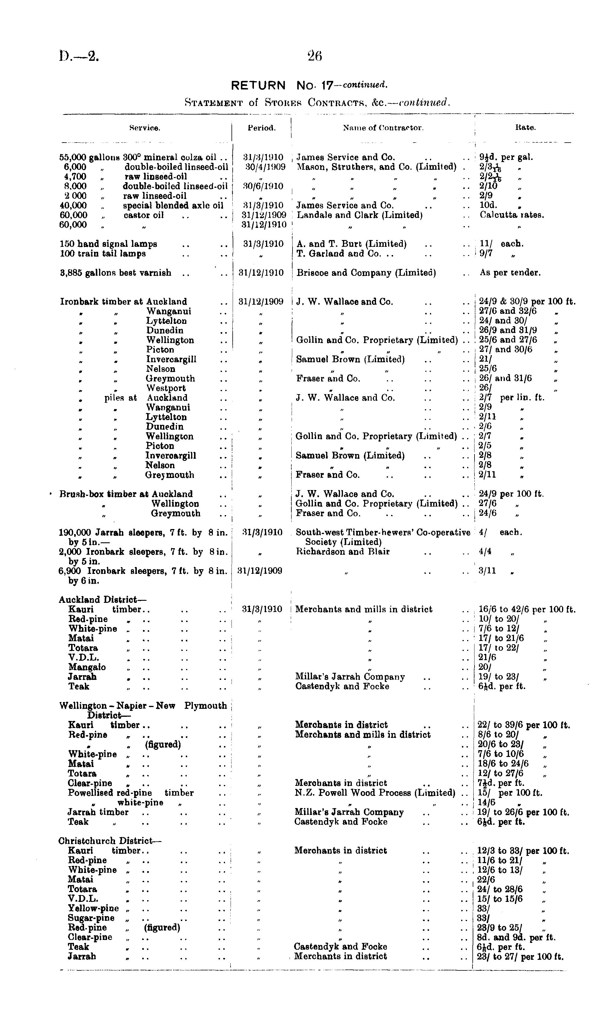 Service. Period. Name of Contractor. Kate. 55,000 gallotiH 300° mineral colza oil .. 31/8/1910 , James Service and Co. .. .. per gal. 6,000 „ double-boiled linseed-oil 80/4/1009 Mason, Struthers, and Co. (Limited) . 2/3^ 4,700 „ raw linseed-oil .. „ . . „ ... 2/2^ 8.000 , double-boiled linseed-oil 30/6/1910 „ „ „ ... 2/10 i 000 „ raw linseed-oil .. . . „ „ . . 2/9 40,000 ,. special blended axle oil 31/8/1910 James Service and Co. .. .. 10d. 60,000 ,. castor oil .. .. 31/12/1909 Landale and Clark (Limited) .. Calcutta lates. 60,000 „ „ 31/12/1910 1.50 hand signal lamps .. .. 31/3/1910 A. and T. Burt (Limited) .. ..11/ each. 100 train tail lamps * .. .. „ T. Garland and Co. .. .. 9/7 3,885 gallons best varnish .. .. 31/12/1910 Briscoe and Company (Limited) . As per tender. Ironbark timber at Auckland .. 31/12/1909 J. W. Wallace and Co. .. .. 24/9 & 30/9 per 100 ft. Wanganui ... „ .... 27/G and 32/6 Lyttelton .. , .... 24/and 30/ Dunedin ... . .... 26/9 and 31/9 Wellington .. „ Gollin and Co. Proprietary (Limited) .. 25/6 and 27/6 Picton .. „ . „ „ 27/ and 30/6 Invercargill .. . Samuel Brown (Limited) .. .. j 21/ Nelson .. . „ „ .. .. 25/6 Greymouth .. „ Fraser and Co. .. .. .. 26/ and 31/6 Westport .. . . .. .. ..26/ piles at Auckland .. . J. W. Wallace and Co. .. ..2/7 perlin. ft. Wanganui ... „ .... 2/9 „ Lyttelton .. . „ .. .. 2/11 Dunedin ... „ .... 2/6 „ Wellington ... ,. Gollin and Co. Proprietary (Limited) .. , 2/7 Picton .. J „ „ .. i 2/5 Inveroargill .. . Samuel Brown (Limited) .. .. 2/8 Nelson .. . „ „ .. .. 2/8 » „ Grejmouth .. „ Fraser and Co. .. .. .. 2/11 Brush-box timber at Auckland .. ., J. W. Wallace and Co. .. .. 24/9 per 100 ft » Wellington .. ,. j Gollin and Co. Proprietary (Limited) .. 27/6 „ Greymouth .. , ! Fraser and Co. .. .. .. 24/6 190,000 Jarrah sleepers, 7 ft. by 8 in. 31/3/1910 South-west Timber-hewers'Co-operative 4/ each. by 5 in.— Society (Limited) 2,000 Ironbark sleepers, 7 ft. by 8 in. . Richardson and Blair .. ..4/4 by 5 in. 6,900 Ironbark sleepers, 7 ft. by 8 in. 31/12/1909 „ .. .. 3/11 . by 6 in. Auckland DistrictKauri timber.. .. .. 31/3/1910 Merchants and mills in district .. 16/6 to 42/6 per 100 ft. Red-pine ........ . .. 10/ to 20/ White-pine .... .. .. .. . .. 7/6 to 12/ Matai ... .. .. „ . .. 17/ to 21/6 Totara „ .. .. .. ,. , .. 17/ to 22/ V.D.L. ......... . .. 21/6 Mangaio „......„ „ .. 20/ Jarrah ... .. .. ,. Millar's Jarrah Company .. .. 19/ to 23/ Teak „ .. .. .. „ Castendyk and Focke .. .. 6Jd. per ft. Wellington - Napier - New Plymouth District— Kauri timber .. .. .. „ Merchants in district .. .. 22/ to 39/6 per 100 (t. Red-pine „ .. .. .. .. Merchants and mills in district .. 8/6 to 20/ „ (figured) .... . .. 20/6 to 23/ White-pine „ .. .. .. , . .. 7/6 to 10/6 Matai ........ „ .. 18/6 to 24/6 „ Totara „ .. 12/to 27/6 Clear-pine „ .. .. „ Merchants in district .. . . 7£d. per ft. Powellised red-pine timber .. -- N.Z. Powell Wood Process (Limited) ..115/ per 100 ft. » white-pine „ „ „ 14/0 „ Jarrah timber .. .. .. ,. Millar's Jarrah Company .. . 19/ to 26/6 per 100 ft. Teak . .. .. .. „ Castendyk and Focke .. .. 6Jd. per ft. Christchurch DistrictKauri timber.. .. .. ., Merohants in district .. .. 12/3 to 33/per 100 ft. Red-pine „ .. .. .... „ .. . . 11/6 to 21/ White-pine „ .. .. .. .. „ .. .. 12/6 to 13/ Matai „ .. .. .. , . .. . . 22/6 Totara ... .. .. .. . .. .. 24/ to 28/6 V.D.L. ... .. .. J . . .. .. 15/ to 15/6 Yellow-pine „ .. .. .. „ . .. .. 33/ Sugar-pine „ .. .. .. , . .. ..33/ Red-pine „ (figured) .. „ „ .... 23/9 to 25/ Clear-pine „ .. .. .. ,. ,. .. .. 8d. and 9d. per ft. Teak ... .. .. .. Castendyk and Focke .. .. 6Jd. per ft. Jarrah ... .. .. » Merchants in district .. .. 23/ to 27/ per 100 ft.