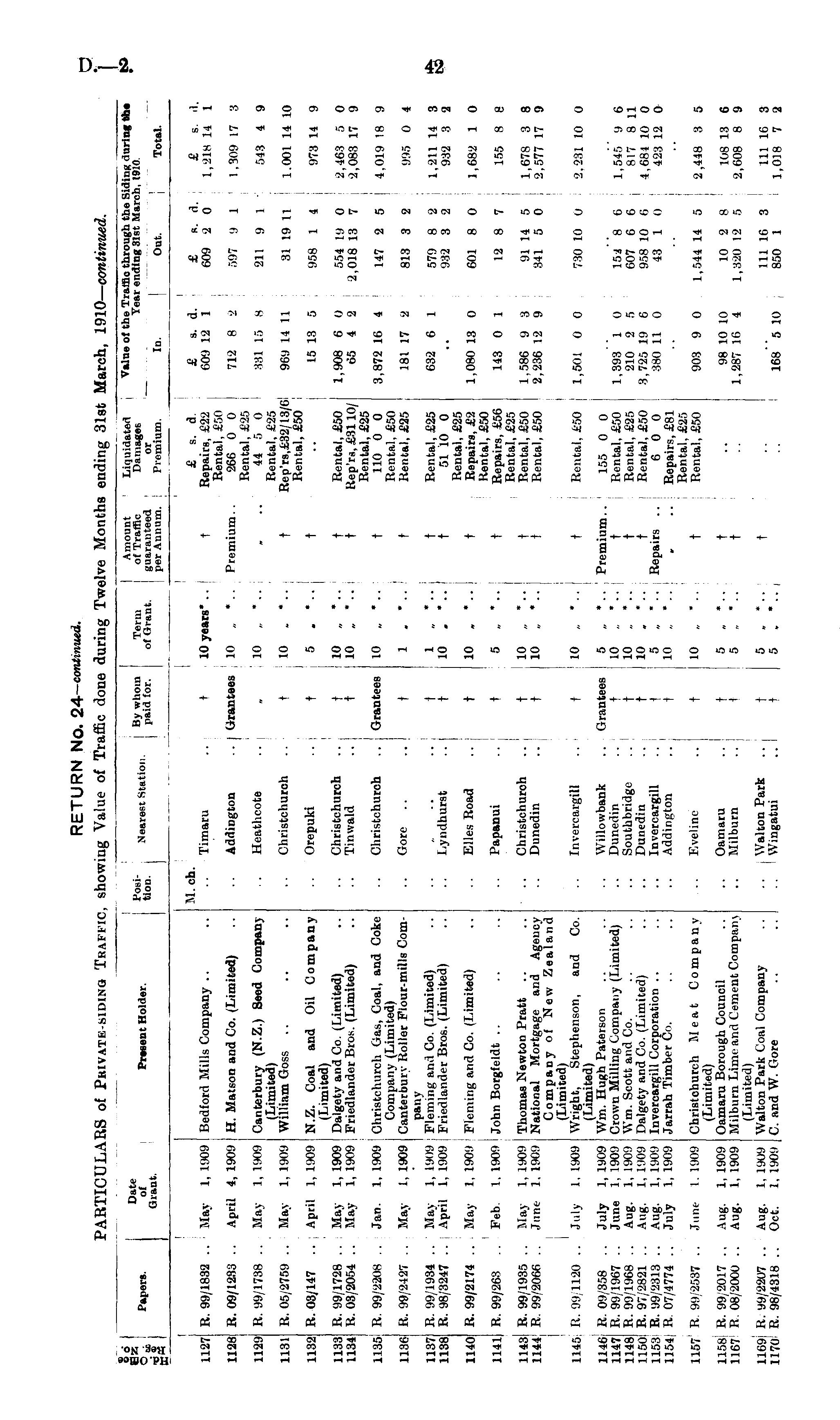 cj o K* Papers. Date of Grant. Present Holder. Position, j Nearest Station. j By whom I paid for. Term of Grant. Amount of Traffic guaranteed per Annum. Liquidated Damages or Premium. Value of the Traffic through the Siding during thai Year ending 31st March, 1910. In. Out. Total. 1127 1128 1129 R. 99/1832 .. May 1, 1909 R. 09/1233 .. April 4, 1909 R. 99/1738 .. May 1, 1909 Bedford Mills Company H. Matson and Co. (Limited) Canterbury (N.Z.) Seed Company (Limited) William Goss M. ch. Timaru Addington Heathcote + .. I Grantees £ s. d. 10 years* .. t Repairs, £22 Rental, £50 10 „ *.. Premium.. 266 0 0 Rental, £95 ' 10 „ * .. , .. 44 5 0 Rental. £25 10 . *.. f Rep'rs,£32/13/6! Rental, £50 : 5 . *.. t I £ s. d. £ s. d. £ s. il. 609 12 1 609 2 0 1,21m 14 1 712 8 2 5117 ll 1 1,309 17 3 381 15 8 211 li 1 543 4 9 1131 R. 05/2759 .. May 1, 1909 Christchurch t ,: 960 14 11 31 19 11 1.001 14 10 1132 1133 1134 R. 03yi47 .. April 1, 1909 R. 99/1728 .. May 1, 1909 R. 03/2054 .. May 1, 1909 N.Z. Coal and Oil Company (Limited) Dalgety and Co. (Limited) Friedlander Bros. (Limited) Orepuki Christchurch Tinwald t .. I t 10 „ * .. t Rental, £50 j 10 „ * .. I f Rep'rs,£3110/ Rental, £25 10 „ * .. t 110 0 0 Rental, £50 1 . * ■- t Rental, £25 15 13 5 958 1 4 j 973 14 9 1,908 6 0 554 19 0 2,463 5 0 65 4 2 2,018 13 7 | 2,083 17 9 1135J R. 99/2208 .. Jan. 1, 1909 Christchurch Gas, Coal, and Coke Company (Limited) Canterbury Roller Flour-mills Company Fleming and Co. (Limited) Friedlander Bros. (Limited) Christchurch Gore .. Grantees t ; 3,872 16 4 147 2 5 4,019 18 9 1136 R. 99/2427 .. May 1, 1909 181 17 2 813 3 2 995 0 4 1137 1138 R. 99/1934 .. May 1, 1909 R. 98/3247 .. April 1, 1909 Lyndhurst Elles Road 1 t t 1 „ * • • I t Rental, £25 10 . * .. ! t 51 10 0 Rental, £25 10 „ * .. ; t Repairs, £2 Rental, £50 5 „ ' .. f Repairs, £56 Rental, £25 10 „ * .. t Rental, £50 10 „ *.. t Rental, £50 ... . . 632 6 1 579 8 2 I 1,211 14 3 932 3 2 ; 932 3 2 1140 R. 99/2174 .. May 1, 1909 Fleming and Co. (Limited) 1,080 13 0 601 8 0 1,682 1 0 114l| R. 99/263 .. Feb. 1, 1909 John Borgfeldt Papanui " + ... . . 143 0 1 12 8 7 155 8 8 1,586 9 8 91 14 5 1,678 3 8 2,236 12 9 341 5 0 2,577 17 9 1143| 1144| R. 99/1935 .. May 1, 1909 R. 99/2066 .. June 1. 19011 Thomas Newton Pratt National Mortgage and Ageucy Company of New Zealand (Limited) Wright, Stephenson, and Co. (Limited) Win. Hugh Paterson Crown Milling Company (Limited) Wm. Scott and Co. Dalgety and Co. (Limited) Invercargill Corporation Jarrah Timber C". Christchurch Dunedin . t t 1145; R. 99/1120 .. July 1. 1909 Invercargill t 10 „ * .. t Rental, £50 1,501 0 0 730 10 0 : 2,231 10 0 1146 1147 1148 1150 1153' 1154 R. 09/358 .. July 1, 1909 R. 911 19G7 .. June 1, 1909 R. 99/1968 .. Aug. 1, 1909 R. 97/2821 .. Aug. 1, 11109 R. 99/2313 .. Aug. 1, 1909 R. 07/4774 .. July 1, 1909 Willowbank Dunedin Southbridge Dunedin Invercargill Addington .. Grantees 5 „ *.. Premium.. 155 0 0 10 „ *.. t Rental, £50 10 ., * .. t Rental, £25 10 . * .. t Rental, £50 5 „ * .. Repairs .. 6 0 0 10 ., * .. . .. Repairs, £81 Rental, £25 10 „ * .. t Rental, £50 1,393 1 0 15:4 8 6 1,545 9 6 210 2 5 607 6 6 817 8 11 3,725 19 6 958 10 6 4,684 10 0 880 11 0 43 1 0 423 12 0 903 9 0 1,544 14 5 2,448 3 5 98 10 10 10 2 8 108 13 6 1,287 16 4 1,320 12 5 2,608 8 9 1157 R. 99/2537 .. June 1. 1909 Christchurch Meat Company (Limited) Oamaru Borough Council Milburn Lime and Cement Company (Limited) Walton Park Coal Company C. and W. Gore Eveline t 1158 1167 R. 99/2017 .. Aug. 1, 1909 R. 08/2000 .. Aug. 1, 1909 Oamaru Milburn t t 5 * 4 5 . *.- t 1109' 1170 R. 99/2207 .. Aug. 1, 1909 R. 98/4318 .. Oct. 1, 1909 Walton Park Wingatui t .. I t 5 . *.. t 5 . *.. 111 16 3 j 111 16 3 168 5 10 850 1 '< 1,018 7 2