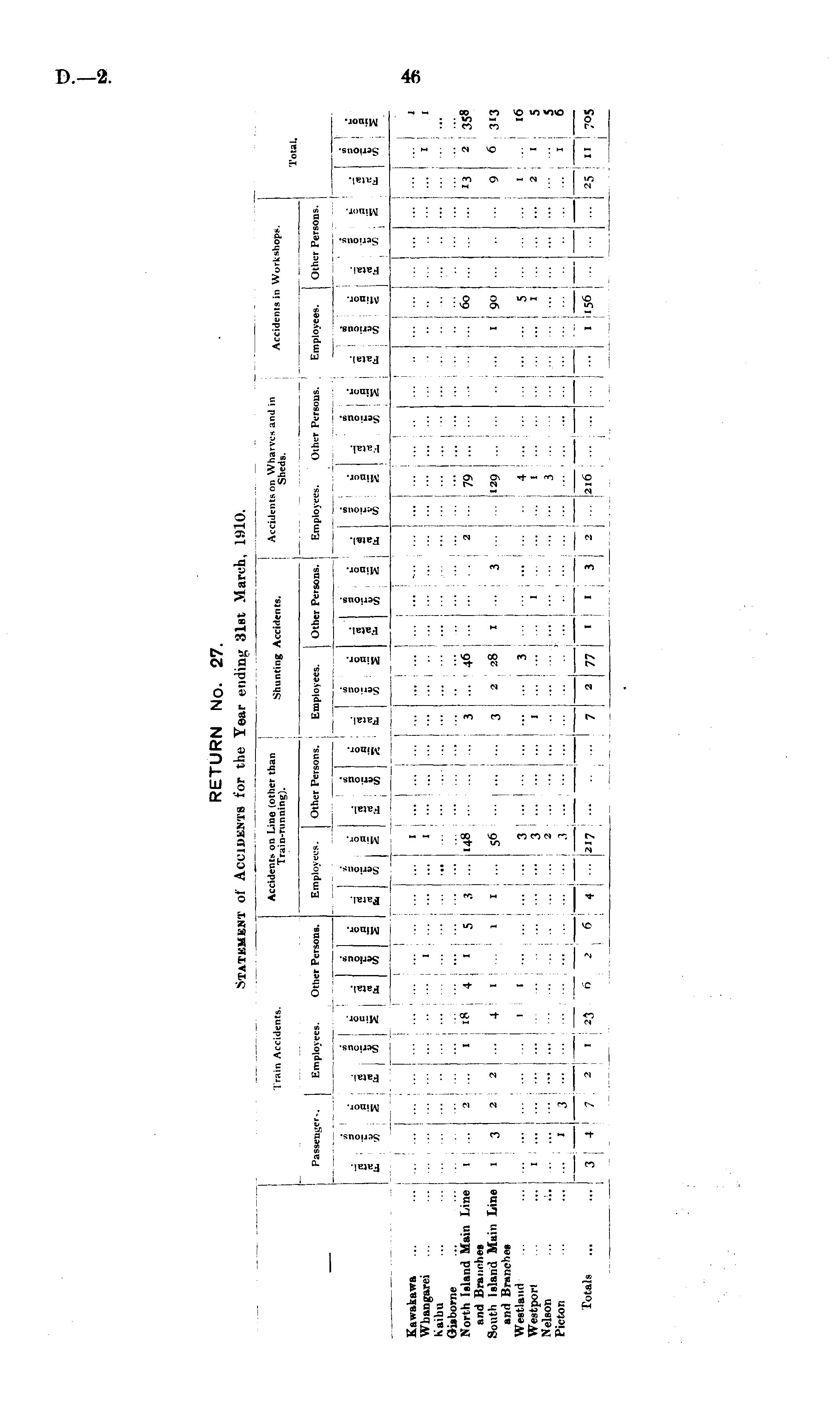 Train Accidents. Accidents on Line (other than ' Train-running). Shunting Accidents. Accidents on Wharves and in Sheds. Accidents in Workshops. Total, Passeng* —. — 3 2 I ft V r-. Employees. Other Per; tl = t- .3 a i -E i , 2 1 ens. -H 6 Employees. c 5 i I £ Other Persons. ui it, a 2 . _. o rt u jr. cfl u Employees. i Other Persons. tt v ' 'A 1 tt Employees. I 1 i Other Persons. 8 2 .. i 111 8 I us « B Employees. ■i> ■a tt » S ts. f. Other Persons. 2 is I tt. IT. rr\ ft Kawakawa Whangarei Kaihu Gisborne North Island Main Line and Branches South Island Main Line and Branches Westland Westport Nelson Picton i ... > ... i 18 4 i i 3 2 2 ... 4 I , ■ ... i 3 4 7 -' ' 23 r> 2 i 5 j 3 1 1 ... I I 148 56 3 3 ... 1 7 ... 46 . 2 28 " ■...!... I... i... I.. ! 2 ... 79 ... j 1 ... 3 129 ... I ... 4 1 1 , - 3 t 1 3 2 ... 216 1 90 5 ■•■ 1 ... 1 156 ... 1 1 - '3 a 358 9 6 313 3 3 2 3 ... , ... .6 - 2 1 5 I .. ... ... ... . < Totals 6 4 3 .. 2 77 j 5 1 6 ... 25 11 705 217 I