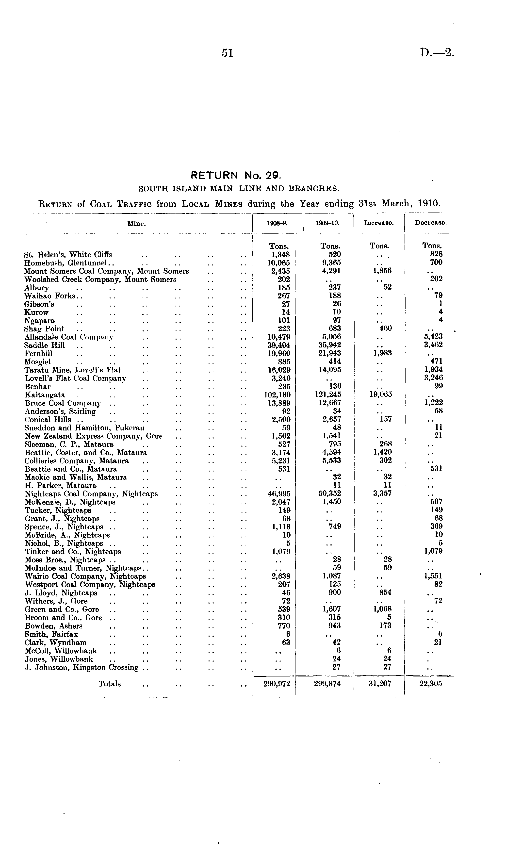 RETURN No. 29. SOUTH ISLAND MAIN LINE AND BRANCHES. Return of Coal Traffic from Local Mines during the Year ending 31st March, 1910.