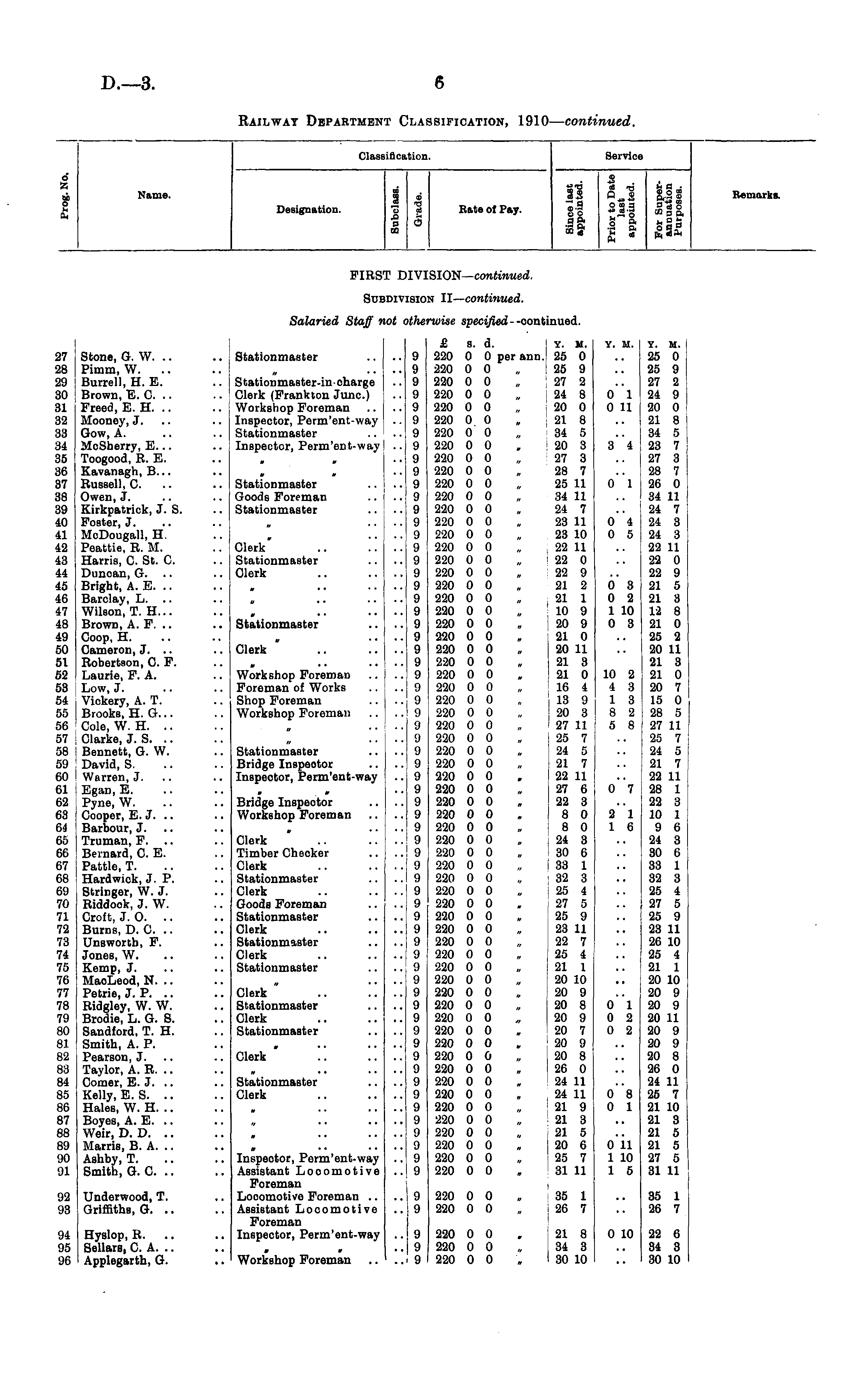 Clasi iification. Service d IB i Name. i • 2 S a O to 1! f J u a • 8.9™ Si! Remarks. Designation. Bate of Pay. FIRS )IVI 3I0N— continued. Sui IDI'I8io: : II— continued. Salaried Staff i lot othei wise specified -continued. 27 28 29 30 81 82 33 34 35 36 37 38 39 40 41 42 43 14 45 46 47 48 49 50 51 52 53 54 Bβ 56 57 58 59 60 61 62 63 64 66 66 6V 68 69 7U 71 72 73 74 75 70 77 78 79 80 81 82 88 81 85 86 87 88 B9 90 ill Stone, G. W. .. Pimm, W. Burrell, H. E. Brown, E. C. Freed, E. H. .. Mooney, J. Gow, A. MoSherry, E... Toogood, R. E. Kavanagh, B... Russell, C. Owen, J. Kirkpatrick, J. S. Foster, J. McDougall, H. Peattie, B. M. Harris, C. St. C. Duncan, G. Bright, A. E. Barclay, L. Wilson, T. H... Brown, A. F. Coop, H. Cameron, J. .. Robertson, C. F. Laurie, F. A. Low, J. Viokery, A. T. Brooks, H. G... Cole, W. H. Clarke, J. S. Bennett, G. W. David, S. Warren, J. Egan.E. Pyne, W. Cooper, E. J. Barbour, J. Truman, F. .. Bernard, C. E. Pattle, T. Hardwiok, J. P. Stringer, W. J. Riddook, J. W. Croft, J. 0. Burns, D. C. Unsworth, F. Jones, W. Kemp, J. MacLeod, N. .. Petrie, J. P. Ridgley, W. W. Brodie, L. G. S. Sandford, T. H. Smith, A. P. Pearson, J. Taylor, A. R. .. Comer, E. J. Kelly, E. S. Hales, W. H. .. Boyes, A. E. Weir, D. D. Harris, B. A. Ashby, T. Smith, G. C. Stationmaster Stationmaster-incharge Clerk (Frankton June.) Workshop Foreman Inspector, Perm'ent-way Stationmaster Inspector, Perm'ent-way » u Stationmaster Goods Foreman Stationmaster Clerk" .. '.'. Stationmaster Clerk ii • ■ • • Stationmaster Clerk Workshop Foreman Foreman of Works Shop Foreman Workshop Foreman Stationmaster Bridge Inepeotor Inspector, Perm'ent-way 9 9 ■J 9 'J 9 9 9 9 9 'J 'J 9 9 'J 9 9 9 9 9 9 9 9 9 9 9 9 9 9 9 9 9 9 9 9 9 '.) 9 9 '.) 9 9 9 '.) 9 9 9 9 9 9 9 9 9 9 9 9 ',) 9 9 9 9 9 9 9 9 £ s. d. Y. M. 220 0 0 per ann. 25 0 220 0 0,, 25 9 220 0 0 „ 27 2 220 0 0 „ 24 8 220 0 0 „ 20 0 220 0 0 „ 21 8 220 0 0 „ 34 5 220 0 0 . 20 3 220 0 0 „ 27 3 220 0 0 . 28 7 220 0 0,, 25 11 220 0 0,, 34 11 220 0 0 „ 24 7 220 0 0 „ 23 11 220 0 0,, 23 10 220 0 0,, 22 11 220 0 0,, 22 0 220 0 0 „ 22 9 220 0 0 , 21 2 220 0 0 „ 21 1 220 0 0 „ ' 10 9 220 0 0 „ 20 9 220 0 0 „ 21 0 220 0 0,, 20 11 220 0 0 „ I 21 3 220 0 0 „ 21 0 220 0 0 „ 16 4 220 0 0 „ I 13 9 220 0 0 „ ; 20 3 220 0 0 „ 27 11 220 0 0 „ I 25 7 220 0 0 „ 24 5 220 0 0 „ 21 7 220 0 0 . 22 11 220 0 0 „ 27 6 220 0 0 . 22 3 220 0 0 . 8 0 220 0 0 „ 8 0 220 0 0 „ 24 3 220 0 0 „ 30 6 220 0 0 „ 33 1 220 0 0 „ 32 3 220 0 0 „ 25 4 220 0 0 . 27 5 220 0 0 . 25 9 220 0 0 „ 23 11 220 0 0 „ 22 7 220 0 0 „ 25 4 220 0 0 „ 21 1 220 0 0 , i 20 10 220 0 0 „ 20 9 220 0 0 „ 20 8 220 0 0 „ 20 9 220 0 0 „ 20 7 220 0 0 . 20 9 220 0 0 „ 20 8 220 0 0 „ : 26 0 220 0 0 „ 24 11 220 0 0,, 24 11 220 0 0 „ 21 9 220 0 0 „ 21 3 220 0 0,, 21 5 220 0 0 , I 20 6 220 0 0 , 25 7 220 0 0 . 31 11 y. m. 0 1 0 11 3 4 0 1 0 4 0 5 6 3 0 2 1 10 0 3 10 2 4 3 1 3 8 2 5 8 o"7 2 - 'l 1 6 0 1 0 2 0 2 o"s 0 1 0 ii 1 10 1 5 Y. M. 25 0 25 9 27 2 24 9 20 0 21 8 34 5 23 7 27 3 28 7 26 0 34 11 24 7 24 3 24 3 22 11 22 0 22 9 21 5 21 3 12 8 21 0 25 2 20 11 21 3 21 0 20 7 15 0 28 5 27 11 25 7 24 5 21 7 22 11 28 1 22 3 10 1 9 6 24 3 80 6 33 1 32 3 25 4 27 5 25 9 23 11 26 10 25 4 21 1 20 10 20 9 20 9 20 11 20 9 20 9 20 8 26 0 24 11 25 7 21 10 21 3 21 5 21 5 27 5 31 11 Bridge Inspector Workshop Foreman Clerk Timber Checker Clerk Stationmaster Clerk Goods Foreman Stationmaster Clerk Stationmaster Clerk Stationmaster Clerk Stationmaster Clerk Stationmaater Clerk Stationmaster Clerk 98 Underwood, T. Griffiths, G. .. Inspector, Perm'ent-way Assistant Locomotive Foreman Locomotive Foreman .. Assistant Locomotive Foreman Inspector, Perm'ent-way 9 9 220 0 0 „ 35 1 220 0 0,, 26 7 35 1 26 7 94 96 96 Hyslop, R. Sellara, C. A. .. Applegarth, G. 'J 9 9 220 0 0 . ' 21 8 220 0 0,, 34 3 220 0 0 30 10 0 10 22 6 34 3 30 10 Workshop Foreman