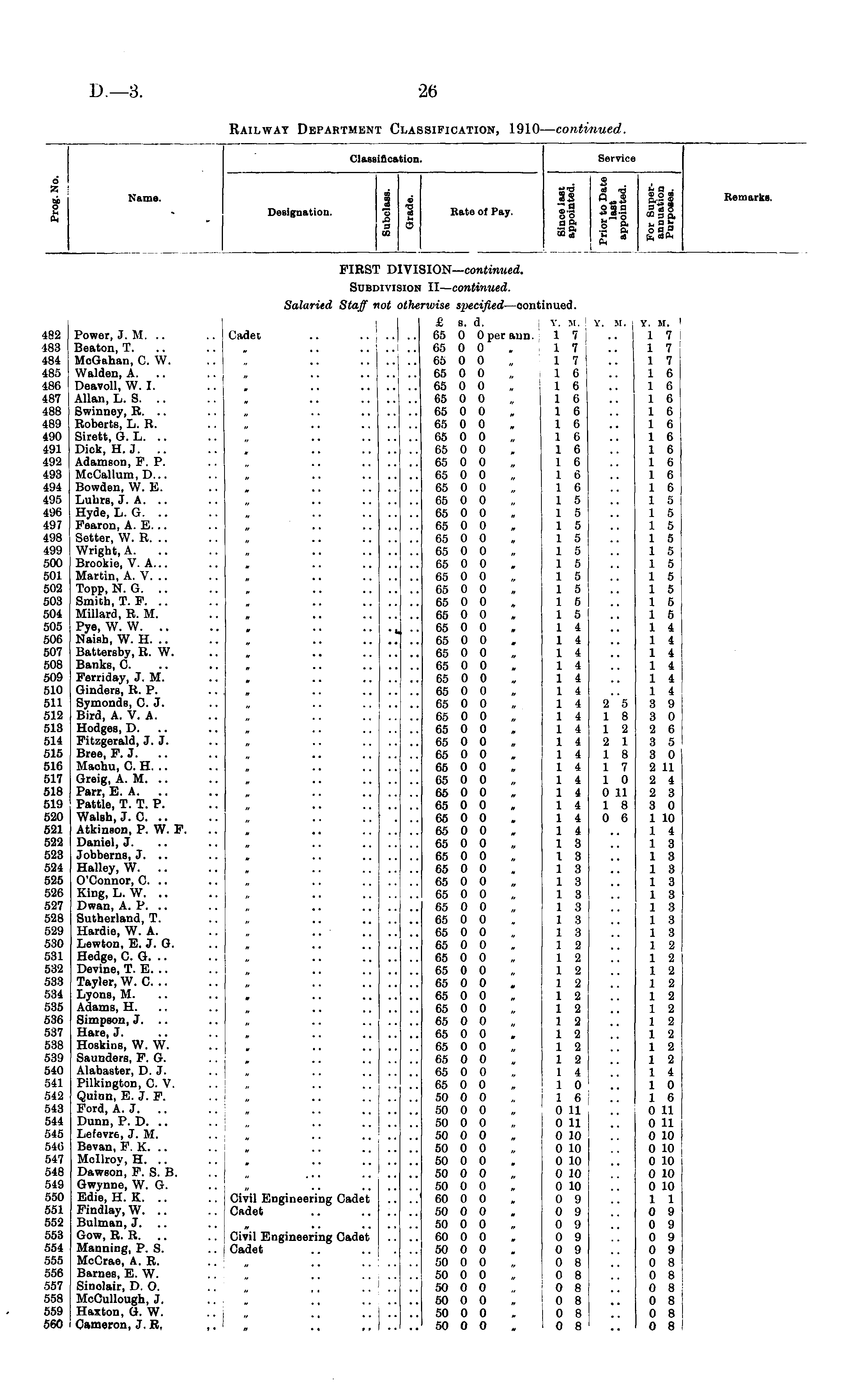 Classifici ition. Service i t Name. Designation. I 3 DO 1 Rate of Pay. I| Li l|| si *3i ss£ oft go. ua% as I a gas Remarks. FIRS' 1 d: [VI! SION— continued. Subi HVIi ilON i II— continued. 482 483 484 485 186 487 488 489 490 491 492 493 494 495 496 497 498 499 500 501 502 503 504 505 506 507 508 509 510 511 512 513 514 515 516 517 518 519 520 521 522 523 524 525 526 527 528 529 530 531 532 533 534 535 536 537 538 539 540 541 542 543 544 545 540 547 548 549 550 551 552 553 554 555 556 557 558 559 560 Power, J. M. Beaton, T. MoGahan, C. W. Walden, A. .. Deavoll, W. I. Allan, L. S. .. Swinney, R. .. Roberts, L. R. Sirett, G. L. Dick, H.J. .. Adamson, F. P. McCallum, D... Bowden, W. E. Luhrs, J. A. .. Hyde, L. G. Fearon, A. E. .. Setter, VV. R. .. Wright, A. Brookie, V. A... Martin, A. V. .. Topp, N. G. Smith, T. F. .. Millard, R. M. Pye, W. W. .. Naish, W. H. .. Battersby, R. W. Banks, C. Ferriday, J. M. Ginders, R. P. Symonds, C. J. Bird, A. V. A. Hodges, D. Fitzgerald, J. J. Bree, F. J. Maohu, C. H. .. Greig, A. M. Parr, E. A. Pattle, T. T. P. Walsh, J. C. .. Atkinson, P. W. F. Daniel, 3. Jobberns, J. .. Halley, W. .. O'Connor, O. .. King, L. W. Dwan, A. P. .. Sutherland, T. Hardie, W. A. Lewton, E. J. G. Hedge, C. G. .. Devine, T. E. .. Tayler, W. C. .. Lyons, M. Adams, H. Simpson, J. .. Hare, J. Hoskins, W. W. Saunders, F. G. Alabaster, D. J. Pilkington, C. V. Quinn, E. J. F. Ford, A. J. Dunn, P. D. .. Lefevre, J. M. Bevan, F. K. Mcllroy, H. .. Dawson, F. S. B. Gwynne, W. G. Edie, H. K. .. Findlay, W. .. Bulman, J. Gow, R. R. Manning, P. S. McCrae, A. R. Barnes, E. W. Sinolair, D. O. McCullough, J. Haxton, G. W. Cameron, J. R. " ;: Salaried Staff ■ Cadet „ .. .. H • • • • H • • • • II • • ■ ■ ,1 V • • • • II • • Civil Engineering Cadet Cndet Civil Engineering Cadet Cadet ii • • • • lot I ' • >tbe '.rwise specified —oonti n ued. £ s. d. y. M. 65 0 Operaun. 1 7 05 0 0 . 17 65 0 0 „ 17 65 0 0 „ 16 65 0 0 „ 16 65 0 0 „ 16 65 0 0 „ 16 65 0 0 . 16 65 0 0 „ 16 65 0 0 » 16 65 0 0 „ 16 65 0 0 „ 16 65 0 0 , 16 65 0 0 „ 15 65 0 0 „ 15 65 0 0 . 15 65 0 0 „ 15 65 0 0 „ 15 65 0 0 . 15 65 0 0 „ 15 65 0 0 , 15 65 0 0 „ 15 65 0 0 „ 15 65 0 0 . 14 65 0 0 . 14 65 0 0 „ 14 65 0 0 » 14 65 0 0 „ 14 65 0 0 „ 14 65 0 0 „ 14 65 0 0 „ 14 65 0 0 . 14 65 0 0 . 14 65 0 0 . '14 65 0 0 „ 14 65 0 0 „ 14 65 0 0 „ 14 65 0 0 „ 14 65 0 0 „ 14 65 0 0 . 14 65 0 0 „ 13 65 0 0 „ 13 65 0 0 . 13 65 0 0 „ 13 65 0 0 „ 13 65 0 0 „ 13 65 0 0 . 13 65 0 0 . 13 65 0 0 . 12 65 0 0 „ 12 65 0 0 „ 12 65 0 0 . 12 65 0 0 „ 12 65 0 0 „ 12 65 0 0 „ 12 65 0 0 . 12 65 0 0 „ 12 65 0 0 „ 12 65 0 0 , 14 65 0 0 . 10 50 0 0 „ 16 50 0 0 „ 0 11 50 0 0 „ 0 11 50 0 0 „ I 0 10 50 0 0 , 0 10 50 0 0 . 0 10 50 0 0 „ 0 10 50 0 0 . 0 10 60 0 0 » 0 9 50 0 0 , 0 9 50 0 0 . 0 9 60 0 0 , 0 9 50 0 0 , 0 9 50 0 0 „ 0 8 50 0 0 , 0 8 50 0 0 „ 0 8 50 0 0 „ 0 8 50 0 0 . 0 8 50 0 0 „ 0 8 V. M. 2 5 1 8 1 2 2 1 1 8 1 7 1 0 0 11 1 8 0 6 Y. M. 1 7 1 7 1 7 1 6 1 6 1 6 1 6 1 6 1 6 1 6 1 6 1 6 1 6 1 5 1 5 1 5 1 5 1 5 1 5 1 5 1 5 1 5 1 5 1 4 1 4 1 4 1 4 1 4 1 4 3 9 3 0 2 6 3 5 3 0 2 11 2 4 2 3 3 0 1 10 1 4 1 3 1 3 1 3 1 3 1 3 1 3 1 3 1 3 1 2 1 2 1 2 1 2 1 2 1 2 1 2 1 2 1 2 1 2 1 4 1 0 1 6 0 11 0 11 0 10 0 10 0 10 0 10 0 10 1 1 0 9 0 9 0 9 0 9 0 8 0 8 0 8 0 8 0 8 0 8