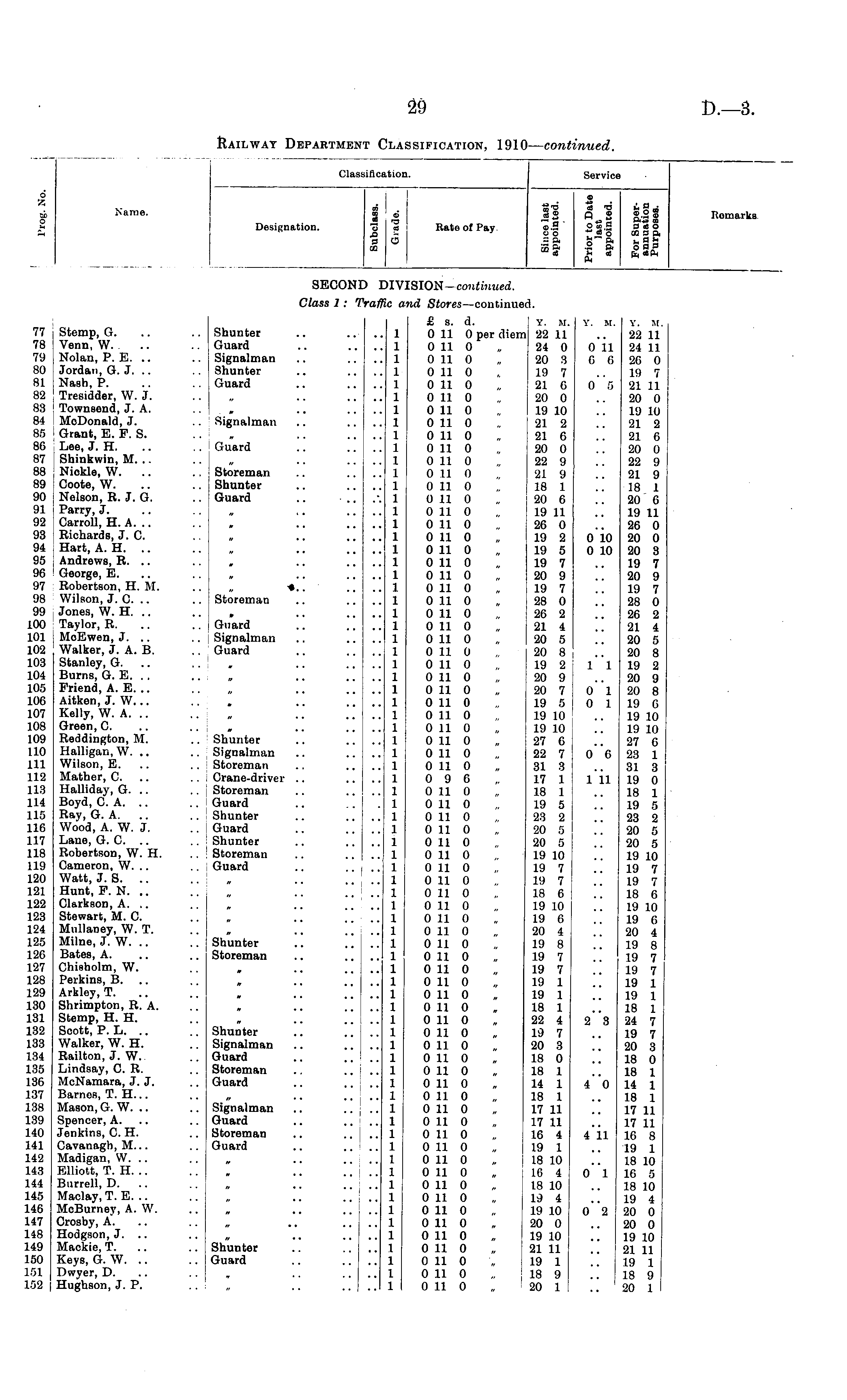 Clas: iitication. Service 6 Z Ml 5 u Name. a r-j a- O CO Rate of Pay ■ to 'o a *a" £ 5 a» jj2 gjg ©.9 ° «■* S ?d o a a £" a u°h £ a .2 a o a a Ph m Remarks. Designation. secon: 'iv: SION— continued. Class 1 : 1 ■afHi a; id Stores —continuec .i. 77 78 79 80 81 82 83 84 85 86 87 88 89 90 91 92 93 94 95 96 97 98 99 100 101 102 103 104 105 106 107 108 109 110 111 112 113 114 115 116 117 118 119 120 121 122 123 124 125 126 127 128 129 130 131 132 133 134 135 136 137 138 139 140 141 142 143 144 145 146 147 148 149 150 151 152 Stemp, G. Venn, W. .. Nolan, P. E. .. Jordan, G. J. Nash, P. Tresidder, W. J. Townsend, J. A. McDonald, J. Grant, E. F. S. Lee, J. H. Shinkwin, M. .. Nickle, W. .. Coote, W. Nelson, R. J. G. Parry, J. Carroll, H. A. .. Richards, J. C. Hart, A. H. Andrews, R. .. George, E. Robertson, H. M. Wilson, J. C. Jones, W. H. Taylor, R. McEwen, J. .. Walker, J. A. B. Stanley, G. Burns, G. E. Friend, A. E. .. Aitken, J. W... Kelly, W. A. .. Green, C. Reddington, M. Halligan.W. .. Wilson, B. Mather, C. Halliday, G. .. Boyd, C. A. Rav, G. A. .. Wood, A. W. J. Lane, G. C. Robertson, W. H. Cameron, W. .. Watt, J. S. Hunt, F. N. .. Clarkson, A. .. Stewart, M. C. Mnllaney, W. T. Milne, J. W. Bates, A. Chisholm, W. Perkins, B. Arkley, T. Shrimpton, R. A. Stemp, H. H. Scott, P. L. Walker, W. H. Railton, J. W. Lindsay, C. R. McNamara, J. J. Barnes, T. H... Mason, G. W. Spencer, A. Jenkins, C. H. Cavanagh,M... Madigan, W. .. Elliott, T. H. .. Burrell, D. .. Maclay, T. E. .. McBurney, A. W. Crosby, A. Hodgson, J. Mackie, T. Keys, G. W. .. Dwyer, D. Hughson, J. P. Shunter Guard Signalman Shunter Guard Signalman Guard Storeman Shunter Guard ■*.. Storeman Guard Signalman Guard Shunter Signalman Storeman Crane-driver Storeman Guard Shunter Guard Shunter Storeman Guard £ s. d. 0 11 0 per diem 0 11 0 0 11 0 0 11 0 0 11 0 0 11 0 0 11 0 0 11 0 0 11 0 0 11 0 0 11 0 0 11 0 0 11 0 0 11 0 0 11 0 0 11 0 0 11 0 0 11 0 0 11 0 0 11 0 0 11 0 0 11 0 0 11 0 0 11 0 0 11 0 0 11 0 0 11 0 0 11 0 0 11 0 0 11 0 0 11 0 0 11 0 0 11 0 0 11 0 0 11 0 0 9 6 0 11 0 0 11 0 0 11 0 0 11 0 0 11 0 0 11 0 0 11 0 0 11 0 0 11 0 0 11 0 0 11 0 0 11 0 0 11 0 0 11 0 0 11 0 0 11 0 0 11 0 0 11 0 0 11 0 0 11 0 0 11 0 0 11 0 0 11 0 0 11 0 0 11 0 0 11 0 0 11 0 0 11 0 0 11 0 0 11 0 0 11 0 0 11 0 0 11 0 0 11 0 0 11 0 0 11 0 0 11 0 0 11 0 0 11 0 0 11 0 Y. M. 22 11 24 0 20 3 19 7 21 6 20 0 19 10 21 2 21 6 20 0 22 9 21 9 18 1 20 6 19 11 26 0 19 2 19 5 19 7 20 9 19 7 28 0 26 2 21 4 20 5 20 8 19 2 20 9 20 7 19 5 19 10 19 10 27 6 22 7 31 3 17 1 18 1 19 5 23 2 20 5 20 5 19 10 19 7 19 7 18 6 19 10 19 6 20 4 19 8 19 7 19 7 19 1 19 1 18 1 22 4 19 7 20 3 18 0 18 1 14 1 18 1 17 11 17 11 16 4 19 1 18 10 16 4 18 10 19 4 19 10 20 0 19 10 21 11 19 1 18 9 20 1 V. M. oil 6 6 0 5 0 10 0 10 l"l o"i 0 1 o"o i ii V. M. 22 11 24 11 26 0 19 7 21 11 20 0 19 10 21 2 21 6 20 0 22 9 21 9 18 1 20 6 19 11 26 0 20 0 20 3 19 7 20 9 19 7 28 0 26 2 21 4 20 5 20 8 19 2 20 9 20 8 19 6 19 10 19 10 27 6 23 1 31 3 19 0 18 1 19 5 23 2 20 5 20 5 19 10 19 7 19 7 18 6 19 10 19 6 20 4 19 8 19 7 19 7 19 1 19 1 18 1 24 7 19 7 20 3 18 0 18 1 14 1 18 1 17 11 17 11 16 8 19 1 18 10 16 5 18 10 19 4 20 0 20 0 19 10 21 11 19 1 18 9 20 1 Shunter Storeman Shunter Signalman Guard Storeman Guard 2 - 3 4 - 0 Signalman Guard Storeman Guard 411 o"i 0 2 Shunter Guard