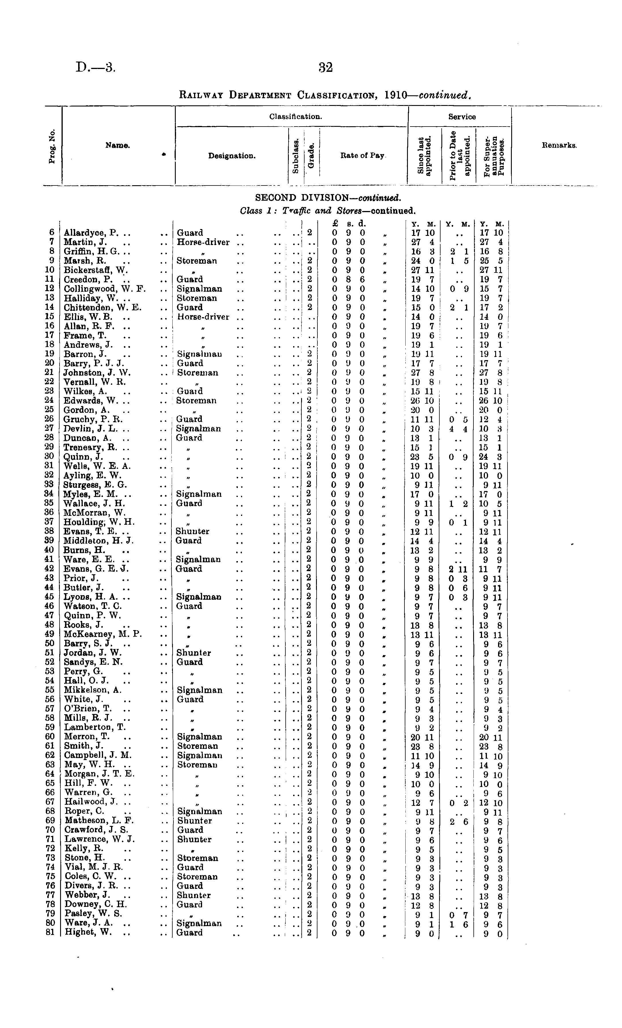 Clas; .ilieatioi Service 6 A -c o G J. Name. * Designation. § rS CJ j 01 a ! O co . Rate of Pay 0J -StJ rS n-j IH 9 rn" iS OS g,.2| h».S ° tf.S 3 « O S3 *"«8 ccaa a a ga i- 2 S ;k a .2 a o a a Remarks. SECOND T)l\ ISION— continued. Allardyco, P. .. Martin, J. Griffin, H. G. .. Marsh, R. Bickerstaff, W. Creedon, P. .. Collingwood, W. F. Halliday, W. .. Chittenden, W. E. Ellis, W. B. Allan, R. F. .. Frame, T. Andrews, J. Barron, J. Barry, P. J. J. Johnston, J. W. Vernall, W. R. Wilkes, A. Edwards, W. .. Gordon, A. Gruchy, P. R. Devlin, J. L. Duncan, A. Treneary, R. .. Quinn. J. Wells, W. E. A. Ayling, E. W. Sturgess, E. G. Myles, E. M. .. Wallace, J. H. McMorran, W. Houlding, W. H. Evans, T. E. .. Middleton, H. J. Burns, H. Ware, E. E. Evans, G. E. 3. Prior, J. Butler, J. Lyons, H. A. Watson, T. C. Quinn, P. W. Rooks, J. McKearney, M. P. Barry, S. J. .. Jordan, J. W. Sandys, E. N. Perry, G. Hall, O. J. Mikkelson, A. White, J. O'Brien, T. .. Mills, R. J. .. Lamberton, T. Merron, T. Smith, J. Campbell, J. M. May, W. H. .. Morgan, J. T. E. Hill.F. W. .. Warren, G. Hailwood, J. .. Roper, C. Matheson, L. F. Crawford, J. S. Lawrence, W. J. Kelly, R. Stone, H. Vial, M. J. R. Coles, C. W. .. Divers, J. R. Webber, J. .. Downey, C. H. Pasley, W. S. Ware, J. A. Highet, W. .. Class 1 : Traffic i .. Guard .. .. . .| 2 .. Horse-driver .. .. .. Storeman .. .. .. 2 .. .. 2 .. Guard .. .. ..2 .. Signalman .. .. .. 2 Storeman .. .. .. 2 .. Guard .. .. ..2 Horse-driver .. . . Signalman .. .. . . 2 .. Guard .. .... 2 .. Storeman .. .. .. 2 2 '.'. Guard '.. '.'. '.'.' 2 .. Storeman .. .. .. 2 .. .. 2 .. Guard .. .. ..2 Signalman .. .. .. 2 .. Guard .. .. .. 2 a .. . 2 !.' ",. '.'. '.'. '.'. 2 .... 2 .. Signalman .. .. .. 2 .. Guard .. .. ..2 .... 2 .... 2 .. Shunter .. .. ..2 .. Guard .. .. ..2 .... 2 .. Signalman .. .. .. 2 .. Guard .. .. ..2 .. .. 2 .. .. 2 .. Signalman .. .. .. 2 .. Guard .. .. ..2 .. .. 2 .. .. 2 2 .. .. 2 .. Shunter .. .. .. 2 .. Guard .. .. ..2 .... 2 2 .. Signalman .. .. ..2 .. Guard .. .. ..2 .. .. 2 .. .. 2 2 .. Signalman .. .. .. 2 .. Storeman .. .. .. 2 .. Signalman .. .. ..2 .. Storeman .. .. .. 2 .. .. 2 .... 2 2 2 .. Signalman .. .. 2 .. Shunter .. .. ..2 .. Guard .. .. ..2 .. Shunter .. .. ..2 .. .. 2 .. Storeman .. .. j .. 2 . . Guard .. .. .. 2 .. Storeman .. .. 2 .. Guard .. .. ..2 .. Shunter .. .. ..2 .. Guard .. .. .. 2 .... 2 .. Signalman .. .. ..2 .. Guard .. .. ..2 md Stores —continui ted. 6 7 8 9 10 11 12 13 M 15 16 17 18 19 20 21 22 28 21 28 2(1 27 28 29 30 31 32 33 31 88 86 37 88 39 U) 11 42 43 41 45 46 17 48 49 60 51 52 53 54 66 66 57 58 59 60 (il 62 68 64 65 66 67 68 69 70 71 72 71! 74 75 7(1 77 78 79 80 81 £ s. d. 0 9 0 0 9 0 0 9 0 0 9 0 0 9 0 0 8 6 0 9 0 0 9 0 0 9 0 0 9 0 0 9 0 0 9 0 0 9 0 0 9 0 0 9 0 0 9 0 0 9 0 0 9 0 0 9 0 0 9 0 0 9 0 0 9 0 0 9 0 0 9 0 0 9 0 0 9 0 0 9 0 0 9 0 0 9 0 0 9 0 0 9 0 0 9 0 0 9 0 0 9 0 0 9 0 0 9 0 0 9 0 0 9 0 0 9 0 0 9 0 0 9 0 0 9 0 0 9 0 0 9 0 0 9 0 0 9 0 0 9 0 0 9 0 0 9 0 0 9 0 0 9 0 0 9 0 0 9 0 0 9 0 0 9 0 0 9 0 0 9 0 0 9 0 0 9 0 0 9 0 0 9 0 0 9 0 0 9 0 0 9 0 0 9 0 0 9 0 0 9 0 0 9 0 0 9 0 0 9 0 0 9 0 0 9 0 0 9 0 0 9 0 0 9 0 0 9 0 Y. M. Y. M. 17 10 27 4 16 3 2 1 24 0 15 i 27 11 ' i 19 7 j 14 10 0 9 ! 19 7 .. 15 0 2 1 14 0 19 7 19 6 19 1 19 11 17 7 .. 27 8 19 8 .. 15 11 2(1 10 20 0 11 11 0 5 10 3 4 4 13 1 15 1 23 5 0 9 19 11 10 0 1 9 11 17 0 9 11 12 9 11 9 9 0 1 12 11 14 4 13 2 9 9 9 8 2 11 9 8 0 3 9 8 0 6 9 7 0 3 9 7 9 7 13 8 13 11 9 6 9 6 9 7 9 5 9 5 9 5 9 5 9 4 9 3 9 2 20 11 23 8 11 10 i 14 9 9 10 10 0 9 6 12 7 0 2 9 11 9 8 2 6 9 7 9 6 9 5 9 3 9 3 9 3 9 3 13 8 12 8 9 1 0 7 9 1 16 9 0 Y. M. 17 10 27 4 16 8 25 5 27 11 19 7 15 7 19 7 17 2 14 0 19 7 19 6 19 1 19 11 17 7 27 8 19 8 15 11 26 10 20 0 12 4 10 3 13 1 15 1 24 3 19 11 10 0 9 11 17 0 10 5 9 11 9 11 12 11 14 4 13 2 9 9 11 7 9 11 9 11 9 11 9 7 9 7 13 8 13 11 9 6 9 6 9 7 9 5 9 5 9 5 9 5 9 4 9 3 9 ■> 20 11 23 8 11 10 14 9 9 10 10 0 9 (1 12 10 9 11 9 8 9 7 9 6 9 5 9 3 9 3 9 3 9 3 13 8 12 8 9 7 9 6 9 0