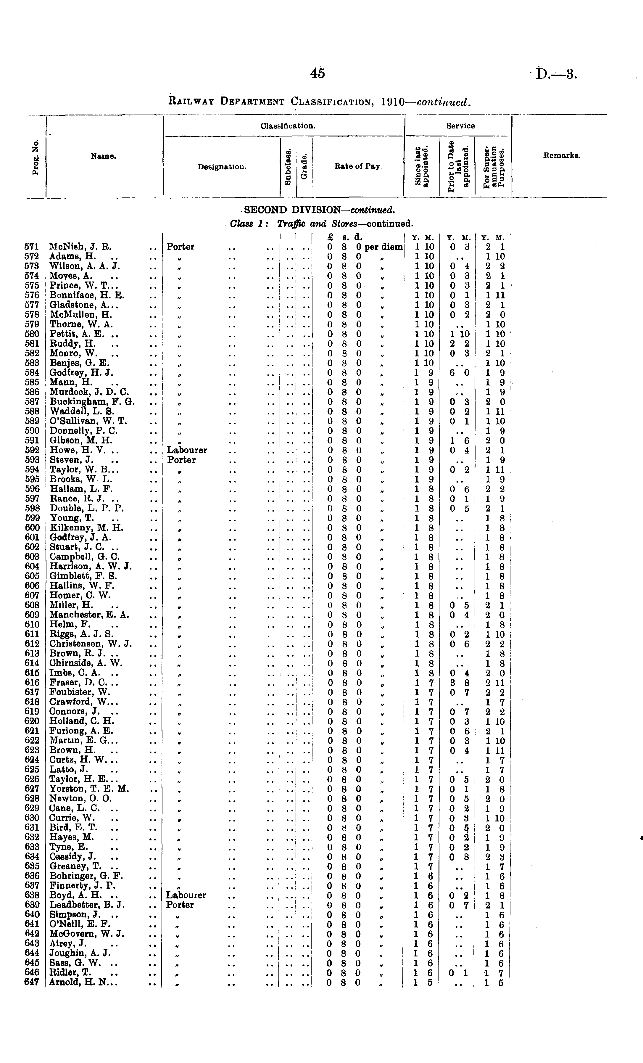 Glassincatioi Service 6 H O M CM Name. Designation, 3 £ —. ' 'o O si —I *"• a a co Rate of Pay OJ -«« <j? rrj fa 3 • 3l ojs 111 CD .2 ° m .S 3 * O OO ***o CO 3 £, a a, g- a j. a fa Remarks. SECOND DIV: ISION— continued. Porter Class 1 : Traffic c I I rnd Stores —continued. 571 572 573 574 575 576 577 578 579 580 581 582 583 584 585 586 587 588 589 590 591 592 593 594 595 596 597 598 599 600 601 602 603 604 605 606 607 608 MoNish, J. R. Adams, H. Wilson, A. A. J. Moyes, A. Prince, W. T... Bonniface, H. E. Gladstone, A... McMullen, H. Thome, W. A. Pettit, A. E. Ruddy, H. .. Monro, W. Benjes, G. E. Godfrey, H. J. Mann, H. Murdock, J. D. C. Buckingham, F. G. Waddell, L. 8. O'Sullivan, W. T. Donnelly, P. C Gibson, M. H. Howe, H. V. Steven, J. Taylor, W. B... Brooks, W. L. Hallam, L. F. Ranee, R. J. Double, L. P. P. Young, T. Kilkenny, M. H. Godfrey, J. A. Stuart, J. 0. Campbell, G. C Harrison, A. W. J. Gimblett, F. S. Hallins, W. F. Homer, C. W. Miller, H. Manchester, E. A. Helm, F. Riggs, A. J. S. Christensen, W. J. Brown, R. J. Ohirnside, A. W. Imbs, 0. A. Fraser, D. C. .. Foubister, W. Crawford, W... Connors, J. .. Holland, C. H. Furlong, A. E. Martin, E. G... Brown, H. Curtz, H. W. .. Latto, J. Taylor, H. E... Yorston, T. E. M. Newton, O. O. Cane, L. C Currie, W. Bird, E. T. Hayes, M. Tyne, E. Cassidy, J. Greaney, T. .. Bohringer, G. F. Finnerty, J. P. Boyd, A. H. Leadbetter, B. J. Simpson, J. .. O'Neill, E. F. McGovern, W. J. Airey, J. Joughin, A. J. Sass, G. W. Ridler, T. Arnold, H.N... Labourer Porter . g £ s. d. ! Y. M. 0 8 0 per diem 1 10 0 8 0 . 1 10 0 8 0 . 1 10 0 8 0 , 1 10 0 8 0 . 1 10 0 8 0 „ 1 10 0 8 0 . 1 10 0 8 0 . 1 10 0 8 0 „ 1 10 0 8 0 „ 1 10 0 8 0 „ 1 10 0 8 0 , 1 10 0 8 0 . 1 10 0 8 0 . 19 0 8 0 „ 19 0 8 0 , 19 0 8 0 „ 19 0 8 0 „ 19 0 8 0 „ 19 0 8 0 „ 19 0 8 0 „ 19 0 8 0 „ 19 0 8 0 , 19 0 8 0 „ 19 0 8 0 „ 19 0 8 0 „ 18 0 8 0 „ 18 0 8 0 „ 18 0 8 0 . 18 0 8 0 „ 18 0 8 0 „ 18 0 8 0 , 18 0 8 0 „ 18 0 8 0 . 18 0 8 0 „ 18 0 8 0 „ 18 0 8 0 „ 18 0 8 0 , 18 0 8 0 „ 18 0 8 0 „ 18 0 8 0 „ 18 0 8 0 , 18 0 8 0 . 18 0 8 0 . 18 0 8 0 „ 18 0 8 0 „ 17 0 8 0 „ 17 0 8 0 „ 17 0 8 0 , 17 0 8 0 „ 17 0 8 0 „ 17 0 8 0 . 17 0 8 0 „ 17 0 8 0 „ 17 0 8 0 „ 17 0 8 0 . 17 0 8 0 , 17 0 8 0 „ 17 0 8 0 . 17 0 8 0 „ 17 0 8 0 „ 17 0 8 0 „ 17 0 8 0 . 17 0 8 0 „ 17 0 8 0 „ 17 0 8 0 » 16 0 8 0 „ 16 0 8 0 . 16 0 8 0 . 16 0 8 0 „ 16 0 8 0 . 16 0 8 0 . 16 0 8 0 . 16 0 8 0 . 16 0 8 0 „ 16 0 8 0 . 16 0 8 0 , ,15 Y. M. Y. M. 0 3 2 1 1 10 0 4 2 2 0 3 2 1 0 3 2 1 0 1 1 11 0 3 2 1 0 2 2 0 1 10 1 10 1 10 2 2 1 10 0 3 2 1 1 10 6 0 19 19 19 0 3 2 0 0 2 1 11 0 1 1 10 .. ! 1 9 16:20 0 4 2 1 19 0 2 1 11 19 0 6 2 2 0 1 19 0 5 2 1 .. 18 1 8 18 18 18 18 18 18 1 8 0 5 2 1 0 4 2 0 .. .18! 0 2 1 10 0 6 2 2 18 18 0 4 2 0 3 8 2 11 0 7 2 2 17 0 7 2 2 0 3 1 10 0 6 2 1 0 3 1 10 0 4 1 11 ..17 17 0 5 2 0 0 1 18 0 5 2 0 0 2 19 0 3 1 10 0 5 2 0 0 2 19 0 2 19 0 8 2 3 17 16 16 0 2 18 0 7 2 1 1 6 16 16 16 1 6 1 6 0 1 17 15 610 611 612 613 614 615 616 617 618 619 620 621 622 623 624 625 626 627 628 629 630 631 632 633 634 635 636 637 638 639 640 641 642 643 644 645 646 647 .... .. i .. Labourer Porter .. .. .. .. ! .. .. .. .: .. :: •