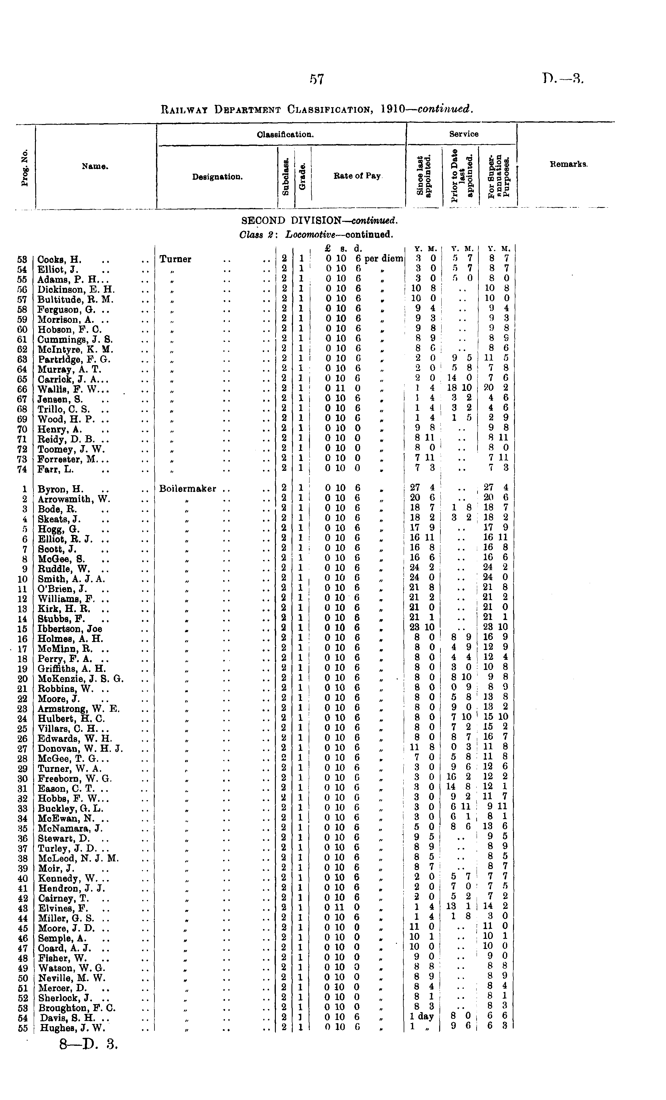 Classification. Service 6 Name. Designation. & i i S O CO © 11 % i ||g Hemarks. Rate of Pay g| S»| =*| *s h ill Bate of Pay Class 2 >I\ ISION— continued. >co: native —continued. 58 M Bβ 56 r>7 58 59 60 (il 63 68 64 66 66 (17 UK 69 70 71 72 73 T4 Cocks, H. Elliot, J. Adams, P. H... Dickinson, E. H. Bultitude, R. M. Ferguson, G. .. Morrison, A. .. Hobson, P. C. Cummings, J. S. Mclntyre, K. M. Partridge, F. Or. Murray, A. T. Carrick, J. A... Wallis, F. W... Jensen, S. Trillo, C. S. Wood, H. P. .. Henry, A. Reidy, D. B. Toomey, J. W. Forrester, M. .. Farr, L. Turner 2 2 2 2 2 2 2 2 2 2 2 3 3 2 2 2 2 2 2 3 2 2 1 1 1 1 1 1 1 1 1 1 1 1 1 1 1 1 1 1 1 1 1 1 £ e. d. y. m. v. M. y. M. 0 10 6 per diem 3 0 r> 7 8 7 0 10 6 . 3 0 5 7 8 7 0 10 6 , 3 0 ! f> 0 8 0 0 10 6 „ 10 8 .. 10 8 0 10 6 . 10 0 i .. 10 0 0 10 6 . 9 4 .. 9 4 0 10 6 „ 9 3 .. 9 3 0 10 6 , 9 8 .. 9 8 0 10 G . 8 9 .. 8 9 0 10 6 , 8 C ! .. 8 6 0 10 0 , 2 0 9 5 11 5 0 10 6 „ 3 0 ' 5 8 7 8 0 10 6 . 2 0 14 0 7 C 0 11 0 „ 1 4 18 10 j S>0 2 0 10 6 . 14 3 2 4 6 0 10 6 „ 1432 46 0 10 C „ 14 15 2 9 0 10 0 „ 9 8 .. 9 8 0 10 0 „ 8 11 .. 8 11 0 10 0 „ 8 0 .. 8 0 0 10 0 , ; 7 11 .. 7 11 0 10 0 . j 7 3 .. 7 3 1 2 3 4 r> 6 7 8 9 10 11 12 13 11 16 Iβ 17 18 19 20 21 22 23 21 25 26 27 28 29 80 81 32 88 34 35 36 37 38 39 10 11 ■12 43 41 45 46 47 48 19 50 51 52 58 54 55 Byron, H. Arrowsmith, W. Bode, R. Skeats, J. Hogg, G. Elliot, R. J. .. Soott, J. McGee, S. Ruddle, W. .. Smith, A. J. A. O'Brien, J. Williams, F. .. Kirk, H. R. Stubbs, F. Ibbertson, Joe Holmes, A. H. McMinn, R. .. Perry, F. A. Griffiths, A. H. MoKenzie, J. S. G. Robbins, W. .. Moore, J. Armstrong, W. E. Hulbert, H. C. Villars, C. H. .. Edwards, W. H. Donovan, W. H. J. McGee, T. G... Turner, W. A. Freeborn, W. G. Eason, C. T. Hobbs, F. W... Buckley, G. L. McEwan, N. .. McNamara, J. Stewart, D. .. Turley, J. D. .. McLeod, N. J. M. Moir, J. Kennedy, W. .. Hendron, J. J. Cairney, T. .. Elvines, F. Miller, G. S. Moore, J. D. Semple, A. Coard, A. J. Fisher, W. .. Watson, W. G. Neville, M. W. Mercer, D. Sherlock, J. .. Broughton, F. C. Davis, S. H. Hughes, J. W. Boilermaker .. a >. 2 2 2 2 2 2 2 2 3 2 2 2 3 3 2 3 2 2 2 2 3 3 2 3 2 2 3 it 2 2 2 2 2 3 2 2 2 3 2 2 2 a 2 2 2 a 2 ■>, i ■2 2 2 3 2 ■2 1 1 1 1 1 1 1 1 1 1 I 1 1 1 1 1 1 1 1 1 1 1 1 1 I 1 1 1 1 1 I 1 1 1 1 1 1 1 1 1 1 1 1 1 1 1 1 1 1 I 1 1 1 1 1 0 10 6 . 27 4 .. 27 4 0 10 6 „ 20 6 .. 20 6 0 10 6 , 18 I 1 8 18 7 0 10 6 . 18 2 8 2 18 2 0 10 6 „ 17 9 .. 17 9 0 10 6 . 16 11 .. 16 11 0 10 6 „ 16 8 .. 16 8 0 10 6 . 16 6 .. 16 6 0 10 6 . 24 2 .. 24 2 0 10 6 „ 24 0 .. 24 0 0 10 6 » 21 8 .. 21 8 0 10 6 . 21 2 .. 21 2 0 10 6 , 21 0 .. 21 0 0 10 6 „ I 21 1 .. ; 21 1 0 10 6 „ 23 10 .. 23 10 0 10 6 . 180 8916 9 0 10 6 „ 8 0 , 4 9 12 9 0 10 6 „ 8 0 4 4 I 12 4 0 10 6 „ 8 0 3 0 10 8 0 10 6 „ ■ 8 0 8 10 9 8 0 10 6 „ 8009 89 0 10 6 „ 8015813 8 0 10 6 . 80 9013 2 0 10 6 „ 8 0 7 10 ! 15 10 0 10 6 „ '80 72 15 2 0 10 6 „ 8 0 8 7 , 16 7 0 10 6 „ 11 8 0 3 11 8 0 10 6 . 70 58 11 8 0 10 6 „ i 3 0 9 6 12 6 0 10 G „ 3 0 16 2 12 2 0 10 6 » 3 0 14 8 12 1 0 10 6 „ ! 3 0 9 2 11 7 0 10 6 „ 3 0 6 11 : 9 11 0 10 6 „ 30 0 1,81 0 10 6 „ 5 0 8 6 13 6 0 10 G „ 9 5 ..9 5 0 10 6 „ 8 9.. 8 9 0 10 6 „ 8 5 .. 8 5 0 10 6 „ 8 7 ..87 0 10 6 „ 20 57 77 0 10 6 „ 2 0 7 0 7 6 0 10 6 „ 20 52 72 0 11 0 „ . 1 4 13 1 I 14 2 0 10 6 „ 14 18 30 0 10 0 . I 11 0 .. 11 0 0 10 0 . j 10 1 .. 10 1 0 10 0 . I 10 0 .. 10 0 0 10 0 . I 9 0 .. 9 0 0 10 0 „ 88 .. 88 0 10 0 . ' 8 9 ! .. 8 9 0 10 0 » j 8 4 I ..84 0 10 0 „ 8 1 .. 8 1 0 10 0 „ 8 3 .. 8 3 0 10 6 » 1 day 8 0 6 6 0 10 6 , 1 ,. 9 6,6 8 it • • 8—D. 8.