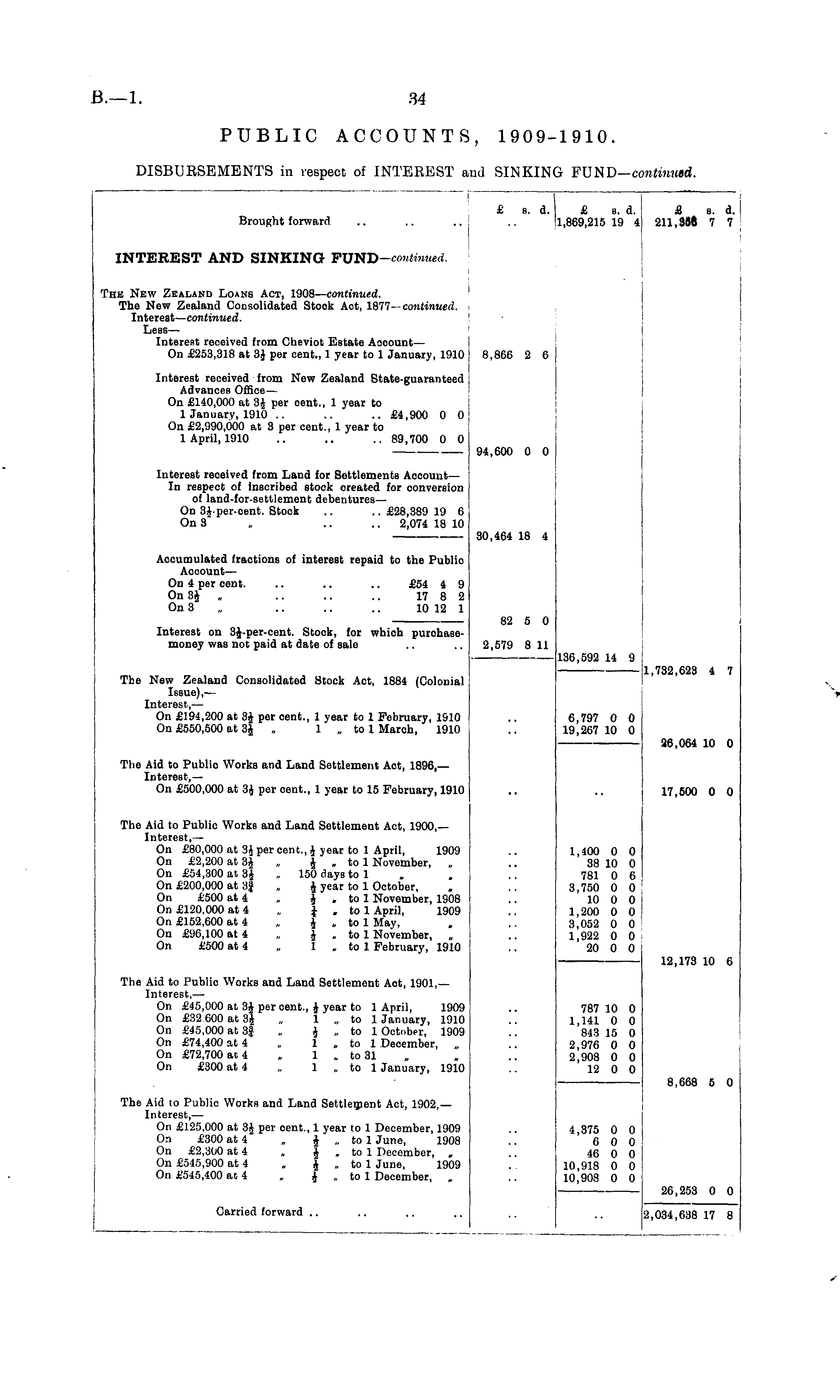Brought forward £ s. d. £ s. d. 1,869,215 19 4 £ s. d. 211,366 7 7 INTEREST AND SINKING VUlXD-eontimtd. The New Zealand Loans Act, 1908— continued. The New Zealand Consolidated Stook Act, 1877— continued. Interest— continued. Less— Interest received from Cheviot Estate Aocount— On £253,318 at 3£ per cent., 1 year to 1 January, 1910 8,866 2 6 Interest received from New Zealand State-guaranteed Advances Office— On £140,000 at 3£ per oent., 1 year to 1 January, 1910 .. .. .. £4,900 0 0 On £2,990,000 at 3 per cent., 1 year to 1 April, 1910 .. .. .. 89,700 0 0 94,600 0 0 Interest received from Land for Settlements Account— In respect of inscribed stock created for conversion of land-for-settlement debentures— On 3£-per-cent. Stock .. .. £28,389 19 6 On 3 . .. .. 2,074 18 10 Accumulated fractions of interest repaid to the Public Account— On 4 per cent. .. .. .. £54 4 9 On 3£ „ .. .. .. 17 8 2 On 3 .. .. .. 10 12 1 30,464 18 4 82 5 0 Interest on 3£-per-cent. Stock, for which purchasemoney was not paid at date of sale 2,579 8 11 136,592 14 9 The New Zealand Consolidated Stock Act, 1884 (Colonial Issue), — Interest, — On £194,200 at 3£ per cent., 1 year to 1 February, 1910 On £550,500 at 3£ . 1 „ to 1 March, 1910 1,732,623 4 7 6,797 0 0 19,267 10 0 26,064 10 0 The Aid to Public Works and Land Settlement Act, 1896, — Interest, — On £500,000 at 3£ per cent., 1 year to 15 February, 1910 17,500 0 0 The Aid to Public Works and Land Settlement Act, 1900,— Interest,— On £80,000 at 3£ per cent., £ year to 1 April, 1909 On £2,200 at 3£ . £ . to 1 November, , On £54,300 at 3£ „ 150 days to 1 On £200,000 at 3| „ £ year to 1 October, On £500 at 4 . £ „ to 1 November, 1908 On £120,000 at 4 „ | . to 1 April, 1909 On £152,600 at 4 „ £ „ to 1 May, On £96,100 at 4 „ £ „ to 1 November, „ On £500 at 4 „ 1 „ to 1 February, 1910 1,400 0 0 38 10 0 781 0 6 3,750 0 0 10 0 0 1,200 0 0 3,052 0 0 1,922 0 0 20 0 0 12,173 10 6 The Aid to Public Works and Land Settlement Aot, 1901,— Interest, — On £45,000 at 3£ per cent., £ year to 1 April, 1909 On £32 600 at 3£ „ 1 „ to 1 January, 1910 On £45,000 at 3| „ £ „ to 1 October, 1909 On £74,400 at 4 „ 1 „ to 1 December, „ On £72,700 at 4 „ 1 „ to 31 On £300 at 4 „ 1 „ to 1 January, 1910 787 10 0 1,141 0 0 843 15 0 2,976 0 0 2,908 0 0 12 0 0 8,668 5 0 The Aid to Public Works and Land Settlement Act, 1902,— Interest, — On £125,000 at 3£ per cent., 1 year to 1 December, 1909 On £300 at 4 „ J „ to 1 June, 1908 On £2,300 at 4 . £ „ to 1 December, „ On £545,900 at 4 „ £ „ to 1 June, 1909 On £545,400 at 4 . £ „ to 1 December, , 4,375 0 0 6 0 0 46 0 0 10,918 0 0 10,908 0 0 26,253 0 0 Carried forward 2,034,638 17 8