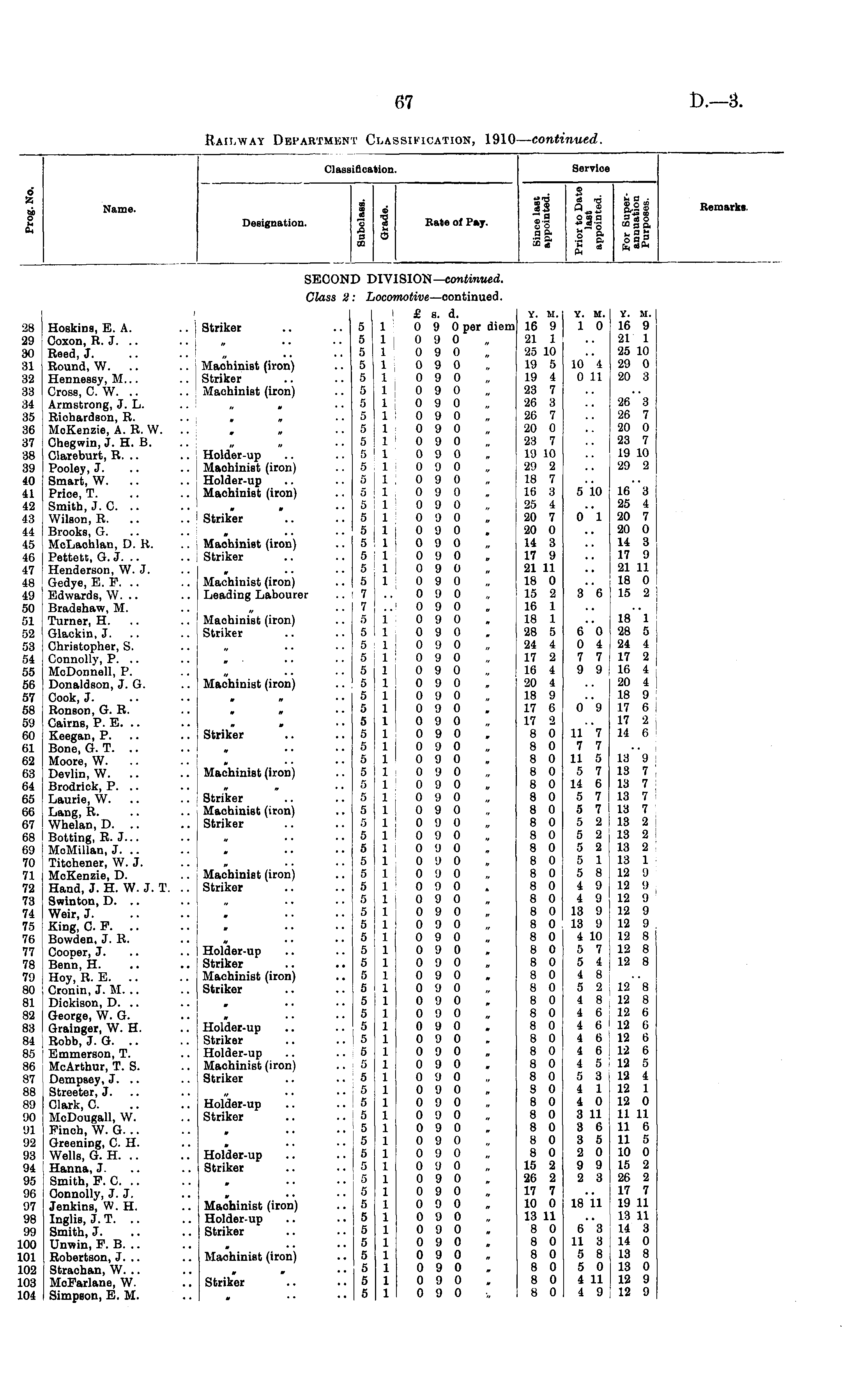 Clasi lincatioi Service o I Name. Designation. I I Bate of Pay. if ssa 51 a So. g g, h ag Remarks. secon: )IV SION— continued. Class H lOOOI native —continued. 28 2'.) 80 :ll 82 33 34 36 Bβ 37 :W 39 40 u 13 |:i II US Lβ 17 18 19 50 51 52 58 54 55 56 57 58 5: i 60 (il 63 68 l>4 65 66 67 68 69 70 71 72 78 71 75 76 77 78 711 SO 81 82 88 si 85 86 S7 S8 89 go 9] 92 98 94 96 96 97 98 99 100 101 102 108 101 Hoskins, E. A. Coxon, R. J. .. Reed, J. Round, W. .. Henneesy, M... Cross, C. W. .. Armstrong, J. L. Richardson, R. McKenzie, A. R. W. .. Chegwin, J. H. B. Clareburt, R. .. Pooley, J. Smart, W. Price, T. Smith, J. C. .. Wilson, R. .. Brooks, G. McLachlan, D. R. Pettett, G. J. .. Henderson, W. J. Gedye, E. P. .. Edwards, W. .. Bradshaw, M. Turner, H. .. Glackin, J. Christopher, S. Connolly, P. .. McDonnell, P. Donaldson, J. G. Cook, J. Ronson, G. R. Cairns, P. E. .. Keegan, P. .. Bone, G. T. .. Moore, W. Devlin, W. .. Brodrick, P. .. Laurie, W. .. Lang, R. Whelan, D. .. Botting, R. J... McMillan, J. .. Titchener, W. J. McKenzie, D. Hand, J. H. W. J. T. .. Swinton, D. .. Weir, J. King, C. P. .. Bowden, J. R. Cooper, J. Benn, H. Hoy, R. E. .. Cronin, J. M. .. Dickison, D. .. George, W. G. Grainger, W. H. Robb, J. G. .. Emmerson, T. McArthur, T. S. Dempeey, J. .. Streeter, J. Clark, C. McDougall, W. Finch, W. G. .. Greening, C. H. Wells, G. H. .. Hanna, J. Smith, P. C. .. Connolly, J. J. Jenkins, W. H. Inglis, J. T. .. Smith, J. Unwin, P. B. .. Robertson, J. .. Strachan, W. .. MoParlane, W. Simpson, E. M. Striker Machinist (iron) Striker Machinist (iron) Holder-up Machinist (iron) Holder-up Machinist (iron) Striker Machinist (iron) Striker Machinist (iron) Leading Labourer Machinist (iron) Striker // • • • • Machinist (iron) Striker v • • • • Machinist (iron) Striker Machinist (iron) Striker 5 5 5 5 5 5 5 5 5 5 5 5 6 5 5 5 6 5 5 5 • : ) V 7 5 5 5 5 5 6 5 5 5 5 5 5 5 5 5 5 5 B 6 5 5 5 5 5 6 5 5 6 5 5 5 5 5 5 5 5 5 5 5 5 5 5 6 5 5 5 6 6 6 5 5 5 5 S 1 1 1 1 1 1 1 1 1 1 1 1 1 1 1 1 1 1 1 1 1 1 1 1 1 1 1 1 1 1 1 1 1 1 1 1 1 1 1 1 1 1 1 1 \ 1 1 1 1 1 1 1 1 1 1 1 1 1 1 1 1 1 1 1 1 1 1 1 1 1 1 1 £ s. d. 0 9 0 per diem 0 9 0 0 9 0 0 9 0 0 9 0 0 9 0 0 9 0 0 9 0 0 9 0 0 9 0 0 9 0 0 9 0 0 9 0 0 9 0 0 9 0 0 9 0 0 9 0 0 9 0 0 9 0 0 9 0 0 9 0 o g o 0 9 0 0 9 0 0 9 0 0 9 0 0 9 0 0 9 0 0 9 0 0 9 0 0 9 0 0 9 0 0 9 0 0 9 0 0 9 0 0 9 0 0 9 0 0 <J 0 0 9 0 0 !) 0 0 9 0 0 9 0 0 9 0 0 9 0 0 9 0 0 9 0 0 9 0 0 9 0 0 9 0 0 9 0 0 9 0 0 9 0 0 9 0 0 9 0 0 9 0 0 9 0 0 9 0 0 9 0 0 9 0 0 9 0 0 9 0 0 9 0 0 9 0 0 9 0 0 9 0 0 9 0 0 9 0 0 9 0 0 9 0 0 9 0 0 9 0 0 9 0 0 9 0 0 9 0 0 9 0 0 9 0 0 9 0 Y. M. 16 9 21 1 25 10 19 5 19 4 23 7 26 3 26 7 20 0 23 7 19 10 29 2 18 7 W 3 25 4 20 7 20 0 14 3 17 9 21 11 18 0 15 2 16 1 18 1 28 5 24 4 17 2 16 4 20 4 18 9 17 6 17 2 8 0 8 0 8 0 8 0 8 0 8 0 8 0 8 0 8 0 8 0 8 0 8 0 8 0 8 0 8 0 8 0 8 0 8 0 8 0 8 0 8 0 8 0 8 0 8 0 8 0 8 0 8 0 8 0 S 0 8 0 8 0 8 0 8 0 8 0 15 2 26 2 17 7 10 0 13 11 8 0 8 0 8 0 8 0 8 0 8 0 Y. M. 1 0 io"4 0 11 5 10 0 1 3"6 6 0 0 4 7 7 9 9 0*9 11 7 7 7 11 5 5 7 14 6 5 7 5 7 5 2 5 2 5 2 5 1 5 8 4 9 4 9 13 9 13 9 4 10 5 7 5 4 4 8 5 2 4 8 4 6 4 6 4 6 4 6 4 5 5 3 4 1 4 0 3 11 3 6 3 5 2 0 9 9 2 3 Y. M. i 16 9 21 1 25 10 29 0 20 3 26 3 26 7 20 0 23 7 19 10 29 2 16 3 25 4 20 7 20 0 14 3 17 9 21 11 18 0 15 2 ! 18-1 28 5 24 4 17 2 16 4 20 4 18 9 17 6 17 2 14 6 13 9 13 7 13 7 13 7 18 7 13 2 13 2 13 2 13 1 12 9 12 9 12 9 ! 12 9 12 9 . 12 8 12 8 12 8 Machinist (iron) Striker H • * • • Holder-up Striker Machinist (iron) Striker Holder-up Striker Holder-up Machinist (iron) Striker Holder-up Striker 12 8 12 8 12 6 12 6 12 6 12 6 12 5 12 i 12 1 12 0 11 11 11 6 11 5 10 0 15 2 26 2 17 7 19 11 18 11 14 3 14 0 13 8 13 0 12 9 12 9 Holder-up Striker u ■ • * • Machinist (iron) Holder-up Striker 18 ii Machinist (iron) 6 3 11 3 5 8 5 0 4 11 4 9 Striker M * * * *