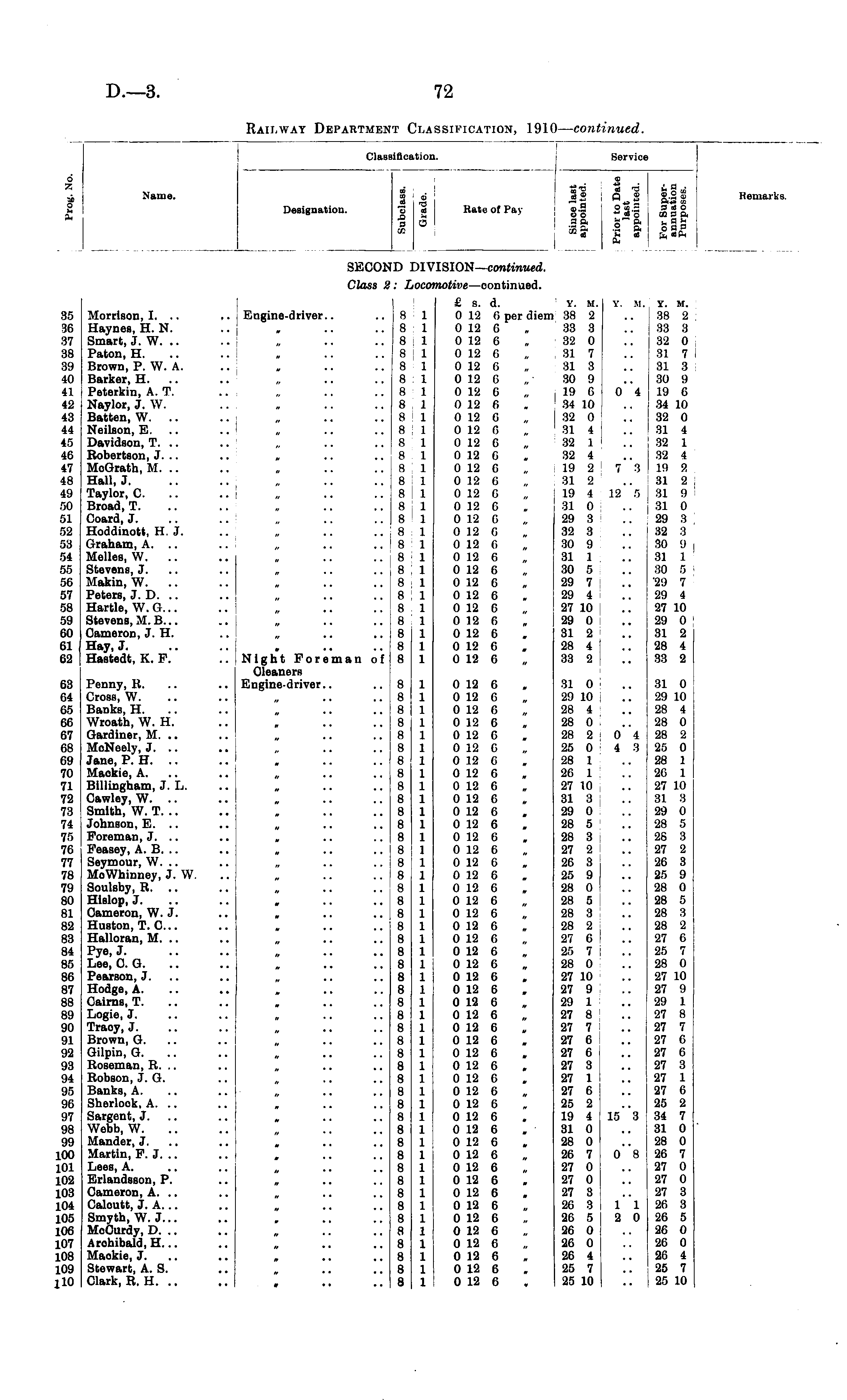 Classification. Service 6 z Name. o c a, Designation. Designation ■g I Kate of Pay I - . i S "Zα oS= a«o S3 "do 00 D ft a o< £~ & c '" 1! I S £§S J Remarks. SECON SEC □OND DIVI d div: ISION— continued. Class 2 Clas ss 2: Locom : Locon native —continued. 35 Morrison, I. .. 36 Haynes, H. N. 37 Smart, J. W. .. 38 Paton, H. 39 Brown, P. W. A. 40 Barker, H. .. 11 Peterkin, A. T. 42 Naylor, J. W. 43 Batten, W. .. 44 Neilson, E. .. 15 Davidson, T. .. 16 Bobertson, J. .. 17 MoGrath, M. .. 18 Hall, J. 19 Taylor, C. 50 Broad, T. 51 Coard, J. '<:>. Hoddinott, H. J. 53 Graham, A. .. 54 Melles, W. 55 Stevens, J. 56 Makin, W. 57 Peters, J. D. 58 Hartle, W. G... 59 Stevens, 31 B... 50 Cameron, J. H. 51 Hay, J. 32 Hastedt, K. P. 33 Penny, II. 34 Cross, W. 55 Banks, H. 56 Wroath, W. H. 57 Gardiner, M. .. 38 MoNeely, J. .. 39 Jane, P. H. .. 70 Maokie, A. n Billingham, J. L. r2 Cawley, W. .. 73 Smith, W. T. .. 74 Johnson, E. .. 75 Foreman, J. .. 76 Feasey, A. B. .. 77 Seymour, W. .. 78 MoWhinney, J. W. 79 Soulsby, B. .. 30 Hislop, J. 31 Cameron, W. J. 32 Huston, T. C... 33 Halloran, M. .. 34 Pye, J. 35 Lee, C. G. 36 Pearson, J. 37 Hodge, A. 38 Caims, T. 39 Logie, J. 30 Traoy, J. 31 Brown, G. 32 Gilpin, G. 33 Boseman, B. .. 34 Bobson, J. G. 35 Banks, A. 36 Sherlook, A. .. 97 Sargent, J. 38 Webb, W. 99 Mander, J. DO Martin, F. J. .. 01 Lees, A. 02 Erlandsson, P. 03 Cameron, A. .. 04 Caloutt, J. A. .. 05 Smyth, W. J. .. 06 MoCurdy, D. .. 07 Arohibald.H... 08 Maokie, J. 09 Stewart, A. S. 10 Clark, B. H. .. Kngine-driver.. ..Night Foreman of Cleaners .. Engine-driver.. 3-driver.. t Foreman iftrR ..8 1 ..8 1 .. 8 i 1 .. 8 I 1 .. 8 1 ..8 1 ..8 1 ..8 1 .. 8 1 .. 8 1 .. 8 1 .. 8 1 ..8 1 ..8 1 ..8 1 .. 8 i 1 ..8 1 .. 8 1 .. 8 1 .. 8 1 ..8 1 .. 8 j 1 .. 8 ! 1 .. 8 1 .. 8 1 ..8 1 ..8 1 of 8 1 l £ s. d. 0 12 (i per diem 0 12 6 0 12 6 0 12 6 0 12 G 0 12 G 0 12 6 0 12 6 0 12 6 0 12 C> 0 12 6 0 12 6 0 12 G 0 12 C 0 12 G 0 12 G 0 12 G 0 12 G 0 12 6 0 12 G 0 12 6 0 12 6 0 12 6 0 12 6 0 12 f> 0 12 6 0 12 G 0 12 G ' Y. M. Y. M. Y. M. ) 38 2 .. 38 2 33 3 .. 33 3 32 0 .. 32 0 31 7 .. 31 7 i 31 3 .. 31 3 30 9 .. 30 9 , 19 G 0 4 19 6 34 10 ! .. 34 10 32 0 ' .. ! 32 0 31 4 .. 81 4 32 1 .. 32 1 32 4 .. 32 4 19 2 ! 7 3 19 2 31 2 .. 31 2 ; I 19 4 : 12 5 81 9 i j 31 0 .. I 31 0 29 3 .. 29 3 32 3 .. I 32 3 30 9 .. 30 9 31 1 .. 31 1 ! 30 5 .. 30 5 j 29 7 .. '29 7 29 4 .. 29 4 ! 27 10 .. 27 10 i 29 0 .. 29 0 31 2 .. I 31 2 28 4 .. i 28 4 33 2 .. 33 2 35 36 37 38 39 40 41 42 43 44 45 46 47 48 49 50 51 52 53 54 55 56 57 58 59 60 61 62 8 1 8 1 8 1 8 ! 1 8 1 8 1 8 1 8 1 H 1 8 1 S 1 8 1 8 1 8 1 8 1 8 1 8 1 8 1 8 1 8 1 8 1 8 j 1 8 1 S 1 8 1 8 1 8 1 8 1 63 64 65 66 67 68 69 70 71 72 73 74 75 76 77 78 79 80 81 82 83 84 85 86 87 88 89 90 91 92 93 94 95 96 97 98 99 100 101 102 103 104 105 106 107 108 109 110 lers i-driver.. ..8 1 ..8 1 ..8 1 ..8 1 ..8 1 ..8 1 ..8 1 ..8 1 ..8 1 ..8 1 ..8 1 ..8 1 ..8 1 .. 8 1 ..8 1 ..8 1 ..8 1 ..8 1 ..8 1 ..8 1 ..8 1 ..8 1 ..8 1 ..8 1 ..8 1 ..8 1 ..8 1 ..8 1 ..8 1 ..8 1 ..8 1 ..8 1 ..8 1 ..8 1 ..8 1 ..8 1 ..8 1 ..8 1 ..8 1 ..8 1 ..8 1 ..8 1 ..8 1 ..8 1 ..8 1 ..8 1 .. 8 1 ..8 1 8 1 8 1 8 1 8 1 8 1 8 1 8 1 8 1 8 1 8 1 8 1 8 1 8 1 8 1 8 1 8 1 8 1 8 1 8 1 8 1 8 1 8 1 8 1 8 1 8 1 8 1 8 1 8 1 8 1 8 1 8 1 8 1 8 1 8 1 8 1 8 1 8 1 8 1 8 1 8 1 8 1 8 1 8 1 8 1 8 1 8 1 8 1 8 1 0 12 6 0 12 G 0 12 G 0 12 6 0 12 6 0 12 G 0 12 G 0 12 G 0 12 6 0 12 G 0 12 6 0 12 6 0 12 G 0 12 6 0 12 6 0 12 6 0 12 6 0 12 6 0 12 6 0 12 6 0 12 G 0 12 6 0 12 G 0 12 6 0 12 6 0 12 G 0 12 6 0 12 6 0 12 6 0 12 6 0 12 6 0 12 6 0 12 6 0 12 6 0 12 6 0 12 6 0 12 6 0 12 6 0 12 6 0 12 6 0 12 6 0 12 6 0 12 6 0 12 6 0 12 6 0 12 6 0 12 6 0 12 6 31 0 .. 31 0 29 10 .. 29 10 28 4 .. 28 4 28 0 .. 28 0 28 2 0 4 28 2 25 0 4 3 25 0 28 1 .. 28 1 26 1 .. 2G 1 27 10 .. 27 10 31 3 I .. 31 3 29 0 .. 29 0 28 5 .. 28 5 28 3 .. 28 3 27 2 .. 27 2 26 3 .. 26 3 25 9 .. 25 9 28 0 I .. 28 0 28 5 .. 28 5 28 3 .. 28 3 28 2 .. 28 2 27 6 J .. 27 6 25 7 i .. 25 7 28 0 .. 28 0 27 10 .. 27 10 27 9 .. 27 9 29 1 .. 29 1 27 8 .. 27 8 27 7 .. 27 7 27 6 .. 27 6 27 6 .. 27 6 27 3 .. 27 3 27 1 .. 27 1 27 6 .. 27 6 25 2 .. 25 2 19 4 ; 15 3 34 7 31 0 .. 31 0 ' 28 0 .. i 28 0 26 7 0 8 26 7 27 0 ! .. 27 0 27 0 I .. 27 0 27 3 I .. 27 3 26 3 I 1 1 26 3 26 5 I 2 0 26 5 26 0 .. 26 0 26 0 .. 26 0 26 4 .. ! 26 4 25 7 .. 25 7 25 10 .. 25 10