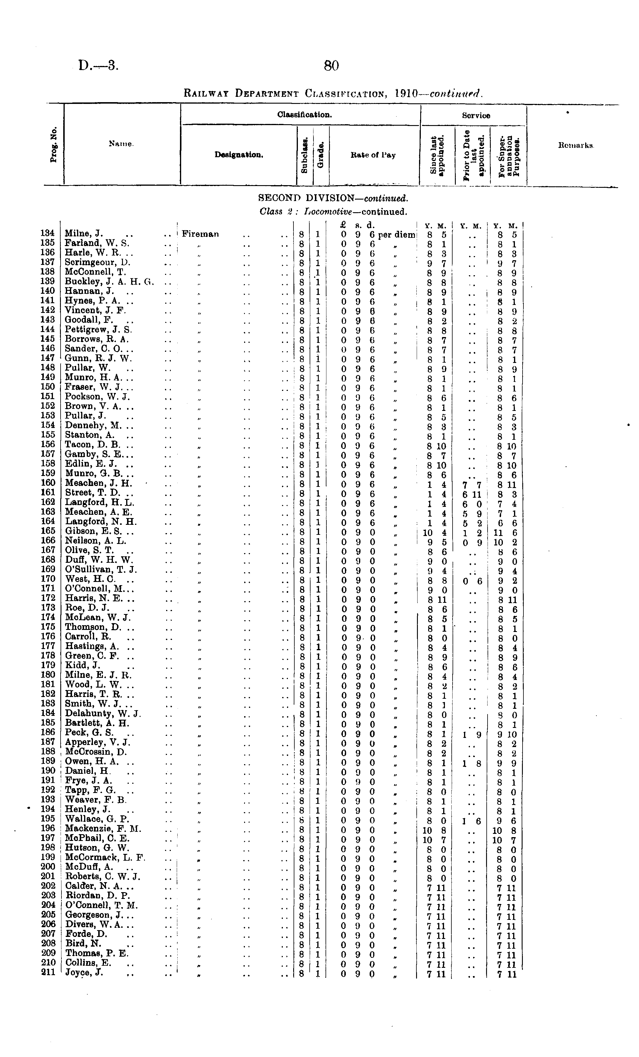 Classification. Service 6 A CO O fa a Name. Designation. CD i -3 a" S CO Rati' of Pay oj S-d 3 o fa a • 3• q 2 gSS oj.9 o*S 3«o CO " O CO 3ft 3 3, j - O fa 3 ■; a; a .2 o, o a 3 J1 * fa « fe "ft Betnarks SECON 'IV !SION— continued. Class ■> : L 0CO1 native —continued. 134 135 136 137 138 139 140 141 142 143 144 145 140 147 148 149 150 151 152 153 154 155 156 157 158 159 160 161 162 163 164 165 166 167 168 169 170 171 172 173 174 175 176 177 178 179 180 181 182 183 184 185 186 187 188 189 190 191 192 193 194 195 196 197 198 199 200 201 202 203 204 205 206 207 208 209 210 211 Milne, J. Farland, W. 8. Harle, W. R. .. Scrimgeour, 1). McConnell, T. Buckley, J. A. H. G. Hannan, J. Hynes, P. A. Vincent, J. F. Goodall, F. .. Pettigrew, J. S. Borrows, R. A. Sander, CO... Gunn, R. J. W. Pullar, W. Munro, H. A. .. Fraser, W. J. .. Pockson, W. J. Brown, V. A. Pullar, J. Dennehy, M. .. Stanton, A. Tacon, D. B. Gamby, S. E... Edlin, E. J. .. Munro, G. B. .. Meachen, J. H. Street, T. D. Langford, H. L. Meachen, A. E. Langford, N. H. Gibson, E. S. Neilson, A. L. Olive, S. T. Duff, W. H. W. O'Sullivan, T. J. West, H. G. O'Connell, M... Harris, N. E. Roe, D. J. McLean, W. J. Thomson, D. .. Carroll, R. Hastings, A. .. Green, C F. Kidd, J. Milne, E. J. R. Wood, L. W. Harris, T. R. Smith, W. J. .. Delahunty, W. J. Bartlett, A. H. Peck, G. S. Apperley, V. J. McCrossin, D. Owen, H. A. Daniel, H. Frye, J. A. Tapp, F. G. Weaver, F. B. Henley, J. Wallace, G. P. Mackenzie, F. M. MoPhail, 0. E. Hutson, G. W. McCormack, L. F. McDuff, A. .. Roberts, 0. W. J. Calder, N. A. .. Riordan, D. P. O'Connell, T. M. Georgeson, J. .. Divers, W. A. Forde, D. Bird, N. Thomas, P. E. Collins, E. Joyce, J. . . Fireman .. | 8 8 3 8 8 8 8 8 8 8 8 8 8 8 8 8 8 8 8 8 8 8 8 8 8 8 8 8 8 8 8 8 .8 8 8 8 8 8 8 8 8 8 8 8 3 8 8 a 8 8 8 8 8 8 8 8 8 8 8 8 8 8 8 8 8 8 8 8 8 a 8 8 8 8 8 8 8 8 £ s. d. Y. M. 0 9 6 per diem 8 5 0 9 6 , 8 1 0 9 6 „ 8 3 0 9 6 „ 9 7 0 9 6 „ 8 9 0 9 6 „ 8 8 0 9 6 „ 8 9 0 9 6 8 1 0 9 0 „ 8 9 0 9 0 „ 8 2 0 9 6 „ 8 8 0 9 6 „ 8 7 0 9 6 „ ; 8 7 0 9 6 „ 8 1 0 9 6 „ 8 9 0 9 6 . 8 1 0 9 6 8 1 0 9 6 8 6 0 9 6 „ 8 1 0 9 6 „ 8 5 0 9 6 „ 8 3 0 9 6 „ 8 1 0 9 6 „ 8 10 0 9 6 „ 8 7 0 9 6 „ 8 10 0 9 6 , 8 0 0 9 6 „ 14 0 9 6 „ 14 0 9 6 „ 14 0 9 6 , 14 0 9 6 „ 14 0 9 0 „ 10 4 0 9 0 „ 9 5 0 9 0 „ 8 6 0 9 0 „ 9 0 0 9 0 „ ,94 0 9 0 „ .88 0 9 0 . 9 0 0 9 0 , 8 11 0 9 0 . 8 6 0 9 0 „ 8 5 0 9 0 . 8 1 0 9 0 „ 8 0 0 9 0 „ 8 4 0 9 0 „ 8 9 0 9 0 „ 8 6 0 9 0 . 8 4 0 9 0 „ 8 2 0 9 0 „ ! 8 1 0 9 0 „ 8 1 0 9 0 „ |80 0 9 0 . 8 1 0 9 0 „ 8 1 0 9 0 . 8 2 0 9 0 „ 8 2 0 9 0 „ 8 1 0 9 0 „ 8 1 0 9 0 „ 8 1 0 9 0 . 8 0 0 9 0 , 8 1 0 9 0 . j 8 1 0 9 0 , 8 0 0 9 0 „ 10 8 0 9 0 „ 10 7 0 9 0 „ 8 0 0 9 0 , 8 0 0 9 0 „ 8 0 0 9 0 „ 8 0 0 9 0 . 7 11 0 9 0 „ 7 11 0 9 0 „ 7 11 0 9 0 . 7 11 0 9 0 7 11 0 9 0 „ 7 11 0 9 0 . 7 11 0 9 0 . 7 11 0 9 0 „ 7 11 0 9 0 „ 7 11 Y. M. Y. M. .. 8 5 .. ! 8 1 8 3 9 7 ..8 9 8 8 8 9 8 1 8 9 8 2 8 8 ..8 7 ..[87 .. | 8 1 8 9 8 1 8 1 8 6 8 1 8 5 8 3 8 1 8 10 8 7 8 10 8 6 7 7 8 11 6 11 8 3 6 0 7 4 5 9 7 1 5 2,66 1 2 i 11 6 0 9 ! 10 2 8 6 9 0 9 4 0 6 9 2 9 0 .. I 8 11 .. ; 8 6 ..'85 .. ! 8 1 .. | 8 0 .. j 8 4 8 9 8 0 8 4 8 2 8 1 ..8 1 8 0 8 1 19 9 10 8 2 8 2 18 9 9 8 1 8 1 8 0 8 1 8 1 16 9 6 10 8 10 7 8 0 8 0 8 0 8 0 7 11 7 11 7 11 7 11 7 11 7 11 7 11 7 11 7 11 7 11