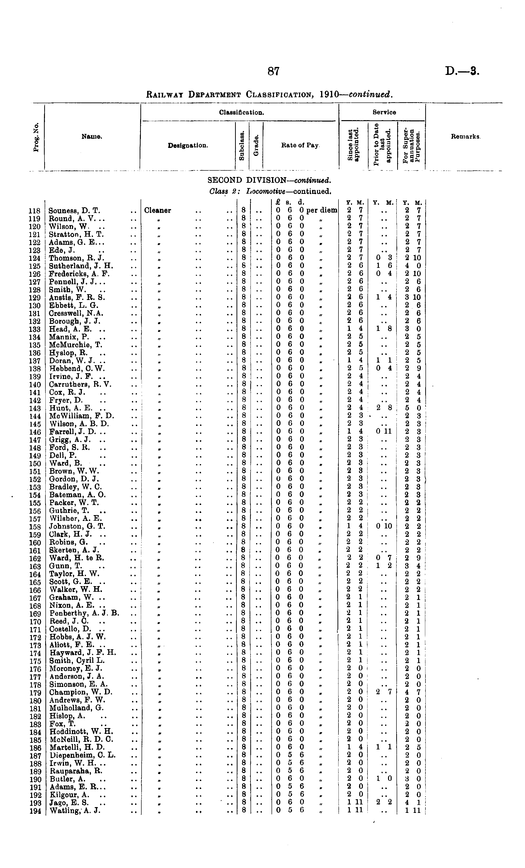 Claei itflci tion. Service 6 I Name. i n i X O Bate of Pay n Li Hi il *I| 5H aft g & h = b Remarks Designation. SECOS )IV] :si ION — continued. Souness, D. T. Round, A. V. .. Wilson, W. .. Stratton, H. T. Adams, 6. E... Ede, J. Thomson, R. J. Sutherland, J. H. Fredericks, A. F. Pennell, J. J. .. Smith, W. Anstis, F. E. S. Ebbett, h. G. Cresswell, N.A. Borough, J. J. Head, A. E. .. Mannix, P. McMurohie, T. Hyslop, R. Doran, W. J. .. Hebbend.C.W. Irvine, J. F. .. Carruthers, R. V. Cox, R. J. Fryer, D. Hunt, A. E. .. McWilliam, F. D. Wilson, A. B. D. Farrell, J. D. .. Grigg, A. J. .. Ford, S. R. .. Dell, P. Ward, B. Brown, W.W. Gordon, D. J. Bradley, W. C. Bateman, A. 0. Packer, W. T. (Juthrie, T. .. Wilsber, A. E. Johnston, G. T. Clark, H. J. Robins, G. Skerten, A. J. Ward, H. te R. Gunn, T. Taylor, H. W. Scott, G. E. Walker, W. H. Graham, W. .. Nixon, A. E. .. Penberthy, A. J. B. Reed, J. C. Costello, D. .. Hobbs, A. J. W. Allott, F. E. .. Hay ward, J. F. H. Smith, Cyril L. Moroney, E. 3. Anderson, J. A. Simonson, E. A. Champion, W. D. Andrews, F. W. Mulholland, G. Hislop, A. Fox, T. Hoddinott, W. H. McNeill, R. D. C. Martelli, H. D. Diepenheim, C. L. Irwin, W. H. .. Rauparaha, R. Butler, A. Adams, E. R... Kilgour, A. Jago, E. S. .. Watling, A. J. Class I : I, lOCO, itive —continued. 118 119 120 121 122 123 124 125 126 127 128 129 130 131 132 133 134 135 136 137 138 139 140 141 142 143 144 145 14G 147 148 149 150 151 152 153 154 155 156 157 158 159 160 161 162 163 164 165 166 167 168 169 170 171 172 173 174 175 17G 177 178 179 180 181 182 183 184 185 186 187 188 189 190 191 192 193 194 Cleaner 8 8 s 8 8 8 8 8 8 8 8 8 8 8 8 8 8 8 8 8 S 8 8 8 8 8 8 8 8 8 8 8 8 8 8 8 8 8 8 8 8 8 8 8 8 8 8 8 8 8 8 8 8 8 8 8 8 8 8 8 8 8 8 8 8 8 8 8 8 8 8 8 8 8 8 8 8 £ s. d. 0 G 0 per diem 0 6 0 0 G 0 0 6 0 0 6 0 0 G 0 0 6 0 0 6 0 0 6 0 0 6 0 0 6 0 0 6 0 0 6 0 0 6 0 0 6 0 0 6 0 0 6 0 0 6 0 0 G 0 0 6 0 „ 0 G 0 0 6 0 0 6 0 0 6 0 0 6 0 0 6 0 0 6 0 0 6 0 0 6 0 0 G 0 0 6 0 0 6 0 0 G 0 0 6 0 0 6 0 0 6 0 0 6 0 0 6 0 0 6 0 0 0 0 0 6 0 0 6 0 0 6 0 0 6 0 0 6 0 0 6 0 0 6 0 0 6 0 0 6 0 0 6 0 0 6 0 0 6 0 0 6 0 0 6 0 0 6 0 „ I 0 6 0 0 6 0 0 6 0 0 6 0 0 6 0 0 6 0 0 6 0 0 6 0 0 0 0 0 6 0 0 6 0 0 6 0 0 6 0 0 6 0 0 5 6 0 5 6 0 5 6 0 6 0 0 5 6 0 5 6 0 6 0 0 0 6 Y. M. Y. M. ! Y. M. 2 7 .. 2 7 2 7 .. 2 7 2 7 .. 2 7 2 7 ..2 7 2 7 .. 2 7 2 7 .. 2 7 2 7 0 3 ' 2 10 2 6 1 6 i 4 0 2 6 0 4 ! 2 10 2 6 ..2 6 2 6 ..2 6 2 6 14 3 10 2 6 .. 2 6 2 6 .. 2 6 2 6 .. 2 6 14 18 3 0 2 5 .. 2 5 2 5 .. 2 5 2 5 .. 2 5 14 11 2 5 2 5 0 4 2 9 2 4 .. 2 4 2 4!.. 24 2 4 .. 2 4 2 4 .. 2 4 2 4 2 8 5 0 2 3- ..23 2 3 .. 2 3 14 0 11 2 3 2 3 i .. 2 3 2 3 .. 2 3 2 3 2 3 2 3 ..2 3 2 3 ..2 3 2 3' .. 23 2 3.. 2 3 2 3 .. 2 3 2 2 .. 2 2 2 2: .. 22 2 2 .. 2 2 1 4 0 10 2 2 2 2 .. 2 2 2 2 .. 2 2 2 2 .. ! 2 2 2 2 0 7 2 9 2 2 12 3 4 2 2 .. 2 2 2 2 .. 2 2 2 2 .. 2 2 2 1 .. 2 1 2 1.. 2 1 2 1 .. 2 1 2 1 .. 2 1 2 1 i .. 2 1 2 1 .. 2 1 2 1 .. 2 1 2 1 .. 2 1 2 1 .. 2 1 2 0 .. 2 0 2 0 .. 2 0 2 0 .. 2 0 2 0 i 2 7 4 7 2 0 .. 2 0 2 0 .. 2 0 2 0 .. 2 0 2 0 .. 2 0 2 0 .. 2 0 2 0 .. 2 0 14 11 2 5 2 0 .. 2 0 2 0 .. 2 0 2 0 .. 2 0 2 0 10 3 0 2 0 .. 2 0 2 0 .. 2 0 1 11 2 2 4 1 1 11 ! .. 1 11 m • •