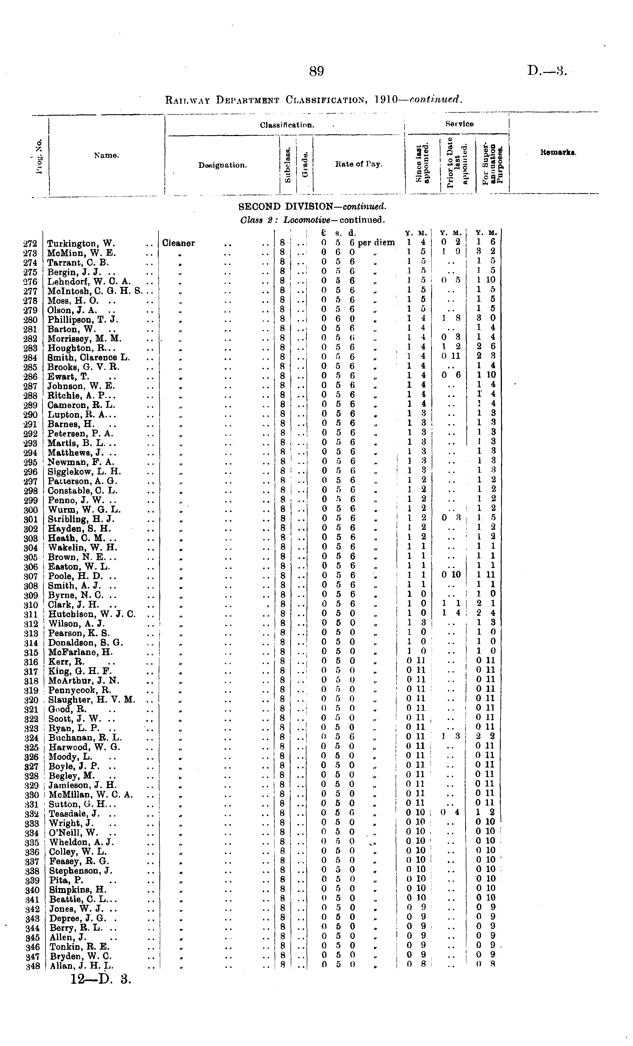 Classification. 8ecvice I 6 Z ■-' 5 '—< Name. OB B Designation. *c V Rate of F:iy. 5 j oj * , a I d r-j fa a . j 8 2 I a - a-2" Remarks. la i i°e "II QQ SECOND E iIVISION— continued. Turkington, W. MoMinn, W. E. Tarrant, C B. Bergin, J. J. .. Lehndorf, W. 0. A. Mcintosh, C. G. H. S. .. Moss, H. 0. .. Olson, J. A. Phillipson, T. J. Barton, W. Morrissey, M. M. Houghton, R... Smith, Clarence L. Brooks, G. V. R. Ewart, T. Johnson. W. E. Ritchie, A. P... Cameron, R. L. Lupton, R. A... Barnes, H. Petersen, P. A. Martis, B. L. .. Matthews, J. .. Newman, F. A. Sigglekow, L. H. Patterson, A. G. Constable, 0. L. Penno, J. W. .. Wurm, W. G. L. Siribling, H. J. Hayden, S. H. Heath, CM... Wakelin, W. H. Brown, N. E. .. Easton, W. L. Poole, H. D. .. Smith, A. J. .. Byrne, N. C .. Clark, J. H. .. Hutchison, W. J. C. .. Wilson, A. J. Pearson, K. S. Donaldson, S. G. McFarlane, H. Kerr, R. King, G. H. F. MoArthur, J. N. Pennycook, R. Slaughter, H. V. M. Good, R. Scott, J. W. .. Ryan, L. P. .. Buchanan, R. L. Harwood, W. G. Moody, L. Boyle, J. P. .. Begley, M. .. Jamieson, J. H. McMillan, W. C A. Sutton, G. H... Teasdale, J. .. Wright, J. O'Neill, W. .. Wheldon, A. J. Colley, W. L. Feasey, R. G. Stephenson, J. Pita, P. Simpkins, H. Beattie, C L... Jones, W. J. .. Depreo, J. G. . Berry, R. L. .. Allen, J. Tonkin, R. E. Bryden, W. C. Allan, J. H. L. C/Viss 2: Li ocomotive— continued. 272 273 274 275 276 277 278 279 280 281 282 283 284 285 286 287 288 289 290 291 292 293 294 295 296 297 298 299 800 301 302 303 304 305 306 307 308 309 310 311 312 313 314 315 316 317 318 319 320 321 322 323 324 325 326 327 328 329 330 331 382 333 334 886 330 337 338 339 340 841 342 343 344 345 346 347 848 .. Cleaner S. .. .. 8 ! Q ..8 1 Q ..8 .. 8: o • .. 8; ..8 o ..8 a .. 8 ..8 O ..8 ..8 a ..8 ..8 ..8 a ..8 ..8 ..8 o .. 8 O ..8 a ..8 ..8 o .. 8 a •• •• 2 ..8 a ! ..8 a ' .. 8 ..8 Q . . 8 ..8 ..8 o " •• 2 .. 8 a ! ..8 a ..8 ..8 a ..8 a .. 8 ..8 a 8 8 8 8 8 8 8 8 8 8 8 8 8 8 8 8 8 8 8 8 8 8 8 8 8 8 8 8 8 8 a 8 8 8 8 8 8 8 8 8 8 B 8 8 8 8 B 8 8 8 8 8 8 8 8 8 8 8 8 8 8 a 8 .8 8 8 8 8 8 8 8 8 8 8 8 8 8 t s. d. 0 5 6 per diem 0 6 0 0 5 6 0 5 (i 0 5 6 ..I 0 5 6 0 5 6 0 5 6 0 6 0 ..; 0 5 6 ..I 0 5 6 .. 0 5 6 0 5 0 0 5 6 0 5 6 0 5 6 0 5 6 0 5 6 0 5 6 0 5 6 0 5 6 0 5 6 0 5 6 0 5 6 0 5 6 0 5 6 0 5 6 0 5 6 0 5 6 0 5 6 0 5 6 0 5 6 0 5 6 0 5 6 0 5 6 0 5 6 0 5 6 0 5 6 0 5 6 0 5 0 0 5 0 0 5 0 0 5 0 0 5 0 .. 0 5 0 .. II 5 0 0 5 0 0 5 0 0 5 0 o 5 0 0 5 0 0 5 0 '15 6 0 5 0 0 5 0 0 5 0 0 5 0 0 5 0 0 5 0 0 5 0 0 5 6 0 5 0 0 5 0 0 5 0 ,„ 0 5 0 0 5 0 0 5 0 0 5 0 0 5 0 II 5 0 0 5 0 0 5 0 O 5 0 0 5 0 0 5 0 0 5 0 0 5 0 Y. M. j Y. M. Y. M. I 14 0 2 16 1 5 1 9 8 2 15 .. 1 5 16 .. 15 I 5 0 6 1 10 15 .. 15 15 .. 15 15 .. 15 14 18 3 0 14 .. 14 II 0 3 14 14 12 2 6 14 0 11 2 3 14 .. 14 14 0 6 1 10 14 .. 14 14 .. 14 14 .. 3 4 18 .. 13 13 .. 13 13 13 13 .. 13 13 .. 13 13 .. 13 13 .. 18 12 .. 12 12 .. 12 12 .. 12 12 .. 12 12 0 3 15 12 ..12 12 .. 12 11 .. 11 11 .. 11 11 .. 11 11 0 10 1 11 11 11 10 .. 10 10 11:21 10 14 2 4 13 .. 13 10 .. 10 ,10 .. 10 10 .. io i o ii o ii ! 0 11 .. ; 0 11 ! 0 11 0 11 0 11 .. 0 11 j 0 11 .. 0 11 ! o ii .. o n 0 11 .. 0 11 ; 0 11 .. 0 11 0 11 13 2 2 I 0 11 .. 0 11 Ion 1 .. o n o n .. o 11 ; o n .. o 11 i o n .. o n : o ii .. o n ' 0 11 .. 0 11 0 10 0 4 12 o io .. o io 0 10 .. 0 10 ; 0 10 .. ; 0 10 0 10 0 10 j 0 10 .. 0 10 0 10 .. 0 10 0 10 0 10 1 0 10 .. 0 10 0 10 .. 0 10 0 9 .. I 0 9 0 9 0 9 0 9 .. 0 9 .09 .. 09 0 9 .. 0 9. 0 9 .. J 0 9 I 0 8 . ..0 8 .8 a ..8 t, ..8 o .. 8 a ..8 a ..8 a ..8 a ..8 a .. 8 a ..8 a '-. .. 8 a ..8 ..8 a ..8 o ..8 a ..8 a ..8 a .. 8 O .. 8 Q . . j B ..8 a . .. 8 a ..8 .. 8 O ..8 o ..8 O .. 8 O ..8 a ..8 ..8 a ..8 a ..8 a ..8 .. 8 a ..8 .. 8 a ..8 a .. 8 a .. 8 Q .. H