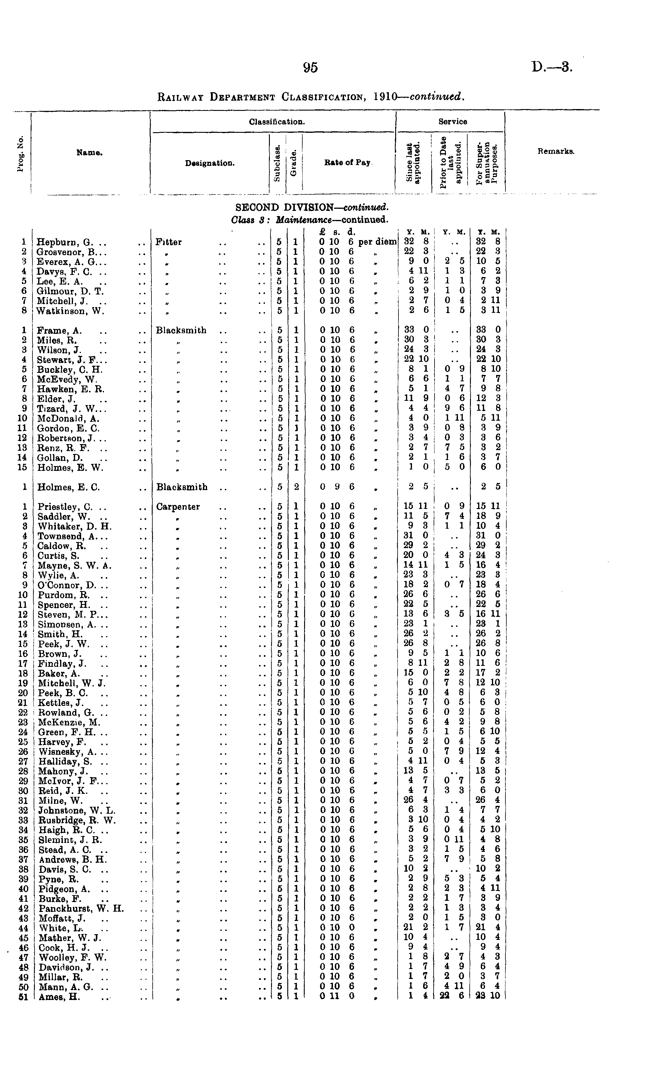 0 z I Name. ClilS! jifi cation. a » I 1 i ■S-α Iβ T3 & 9 »i |2 . fi 2 8J1 Rate of Pay g| Sgf g g 8, Service Designation. Remarks. SECON Class 3: m> D DIV] Mainte 5 1 5 1 5 1 5 1 5 1 5 1 5 1 5 1 tint ISION—continued. enancc—continued. £ S. d. Y. M. ! Y. M. T. M. 0 10 6 per diem 32 8 .. 32 8 0 10 6 „ 22 3 .. 22 3 0 10 6 » |90 25 10 5 0 10 6 . I 4 11 13 62 0 10 0 „ i62 11 73 0 10 6 . 29 10 39 0 10 6 . 12 7 04 2 11 0 10 6 . 26 15 3 11 1 2 3 4 5 (1 7 8 1 2 3 4 5 6 7 8 Hepburn, G. .. Grosvenor, B... Everex, A. G... Davys. P. C. Lee, E. A. Gilmour, D. T. Mitchell, J. .. Watkinson, W. Fitter 5 5 5 5 5 5 5 5 1 1 1 1 1 1 1 1 1 2 3 4 5 6 7 8 9 10 11 12 13 14 15 1 2 8 4 5 (i 7 8 9 10 11 12 18 U IB Frame, A. Miles, R. Wilson, J. Stewart, J. F... Buckley, C. H. McEvedy, W. Hawken, E. R. Elder, J. Tizard, J. W... McDonald, A. Gordon, E. C. Robertson, J. .. Renz, R. F. Gollan, D. Holmes, E. W. Blacksmith 5 5 5 5 5 B 5 5 5 5 5 5 5 5 5 5 1 5 1 5 1 5 1 5 1 5 1 5 1 5 1 5 1 5 1 5 I 5 1 5 1 5 1 5 1 1 1 1 1 1 1 1 1 1 1 1 1 1 1 1 0 10 6 „ 33 0 .. 33 0 0 10 6 „ 30 3 i .. 30 3 0 10 6 „ I 24 3 I .. 24 3 0 10 6 . i 22 10 .. 22 10 0 10 6 . ! 8 1 0 9 8 10 0 10C . 66 11 77 0 10 6 . 5147 98 0 10 6 . 11 9 0 6 12 3 0 10 6 „ 4 4 9 6 11 8 0 10 G . 4 0 i 1 11 5 11 0 10 6 . 39 08 39 0 10 6 . ! 3 4 03 36 0 10 6 . 12775 32 0 10 6 . [21 16 37 0 10 6 , 10 5 0 60 1 1 Holmes, E. C. Blacksmith 5 5 2 2 0y6 . 2 5.. 25 1 2 3 4 5 6 8 9 10 11 12 18 14 15 J 16 ! 17 18 IS 20 21 2'; 23 24 ! 25 ! 26 j 27 28 ; 29 i 30 31 32 33 34 35 36 37 38 39 40 41 42 ! 43 ! 44 j 45 I 46 47 48 49 50 51 1 2 8 4 5 6 8 9 10 11 12 18 14 16 Iβ 17 IB IS 20 •21 22 28 24 25 26 27 28 2!) 30 :-ii 89 88 34 35 86 37 38 39 40 41 42 43 41 4fi 4i; 47 48 49 50 51 Priestley, C. .. Saddler, W. .. Whitaker, D. H. Townsend, A. .. Caldow, R. .. Curtis, S. Mayne, S. W. A. Wylie, A. ! O'Connor, D. .. Purdom, R. .. Spencer, H. .. Steven, M. P... Simonsen, A. .. Smith, H. . Peek, J. W. Brown, J. , Findlay, J. Baker, A. Mitchell, W. J. Peek, B. C. Kettles, J. Rowland, G. .. McKenzie, M. ! Green, F. H. .. Harvey, F. .. i Wisnesky, A. .. Halliday, S. .. ; Mahony, J. : Mclvor, J. F... Reid, J. K. .. Milne, W. ' Johnstone, W. L. Rusbridge, R. W. Haigh, R. C. Slemint, J. R. Stead, A. C. Andrews, B. H. Davis, S. C. .. Pyne, R. Pidgeon, A. Burke, F. j Panckhurst, W. H. i Moffatt, J. White, Li Mather, W. J. Cook, H. J. Woolley, F. W. Davidson, J. .. Millar, R. Mann, A. G. Ames, H. Carpenter 5 5 5 5 5 5 5 5 5 5 5 5 5 5 5 5 5 5 5 5 5 5 5 5 5 5 5 5 5 5 5 5 5 5 5 5 5 5 5 5 5 5 5 5 5 5 5 5 5 5 5 5 1 5 1 5 1 5 1 5 1 5 1 5 I 1 5 I 1 5 1 5 1 5 1 5 1 5 1 5 1 5 1 5 1 5 1 5 1 5 1 5 1 5 1 5 1 5 1 5 1 5 1 5 1 5 1 5 1 5 1 5 1 5 1 5 1 5 1 5 1 5 1 5 1 5 1 5 1 5 1 5 1 5 1 5 1 5 1 5 1 5 1 5 1 5 1 5 1 5 1 5 1 5 1 1 1 1 1 1 1 I 1 I 1 1 1 1 1 1 1 1 1 1 1 1 1 1 1 1 1 1 1 1 1 1 1 1 1 1 1 1 1 1 1 1 1 1 1 1 1 1 1 1 1 1 1 1 0 10 6 „ 15 11 ! 0 9 15 11 0 10 6 . 11 5 i 7 4 18 9 0 10 6 . 9 3 ! 1 1 10 4 0 10 6 „ 31 0 .. 31 0 0 10 6 . 29 2 : .. 29 2 0 10 6 „ 20 0 4 3 24 3 0 10 6 „ 14 11 , 1 5 16 4 0 10 6 . 23 3 I .. 23 3 0 10 6 „ 18 2 ! 0 7 18 4 0 10 6 . 26 G .. 26 6 0 10 6 „ 22 5 .. 22 5 0 10 6 „ 13 6 3 5 16 11 0 10 6 , I 23 1 i .. 23 1 0 10 6 . i 26 2 .. 26 2 0 10 6 „ 26 8 .. 26 8 0 10 6 . 95 11 10 6 0 10 6 „ 8 11 2 8 11 6 0 10 6 „ 15 0 2 2 17 2 0 10 6 „ 6 0 7 8 12 10 0 10 6 „ 5 10 4 8 6 3 0 10 6 . 57 05 60 0 10 6 . 56 02 58 0 10 6 „ 56 42 98 0 10 6 „ 5 5 1 5 6 10 0 10 6 „ ,52 04 55 0 10 G „ 5 0 7 9 12 4 0 10 6 „ 4 11 0 4 5 3 0 10 6 . 13 5 .. 13 5 I 0 10 6 » 47 07 52 0 10 6 . 47 33 60 0 10 6 „ 26 4 .. 26 4 0 10 6 „ 63 14 77 0 10 6 . 3 10 04 42 0 10 6 „ 56 04 5 10 0 10 6 „ 3 9 0 11 4 8 0 10 6 „ 32 15 46 0 10 6 . 52 79158 0 10 6 . 10 2 .. 10 2 0 10 6 . 29 53 54 0 10 6 . 28 23 4 11 0 10 6 . 22 17139 0 10 6 . | 2 2 13 34 0 10 6 , 20 15 30 0 10 0 . 21 2 1 7 21 4 0 10 6 . 10 4 .. 10 4 0 10 6 , 19 4! .. 94 0 10 6 „ 18 27 43 0 10 6 „ 17 49 64 0 10 6 . il7 20 37! 0 10 6 . 16 4 11 6 4 0 11 0 . i 1 4 22 6 23 10 0 . . . • v • • • • * • - • •
