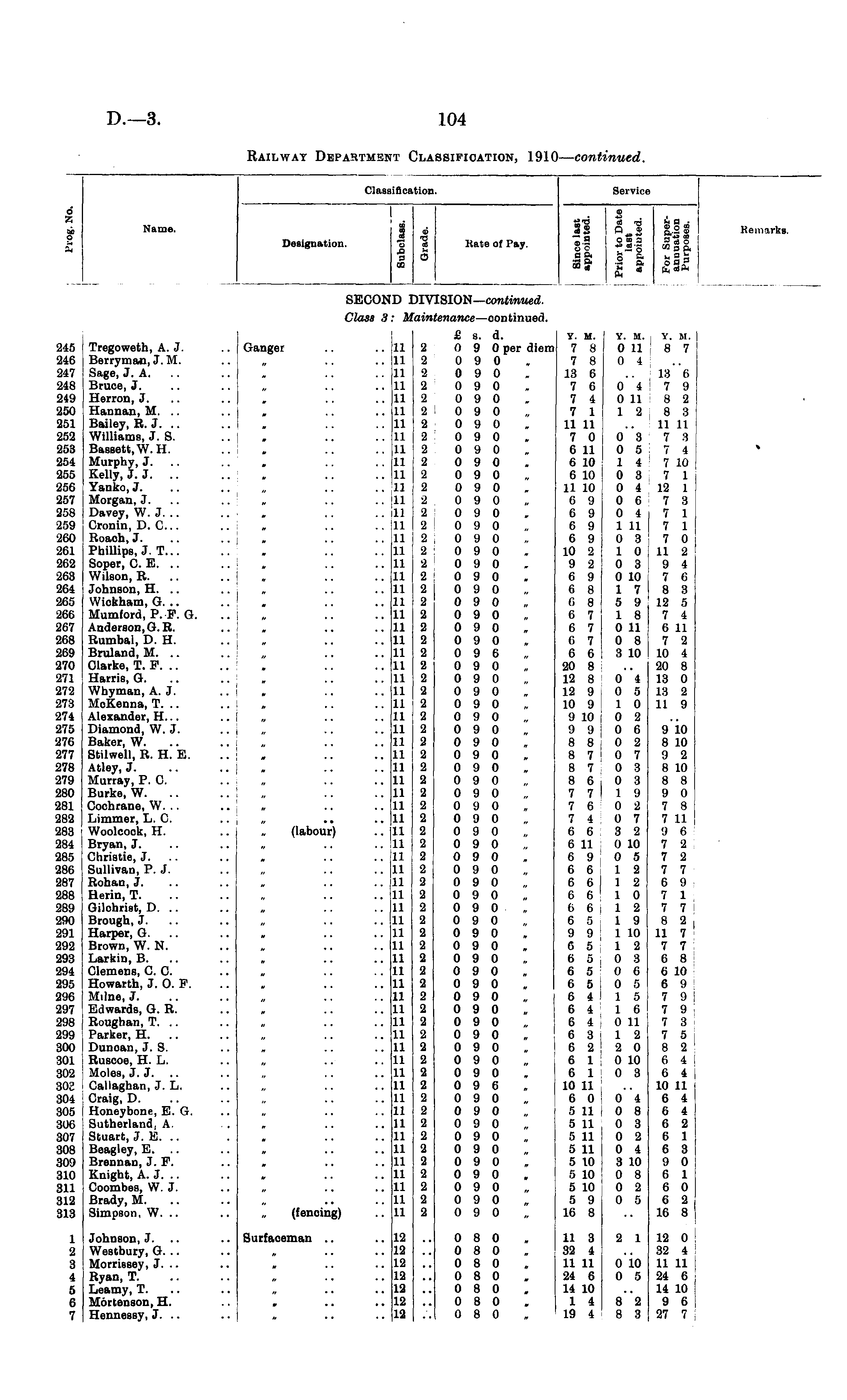 Classification. Service d * a Name. Designation. ' J ' : 3 2 CO Rate of Pay. OJ S'O « •a 32 ojs _ Q O on 3 I 1 3 | ass i ™ <B O COSB, I 111 Remarks. SECON DIVISION— continued. Tregoweth, A. J. Berryman, J. M. : Sage, J. A. Bruce, J. Herron, J. Hannan, M. .. Bailey, R. J. Williams, J. S. Bassett.W.H. i Murphy, J. Kelly, J. J. .. , Yanko, J. : Morgan, J. j Davey, W.J... Cronin, D. C... Roach, J. Phillips, J. T... Soper, 0. E. Wilson, R. .. Johnson, H. .. Wickham, G. .. Mumford, P. F. G. Anderson, G. R. Rumbal, D. H. Bruland, M. .. j Clarke, T. F. .. I Harris, G. j Whyman, A. J. MoKenna, T. .. Alexander, 11... Diamond, W. J. Baker, W. Stilwell, R. H. E. Atley, J. Murray, P. C Burke, W. Cochrane, W. .. Limmer, L. G. j Woolcock, H. ' Bryan, J. Christie, J. Sullivan, P. J. Rohan, J. Herin, T. Gilchrist, D. .. Brough, J. Harper, G. Brown, W. N. Larkin, B. j Clemens, C. G. I Howarth, J. O. F. I Milne, J. ; Edwards, G. R. Roughan, T. .. Parker, H. : Dunoan, J. S. | Ruscoe, H. L. Moles, J. J. Callaghan, J. L. Craig, D. Honeybone, E. G. Sutherland, A. Stuart, J. E. .. Beagley, E. Brennan, J. F. i Knight, A. J. .. Coombes, W. J. Brady, M. Simpson, W. .. Ganger Class 3: laintenance —continued. £ s. d. 2 0 9 0 per diem 2 0 9 0 2 0 9 0 2 0 9 0 2 0 9 0 2 0 9 0 2 0 9 0 2 0 9 0 2 0 9 0 2 0 9 0 2 0 9 0 2 0 9 0 2 0 9 0 2 0 9 0 2 0 9 0 2 0 9 0 2 0 9 0 2 0 9 0 2 0 9 0 2 0 9 0 i 2 0 9 0 2 0 9 0 2 0 9 0 2 0 9 0 2 0 9 6 2 0 9 0 2 0 9 0 2 0 9 0 2 0 9 0 2 0 9 0 2 0 9 0 2 0 9 0 2 0 9 0 2 0 9 0 2 0 9 0 2 0 9 0 2 0 9 0 2 0 9 0 2 0 9 0 2 0 9 0 2 0 9 0 2 0 9 0 2 0 9 0 2 0 9 0 2 0 9 0, 2 0 9 0 2 0 9 0 2 0 9 0 2 0 9 0 2 0 9 0 2 0 9 0 2 0 9 0 2 0 9 0 2 0 9 0 2 0 9 0 2 0 9 0 2 0 9 0 2 0 9 0 2 0 9 6 2 0 9 0 2 0 9 0 2 0 9 0 2 0 9 0 2 0 9 0 2 0 9 0 2 0 9 0 2 0 9 0 2 0 9 0 2 0 9 0 Y. M. 7 8 7 8 13 6 7 6 7 4 7 1 11 11 7 0 6 11 6 10 6 10 11 10 6 9 6 9 6 9 6 9 10 2 9 2 6 9 6 8 6 8 6 7 6 7 6 7 6 6 20 8 12 8 12 9 10 9 9 10 9 9 8 8 8 7 8 7 8 6 7 7 7 6 7 4 6 6 6 11 6 9 6 6 6 6 6 6 6 6 6 5 9 9 6 5 6 5 6 5 6 5 6 4 6 4 6 4 6 3 6 2 6 1 6 1 10 11 6 0 5 11 5 11 5 11 5 11 5 10 5 10 5 10 5 9 16 8 Y. M. 0 11 0 4 Y. M. 8 7 245 246 247 248 249 250 251 252 253 254 255 256 257 258 259 260 261 262 263 264 265 266 267 268 269 270 271 272 273 274 275 276 277 278 279 280 281 282 283 284 285 286 287 288 289 11 11 11 11 11 11 11 11 11 11 11 11 11 11 11 11 11 11 11 11 11 11 11 11 11 11 11 11 11 11 11 11 11 11 11 11 11 11 11 11 11 11 11 11 11 11 11 11 11 11 11 U 11 11 11 11 11 11 11 11 11 11 11 11 11 11 11 11 11 0 4 0 11 1 2 0 8 0 5 1 4 0 3 0 4 0 6 0 4 1 11 0 3 1 0 0 3 0 10 1 7 5 9 1 8 0 11 0 8 3 10 0 4 0 5 1 0 0 2 0 6 0 2 0 7 0 3 0 3 1 9 0 2 0 7 3 2 0 10 0 5 1 2 1 2 1 0 1 2 1 9 1 10 1 2 0 3 0 6 0 5 1 5 1 6 0 11 1 2 2 0 0 10 0 3 13 6 7 9 8 2 8 3 11 11 7 3 7 4 7 10 7 1 12 1 7 3 7 1 7 1 7 0 11 2 9 4 7 6 8 3 12 5 7 4 6 11 7 2 10 4 20 8 13 0 13 2 11 9 9 10 8 10 9 2 8 10 8 8 9 0 7 8 7 11 9 6 7 2 7 2 7 7 6 9 7 1 i 7 7 8 2 , 11 7 7 7 6 8 6 10 6 9 7 9 7 9 7 3 7 5 8 2 ' 6 4 6 4 10 11 6 4 6 4 6 2 6 1 6 3 9 0 6 1 6 0 6 2 16 8 » (labour) 291 292 293 294 295 296 297 298 299 300 301 302 302 304 305 300 307 308 309 310 311 312 313 0 4 0 8 0 3 0 2 0 4 3 10 0 8 0 2 0 5 (fencing) : 1 2 3 4 5 6 7 Johnson, J. Westbury, G. .. Morrissey, J. .. Ryan, T. Leamy, T. Mortenson, H. Hennessy, J. .. Surfaceman .. 12 12 12 12 12 12 12 0 8 0 0 8 0 0 8 0 0 8 0 0 8 0 0 8 0 0 8 0 11 3 32 4 11 11 24 6 14 10 1 4 19 4 2 1 o'io 0 5 12 0 32 4 11 11 24 6 14 10 9 6 27 7 8 - 2 8 3