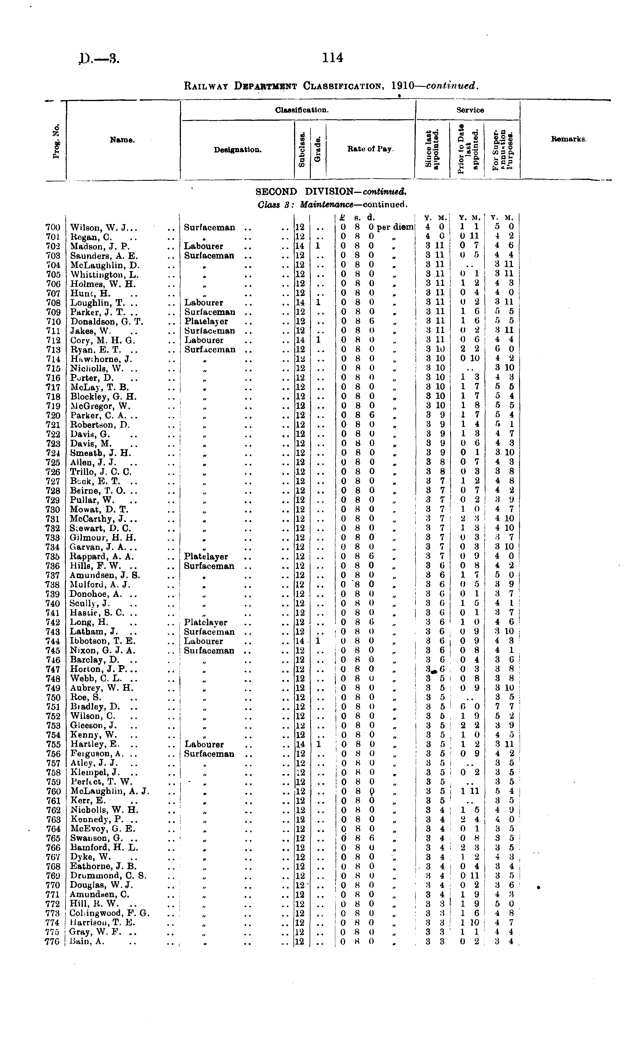 Claai ufication. Service 6 SB i i-< p. Name. Designation. 00 £ "0 a a S O CO Raw of Tay. OJ ■£■2 « 'a k 9« a • o ® oj o g " S h. S ft S % 0J.9 O oj 3 S r O wo ** * o coaft 3 a a— a, •- a >- 35 ft .2 a 0 3 3 Remarks. secon: avis: [ON— continued. Class 3 linteru ince —continued. 700 701 702 703 704 705 706 707 708 709 710 711 712 713 714 715 716 717 718 719 720 721 722 723 724 725 726 727 728 729 730 731 732 733 734 735 736 737 738 739 740 741 742 743 744 745 716 747 748 749 750 751 752 753 754 755 756 757 758 759 760 761 762 763 764 765 766 767 768 769 770 771 772 773 774 775 770 Wilson, W. J... Regan, C. Madson, J. P. Saunders, A. E. McLaughlin, D. Whiltington, L. Holmes, W. H. Hum, H. Loughlin, T. .. Parker, J. T. .. Donaldson, G. T. Jakes, W. Cory, M. H. G. Ryan. E. T. .. Hdwihorne, J. Nicholls, W. .. Porter, D. MoLay, T. B. Blockley, G. H. McGregor, W. Parker, C A. .. Robertson, D. Davis, G. Davis, M. Smeath, J. H. Allen, J. J. Trillo, J. C. C. Buck, E. T. .. Beirne, T. O. .. Pullar, W. .. Mowat, D. T. McCarthy, J. .. S;owart, D. C Gilmour, H. H. Garvan, J. A. .. Rappard, A. A. Hills, F. W. .. Amundsen, J. S. Mulforu, A. J. Donohoe, A. .. Scully, J. Hastie, S. C. Long, H. Latham, J. Ibbotson, T. E. Nixon, G. J. A. Barclay, D. .. Horton, J. P. .. Webb, CL, Aubrey, W. H. Roe, S. Biadley, D. .. Wilson, C. Gleeson,J. Kenny, W. .. Hartley, E. .. Feiguson, A. .. Alley, J. J. Kleinpel, J. Perfect, T. W. McLaughlin, A. J. Kerr, E. Nicholls, W. H. Kennedy, P. .. McEvoy, G. E. Swan son, G. Bamford, H. L. Dyke, W. Eathorne, J. B. Druminond, C S. Douglas, W.J. Amundsen, C Hill, It. W. .. Col.ingwood, F. G. Harrison, T. K. flray, W. F. .. Bain, A. " ! • • | • • : .. Surfaceman .. Labourer Surfaceman .. Labourer Surfaceman .. Platelayer Surfaceman .. Labourer Surfaceman .. Platelayer Surfaceman .. Platelayer Surfaceman .. Labourer Sutfaceman .. : :: Labourer Surfaceman .. ,. i 12 12 14 12 12 12 12 12 14 12 12 12 14 12 12 12 12 12 12 12 12 12 12 12 12 12 12 12 12 12 12 12 12 12 12 12 12 12 12 12 12 12 12 12 14 12 12 12 12 12 12 12 12 12 12 14 12 12 12 12 12 12 12 12 12 12 12 12 12 12 12' 12 12 12 12 12 12 i i £ s. d. 0 8 0 per diem 0 8 0 0 8 0 0 8 0 0 8 0 0 8 0 0 8 0 0 8 0 0 8 0 0 8 0 0 8 6 0 8 0 0 8 0 0 8 0 0 8 0 0 8 0 0 8 0 0 8 0 0 8 0 0 8 0 0 8 6 0 8 0 0 8 0 0 8 0 0 8 0 0 8 0 0 8 0 0 8 0 0 8 0 0 8 0 0 8 0 0 8 0 OHO 0 8 0 0 8 0 OHO 0 8 0 0 8 0 0 8 0 0 8 0 0 8 0 OHO 0 8 6 0 8 0 OHO 0 8 0 OHO 0 8 0 0 8 0 o 8 0 0 8 0 0 8 0 0 8 0 0 8 0 0 8 0 0 8 0 0 8 0 OHO OHO OHO OHO OHO OHO 0 8 0 OHO 0 8 6 0 8 0 OHO OHO OHO 0 8 0 0 .8 0 OHO 0 8 0 0 8 0 0 8 0 OHO Y. M. 4 0 4 0 3 11 3 11 3 11 3 11 3 11 3 11 3 11 3 11 3 11 3 11 3 11 3 10 3 10 3 10 3 10 3 10 3 10 3 10 3 9 3 9 3 9 3 9 3 9 3 8 3 8 3 7 3 7 3 7 3 7 3 7 3 7 3 7 3 7 3 7 3 6 3 6 3 6 3 6 3 6 3 6 3 6 3 6 3 6 3 6 3 6 8*6 3 5 3 5 3 5 3 5 3 5 3 5 3 5 3 5 3 5 3 5 3 5 3 5 3 5 3 5 3 4 3 4 3 4 3 4 3 4 3 4 3 4 3 4 3 4 3 4 3 3 3 3 3 3 3 3 3 3 Y. If. 1 1 0 11 0 7 0 5 II 1 1 2 0 4 0 2 1 0 1 6 0 2 0 0 2 2 0 10 1 3 1 7 1 7 1 8 1 7 1 4 1 3 0 6 0 I 0 7 0 3 1 2 0 7 0 2 1 0 2 3 1 3 0 3 0 3 0 9 0 8 1 7 0 5 0 1 1 5 0 1 1 0 0 9 0 9 0 8 0 4 0 3 0 8 0 9 Y. M. 5 0 4 2 4 6 4 4 3 11 3 11 4 3 4 0 3 11 5 5 5 5 3 11 4 4 0 0 4 2 3 10 4 3 5 5 5 4 5 5 5 4 5 1 4 7 4 3 3 10 4 3 3 8 4 8 4 2 3 9 4 7 4 10 4 10 3 7 3 10 4 0 4 2 5 0 3 9 8 7 4 1 3 7 4 6 3 10 4 8 4 1 3 6 3 8 3 8 8 10 3 5 7 7 5 2 3 9 4 5 3 11 4 2 3 5 3 5 8 5 5 4 3 5 4 9 4 0 3 5 3 5 3 5 4 3 3 4 3 5 3 6 4 3 5 0 4 8 4 7 4 4 3 4 i 6 0 1 9 2 2 1 0 1 2 0 9 i 0"2 111 1 5 2 4 0 1 0 H 2 3 1 2 0 4 0 11 0 2 1 9 1 9 1 6 1 10 1 1 0 2 •