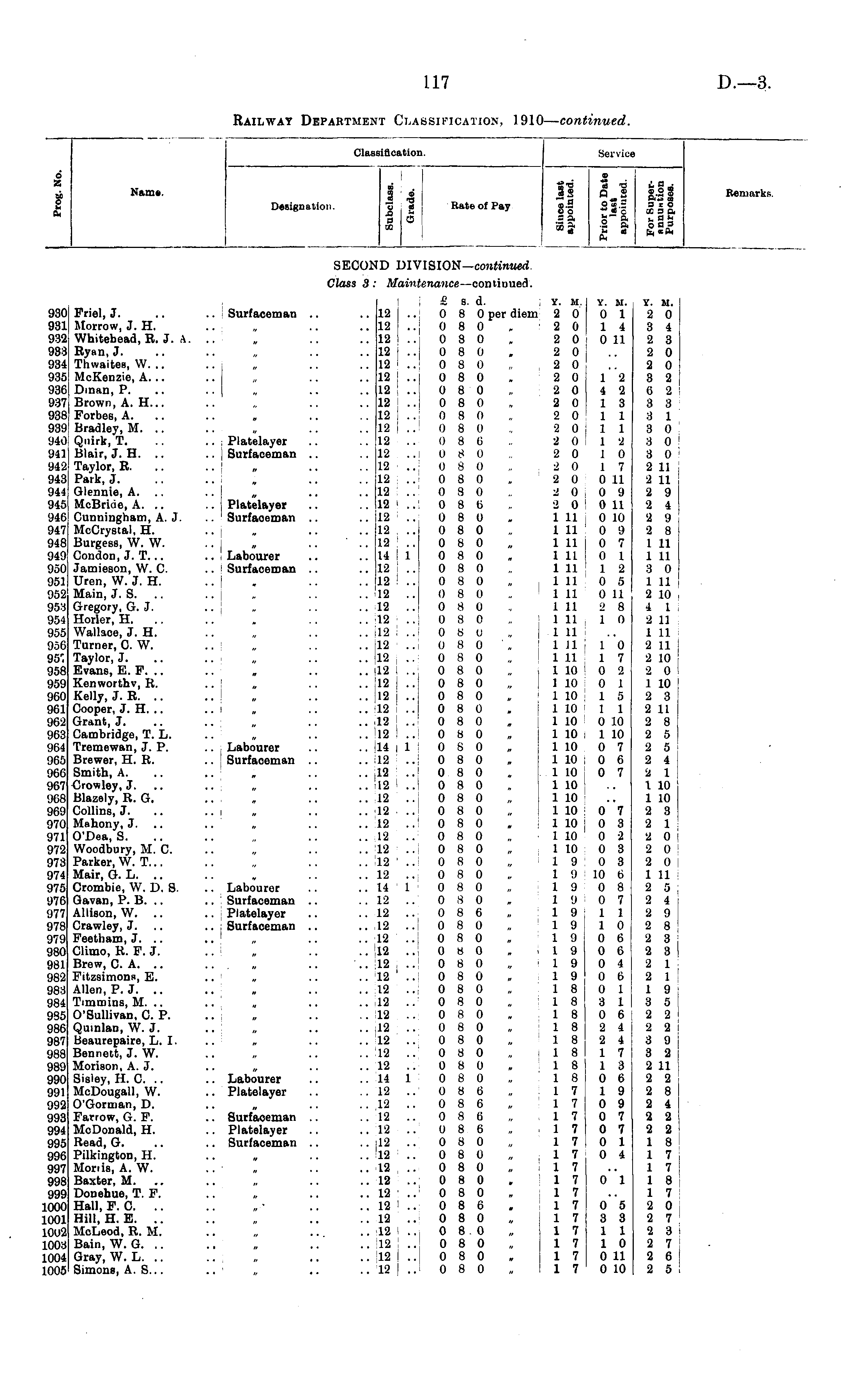 Classification. Service d A o'c C £ Nam*. Designation. 3 • % 5 CO Rate of Pay OJ ■g-o oi a ii. a ■ 3 2 D • ".2 8 ~ S . h. s ft 3 8 o.9 o«- a x o O O f * c CO 3 ft 8ft Sft fa a a a; ft .2 a o a 3 • fa ol ps, a ft ft Remarks SECOND DIVISION— continued Class 3: Maintenance —contiuued. 930j 93l| 932 933 934 935 936 937 938 939 940 911 942 943 944 945 946 947 948 949 950 951 952 953 954 955 956 95, 958 959 960 961 962 963 964 965 966 967 968 969 970 971 972 973 974 975 976 977 978 979 980 981 982 983 984 985 986 987 988 989 990 991 992 993 994 995 996 997 998 999 1000 1001 1002 1003 1004 1005 Friel, J. Morrow, J. H. Whitehead, R. J. A. Ryan, J. Thwaites, W. .. McKenzie, A... Dinan, P. Brown, A. H... Forbes, A. Bradley, M. .. Quirk, T. Blair, J. H. .. Taylor, R. Park, J. Glennie, A. McBririe, A. .. Cunningham, A. J. McCrystal, H. Burgess, W. W. Condon, J. T... Jamieson, W. C. Uren, W. J. H. Main, J. S. Gregory, G. J. Horler, H. .. Wallace, J. H. Turner, C W. Taylor, J. Evans, E. F. Kenworthv, R. Kelly, J. R. Cooper, J. H. .. Grant, J. Cambridge, T. L. Tremewan, J. P. Brewer, H. R. Smith, A. Crowley, J. Blazely, R. G. Collins, J. Mahony, J. O'Dea, S. Woodbury, M. C. Parker, W. T... Mair, G. L. Crombie, W. D. S. Gavan, P. B. Allison, W. Crawley, J. Feetham, J. .. Climo, R. F. J. Brew, C.A. Fitzsimons, E. Allen, P. J. .. Timmins, M. .. O'Sullivan, C P. Quinlan, W. J. Beaurepaire, L. I. Bennett, J. W. Morison, A. J. Sisley, H. 0. .. McDougall, W. O'Gorman, D. Farrow, G. F. McDonald, H. Read, G. Pilkington, H. Monis, A. W. Baxter, M. Donehue, T. F. Hall, F. 0. Hill, H. E. .. McLeod, R. M. Bain, W. G. Gray, W. L. Simons, A. S... .. Surfaceman .. .. Platelayer .. Surfaceman .. Platelayer Surfaceman .. .. Labourer Surfaceman .. Labourer .. | Surfaceman .. .. Labourer .. Surfaceman .. Platelayer .. Surfaceman .. .. Labourer .. Platelayer .. Surfaceman .. Platelayer .. Surfaceman .. £ S. d. Y. M. I Y. 51. .. 12 .., 0 8 0 per diem 2 0 I 0 1 ..12 ..! 0 8 0 2 0 j 1 4 ..12 ..' 0 8 0 . 2 0 i 0 11 ..12 ..; 080 . 20! ..12 ..' 0 8 0 „ 2 0 .. 12 ■ .. 0 8 0 . 2 0 12 .. 12 .. 0 8 0 ,. 2 0 4 2 .. 12 .. 0 8 0 . 2 0 18 .. 12 .. 0 8 0 . 2 0 11 .. 12 .. 0 8 0 „ 2 0 11 .. 12 .. 0 8 6 2 0 12 ..12..: 080 20 10 .. 12 .. 0 8 0 ,. 2 0 17 ..12 .. 0 8 0 . 2 0 0 11 .. 12 ' ..' 0 8 0 2 0 0 9 ..12 .. 0 8 6 2 0 ii II .. 12 .. 0 8 0 . 1 11 0 10 .. 12 .. 0 8 0 1 11 0 9 ' .. 12 ' .. 0 8 0 „ 1 11 0 7 .. 14 1 0 8 0 . 1 11 0 1 .. 12 I .. 0 8 0 „ 1 11 12 .. 12 I .. 0 8 0 „ 1 11 0 5 .. 12 .. 0 8 0 ,. j 1 11 Oil .. 12 .. OHO 1 11 28 .. 12 .. 0 8 0 1 11 1 0 ..12 .. 0 8 0 „ | 1 11 .. 12 .. 0 8 0 ' „ 1 11 I 1 0 .. 12 .. 0 8 0 . 1 11 17 .. 12 .. 0 8 0 „ i 1 10 0 2 .. 12 .. 0 8 0 „ ; 1 10 0 1 .. 12 .. 0 8 0 . 1 10 15 .. 12 .. 0 8 0 . 1 10 i 1 1 .. 12 .. 0 8 0 . 1 10 0 10 .. 12 .. OHO „ ! 1 10 1 10 .. 14 . 1 0 8 0 „ ! 1 10 0 7 .. 12 ' ... 0 8 0 „ 1 1 10 0 0 .. 12 .. 0 8 0 . I 1 10 0 7 .. 12 .. 0 8 0 . 1 10 .. 12 .. 0 8 0 „ 1 10 ..12 .. 0 8 0 „ 1 10 0 7 ..12 ..' 0 8 0 „ 1 10 0 3 .. 12 I .. 0 8 0 „ 1 10 0 2 .. 12 .. 0 8 0 „ 1 10 0 3 .. 12 ' ... 0 8 0 „ 19 0 3 .. 12 .. 0 8 0 „ 1 9 10 0 .. 14 1 0 8 0 . 19 0 8 .. 12 .. 0 8 0 . 19 0 7 ..12.. 086 „ 19 11 ..12 .. : 0 8 0 , 19 10 .. 12 .. 0 8 0 „ 19 0 6 .. 12 .. OHO . 19 06 .. 12 .. OHO „ 19 04 ..12'.. 080 . 19 06 .. 12 .. 0 8 0 . 18 0 1 .. 12 I .. 0 8 0 „ 18 3 1 .12.. 080 . 18 06 .. ,12 .. 0 8 0 „ 18 2 4 .. 12 .. 0 8 0 „ 18 2 4 .. 12 .. 0 8 0 „ 18 17 .. 12 .. 0 8 0 „ 18 13 ..14 1 080 . 18 06 ,. 12 < .. 0 8 6 . 17 19 .. 12 .. 0 8 6 „ 17 0 9 .. 12 I .. 0 8 6 „ 17 0 7 .. 12 .. 0 8 6 . 17 0 7 .. 12 j .. 0 8 0 „ 17 0 1 .. 12 .. 0 8 0 „ 17 0 4 .. 12 .. 0 8 0 „ 17 ..12.. 080 . 17 01 .. 12 .. 0 8 0 „ 17 ..12.. 086 , 17 05 .. 12 .. 0 8 0 „ 17 3 3 .. 12 .. 0 8.0 „ 17 11 .. 12 .. 0 8 0 „ 17 10 .. 12 ..: 0 8 0 „ 17 0 11 .. 12 ..: 0 8 0 . 17 0 10 Y. M. 2 0 3 4 2 3 2 0 2 0 3 2 6 2 3 3 3 1 3 0 3 0 3 0 2 11 2 11 2 9 2 4 2 9 2 8 1 11 1 11 3 0 1 11 2 10 4 1 2 11 1 11 2 11 2 10 2 0 1 10 2 3 2 11 2 8 2 5 2 5 2 4 •2 1 1 10 1 10 2 3 2 1 2 0 2 0 a o i n 2 5 2 4 2 9 2 8 2 3 2 3 2 1 2 1 1 9 3 5 2 2 2 2 3 9 3 2 2 11 2 2 2 8 2 4 2 2 2 2 1 8 1 7 1 7 1 8 1 7 2 0 2 7 2 3 2 7 2 6 2 5