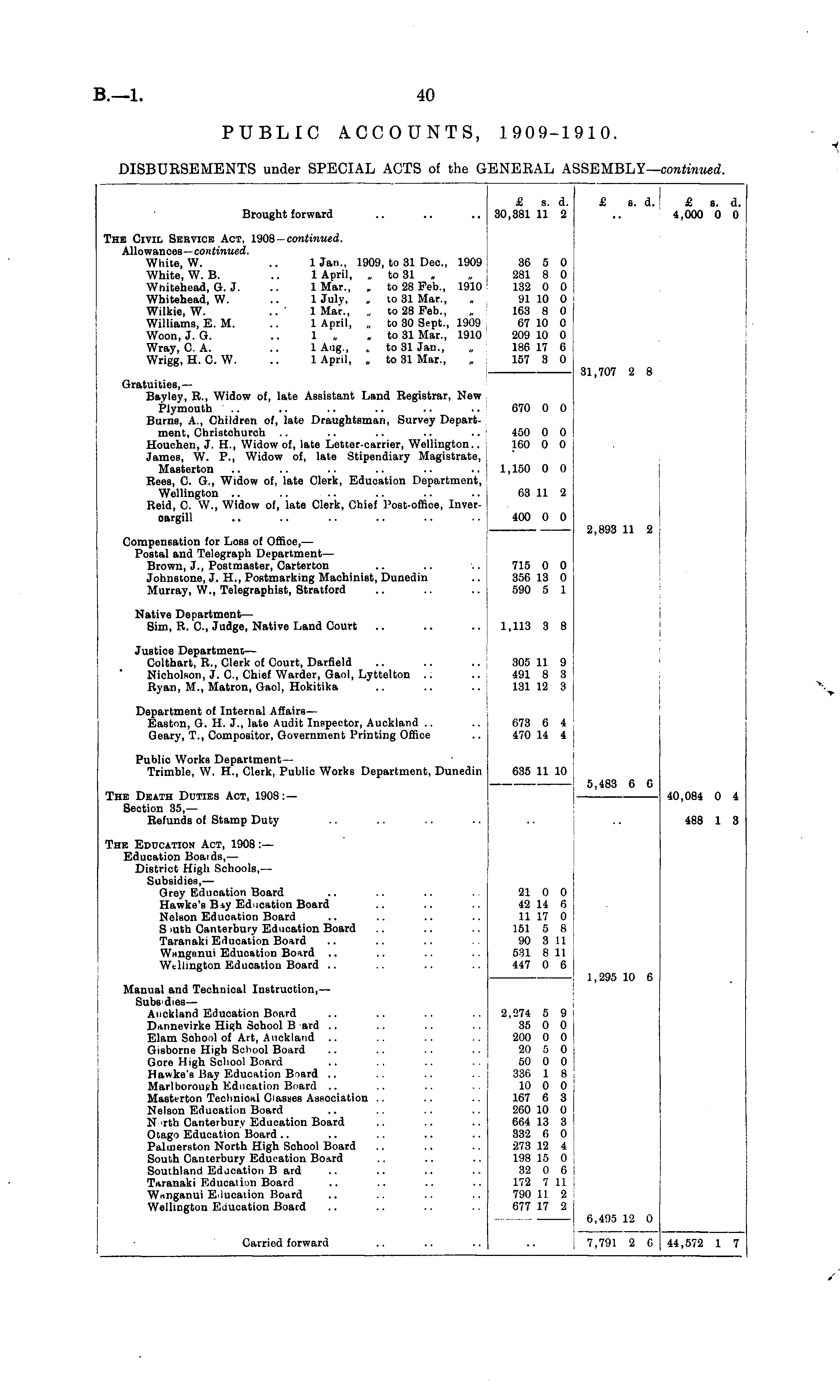 £ s. d. 30,381 11 2 £ s. d. £ s. d. 4,000 0 0 Brought forward The Civil Service Act, 1908 - continued. Allowances— continued. White, W. .. IJan., 1909, to 31 Dec, 1909 White, W. B. .. 1 April, „ to 31 . Whitehead, G. J. .. IMar., , to 28 Feb., 1910 Whitehead, W. .. 1 July, . to 31 Mar., Wilkie, W. ..' IMar., „ to 28 Feb., Williams, E. M. .. 1 April, „ to 30 Sept., 1909 Woon, J. G. .. 1 „ .to 31 Mar., 1910 Wray, C. A. .. 1 Aug., „ to 31 Jan., Wrigg, H. C. W. .. 1 April, „ to 31 Mar., 36 5 0 281 8 0 132 0 0 91 10 0 163 8 0 67 10 0 209 10 0 186 17 6 157 3 0 Gratuities, — Bayley, R., Widow of, late Assistant Land Registrar, New Plymouth Burns, A., Children of, late Draughtsman, Survey Department, Christchurch Houchen, J. H., Widow of, late Letter-carrier, Wellington.. James, W. P., Widow of, late Stipendiary Magistrate, Masterton Rees, C. G., Widow of, late Clerk, Eduoation Department, Wellington Reid, C. W., Widow of, late Clerk, Chief Post-office, Inveroargill 31,707 2 8 670 0 0 450 0 0 160 0 0 1,150 0 0 63 11 2 2,893 11 2 400 0 0 Compensation for Loss of Office, — Postal and Telegraph Department— Brown, J., Postmaster, Carterton Johnstone, J. H., Postmarking Machinist, Dunedin Murray, W., Telegraphist, Stratford 715 0 0 356 13 0 590 5 1 Native Department— Sim, R. C, Judge, Native Land Court 1,113 3 8 Justice Department— Colthart, R., Clerk of Court, Darfield Nicholson, J. O, Chief Warder, Gaol, Lyttelton Ryan, M., Matron, Gaol, Hokitika 305 11 9 491 8 3 131 12 3 Department of Internal Affairs— Easton, G. H. J., late Audit Inspector, Auckland Geary, T., Compositor, Government Printing Office 673 6 4 470 14 4 Public Works Department— Trimble, W. H., Clerk, Public Works Department, Dunedin 635 11 10 5,483 6 6 The Death Duties Act, 1908 :— Section 35, — Refunds of Stamp Duty 40,084 0 4 488 1 3 The Education Act, 1908:— Education Boaids, — District High Schools, — Subsidies, — Grey Education Board Hawke's Biy Education Board Nelson Education Board S iuth Canterbury Education Board Taranaki Education Board Wanganui Education Board Wellington Education Board 21 0 0 42 14 6 11 17 0 151 5 8 90 3 11 531 8 11 447 0 6 1,295 10 6 Manual and Technical Instruction, — Subsidies — Auckland Education Board Dannevirke High School B ard Elam School of Art, Auckland .. Gisborne High School Board Gore High School Board Hawke's Bay Education Board Marlborough Education Board .. Masterton Technioal Classes Association Nelson Education Board N >rth Canterbury Education Board Otago Education Board Palmerston North High School Board South Canterbury Education Board Southland Education B ard Taranaki Education Board Wanganui E-lucaiion Board Wellington Education Board 2,274 5 9 35 0 0 200 0 0 20 5 0 50 0 0 336 1 8 10 0 0 167 6 3 260 10 0 664 13 3 332 6 0 273 12 4 198 15 0 32 0 6 172 7 11 790 11 2 677 17 2 6,495 12 0 Carried forward 7,791 2 6 44,572 1 7