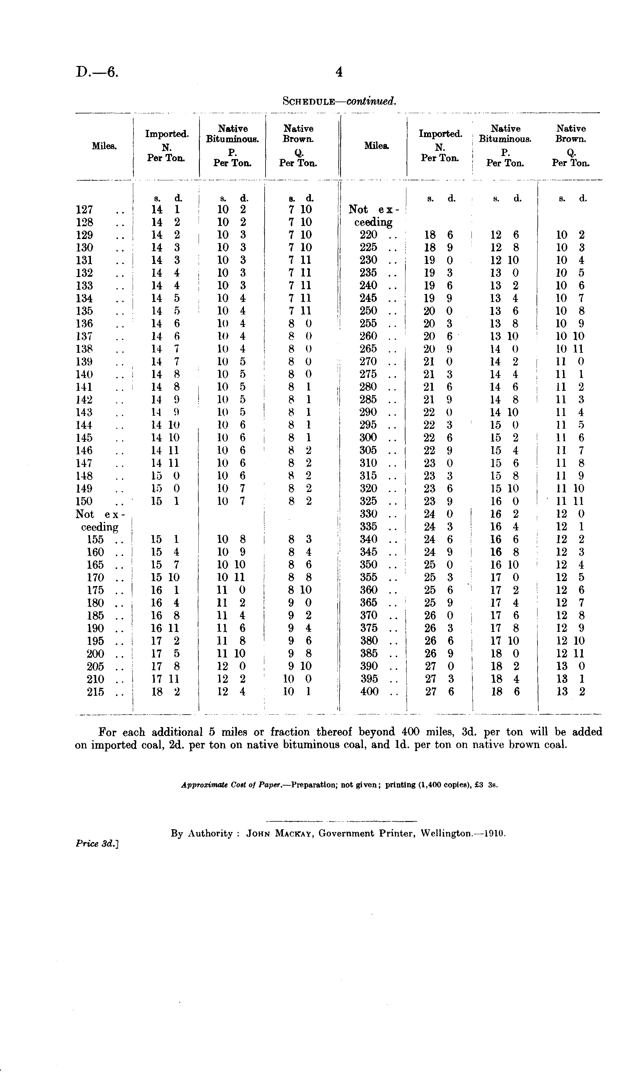 Miles. Imported. N. Per Ton. Native Bituminous. P. Per Ton. Native Brown. Q. Per Ton. Miles. t Native Native Imported. Bitummou8 . Brown N. p Q Per Ton. per Ton per i 127 128 .. 129 .. I 130 131 132 133 134 135 136 137 138 139 .. 140 .. i 141 142 143 144 145 146 147 148 14!) 150 Not exceeding 155 .. J 160 .. 165 .. J 170 .. 175 .. ! 180 .. 185 .. 190 .. 195 .. i 200 .. i 205 .. 210 .. 215 .. a. d. 14 1 14 2 14 2 14 3 14 3 14 4 14 4 14 5 14 5 14 6 14 6 14 7 14 7 14 8 14 8 14 '.) 14 9 14 10 14 10 II 11 14 11 15 0 15 0 15 1 15 1 15 4 15 7 15 10 16 1 16 4 16 8 16 11 17 2 17 5 17 8 17 11 18 2 s. d. 10 2 10 2 10 3 10 3 10 3 10 3 10 3 10 4 10 4 10 4 lo 4 10 4 10 5 10 5 10 5 K) 5 10 5 10 6 10 6 10 6 lo 6 10 6 10 7 10 7 10 8 10 9 10 10 10 11 11 0 11 2 11 4 11 6 11 8 11 10 12 0 12 2 12 4 s. d. 7 10 7 10 7 10 7 10 7 11 7 11 7 11 7 11 7 11 8 0 8 0 8 0 8 0 8 1 S 1 8 1 8 1 8 1 8 2 8 2 8 2 8 2 8 2 8 3 8 4 8 6 8 8 8 10 9 0 9 2 9 4 9 6 9 8 9 10 10 0 10 1 Not exceeding 220 .. 225 .. 230 .. 235 .. 240 .. 245 .. 250 .. 255 .. 260 .. 265 .. 270 .. 275 .. 280 .. 285 .. 290 .. 295 .. 300 .. 305 .. 310 .. 315 .. 320 .. 325 .. 330 .. 335 .. 340 .. 345 .. 350 .. 355 .. 360 .. 365 .. 370 .. 375 .. 380 .. 385 .. 390 .. 395 .. 400 .. s. d. s. d. a. d. 18 6 12 6 10 2 18 9 12 8 10 3 19 0 12 10 10 4 19 3 13 0 10 5 19 6 13 2 10 6 19 9 13 4 10 7 20 0 13 6 10 8 20 3 13 8 10 9 20 6 13 l<) 10 10 20 '.) 14 u 10 11 21 0 14 2 11 0 21 3 14 4 11 1 21 6 14 6 II 2 21 9 14 8 11 3 22 0 14 10 11 4 22 3 15 0 11 5 22 6 15 2 11 6 22 9 15 4 11 7 23 0 15 6 11 8 23 3 15 8 11 9 23 6 15 10 11 10 23 9 16 0 11 11 24 0 16 2 12 0 24 3 16 4 12 1 24 6 16 6 12 2 24 9 16 8 12 3 25 0 16 10 12 4 25 3 17 0 12 5 25 6 17 2 12 6 25 9 17 4 12 7 26 0 17 6 12 8 26 3 17 8 12 9 26 6 17 10 12 10 26 9 18 0 12 11 27 0 18 2 13 0 27 3 18 4 13 1 27 6 18 6 13 2