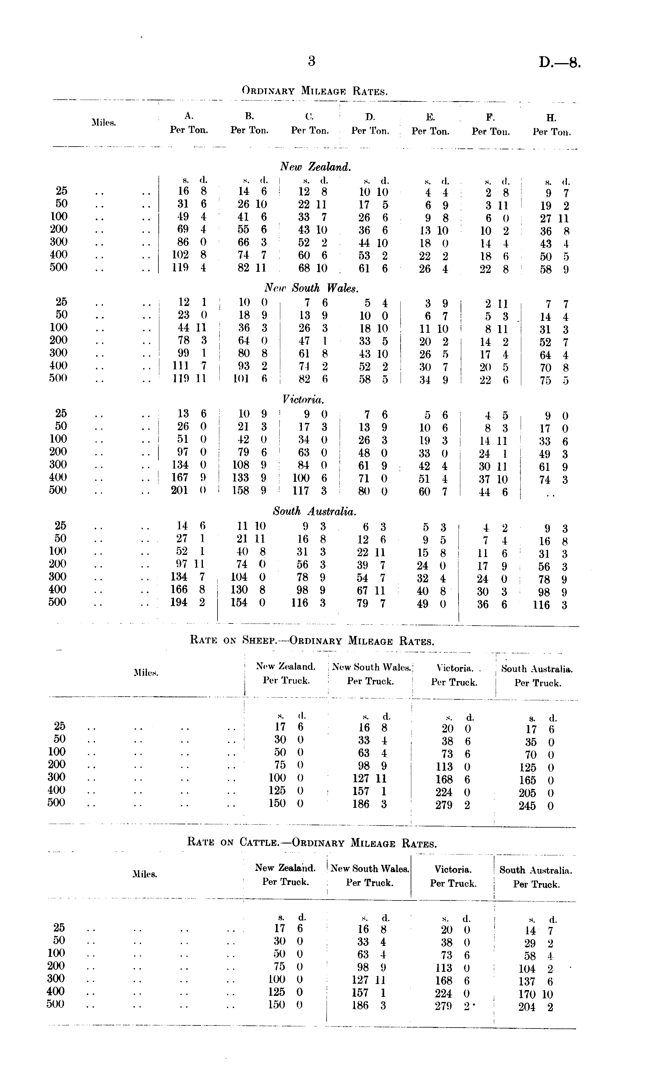 I Miles. A. Per Ton. B. C. D. Per Ton. Per Ton. Per Ton. E. Per Ton. F. Per Ton. H. Per Ton. New Zealand. 25 50 100 200 300 400 500 s. d. 16 8 31 6 19 I 69 4 86 0 102 8 119 4 s. d. I s. d. s. d. 14 6 12 8 10 10 26 10 22 11 17 5 41 6 33 7 26 6 55 6 43 10 36 6 66 3 52 2 44 10 71 7 60 6 53 2 82 11 68 10 61 6 s. d. 4 4 6 9 9 8 13 10 18 0 22 2 26 4 s. (I. 2 8 3 11 6 o 10 2 14 I 18 6 22 8 s. .1. 9 7 19 2 27 11 36 8 43 4 50 5 58 9 New South Wales. 25 50 100 200 300 400 500 12 1 23 0 44 11 78 3 99 I 111 7 119 11 j 10 0 7 6 5 4 18 9 1.3 9 10 0 36 3 26 3 18 10 64 0 47 1 33 5 80 8 61 8 43 10 93 2 71 2 52 2 lol 6 82 6 58 5 3 9 6 7 11 10 20 2 26 5 30 7 31 9 2 11 5 3 8 11 14 2 17 4 20 5 22 6 7 7 14 4 31 3 52 7 64 4 70 8 75 5 Victoria. 25 50 100 200 300 400 500 .'. 13 6 26 0 51 0 97 0 134 0 167 9 201 0 10 9 9 0 7 6 21 3 17 3 13 9 42 0 34 0 26 3 79 6 63 0 48 0 108 9 84 0 61 9 133 9 100 6 71 0 158 9 117 3 80 0 5 6 10 6 19 3 33 0 42 4 51 1 60 7 4 5 8 3 14 11 24 1 30 11 37 10 44 6 9 0 17 0 33 6 49 3 61 9 74 3 South Australia. 25 50 100 200 300 400 500 14 6 27 1 52 1 97 II 134 7 166 8 194 2 11 10 9 3 6 3 21 11 16 8 12 6 40 8 31 3 22 11 74 0 56 3 39 7 104 0 78 9 54 7 130 8 98 9 67 11 154 0 116 3 79 7 5 3 9 5 15 8 24 0 32 4 40 8 49 0 4 2 7 4 11 6 17 9 24 0 30 3 36 6 9 3 16 8 31 3 56 3 78 9 98 9 116 3