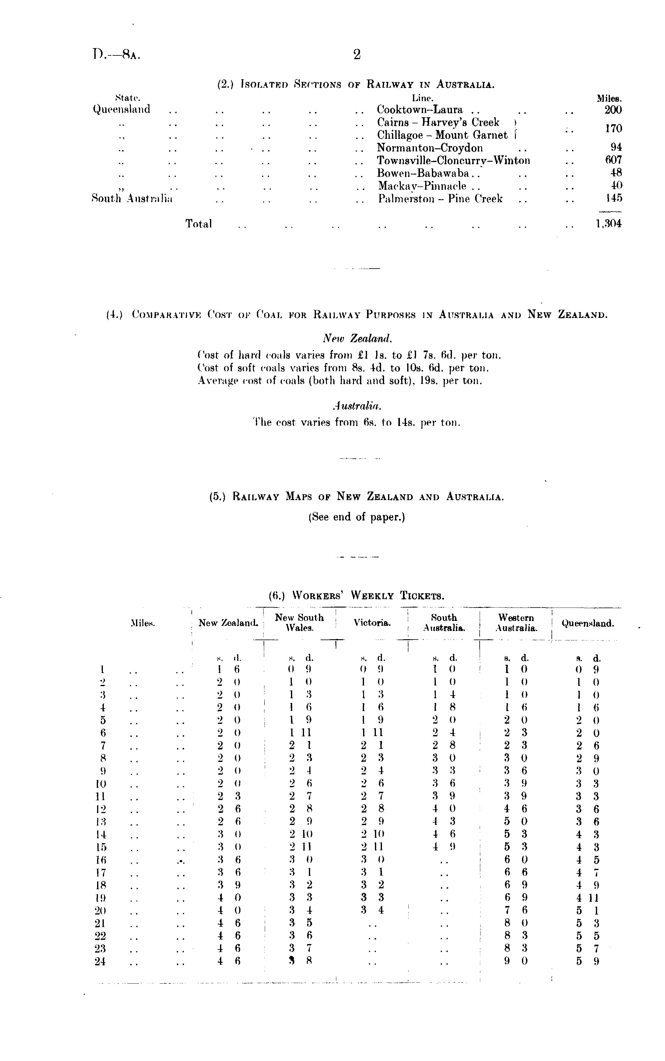 (2.) Isolated Sections of Railway in Australia. State. Line. Miles. Queensland .. .. .. .. .. Cooktown-Laura .. .. .. 200 Cairns - Harvey's Creek 1 ._„ Chillagoe - Mount Garnet f •.. . . . . Norma nton-Croydon . . . . 94 Townsville-Cloncurrv-Winton .. 607 Bowen-Babawaba.. .. .. 48 . . Mackay- Pinnacle . . . . . . 40 South Australia .. .. .. Palmerston - Pine Creek .. .. 145 Total .. .. .. .. .. .. .. .. 1.304 (4.) Comparative Cost of Coal fob Railway Purposes i\ Australia ami New Zealand. New Zealand. Cost <>1 hard coals varies from £1 Is. to £1 7s. (id. per ton. I'usl ul suit coals varies Erorrj <S S . Id. to 10s. (id. per ton. Average cost of coals (both hard and soft). 19s. per ton. Australia. The cost varies from (is. In I Is. per ton. (5.) Railway Maps of New Zealand and Australia. (See end of paper.)