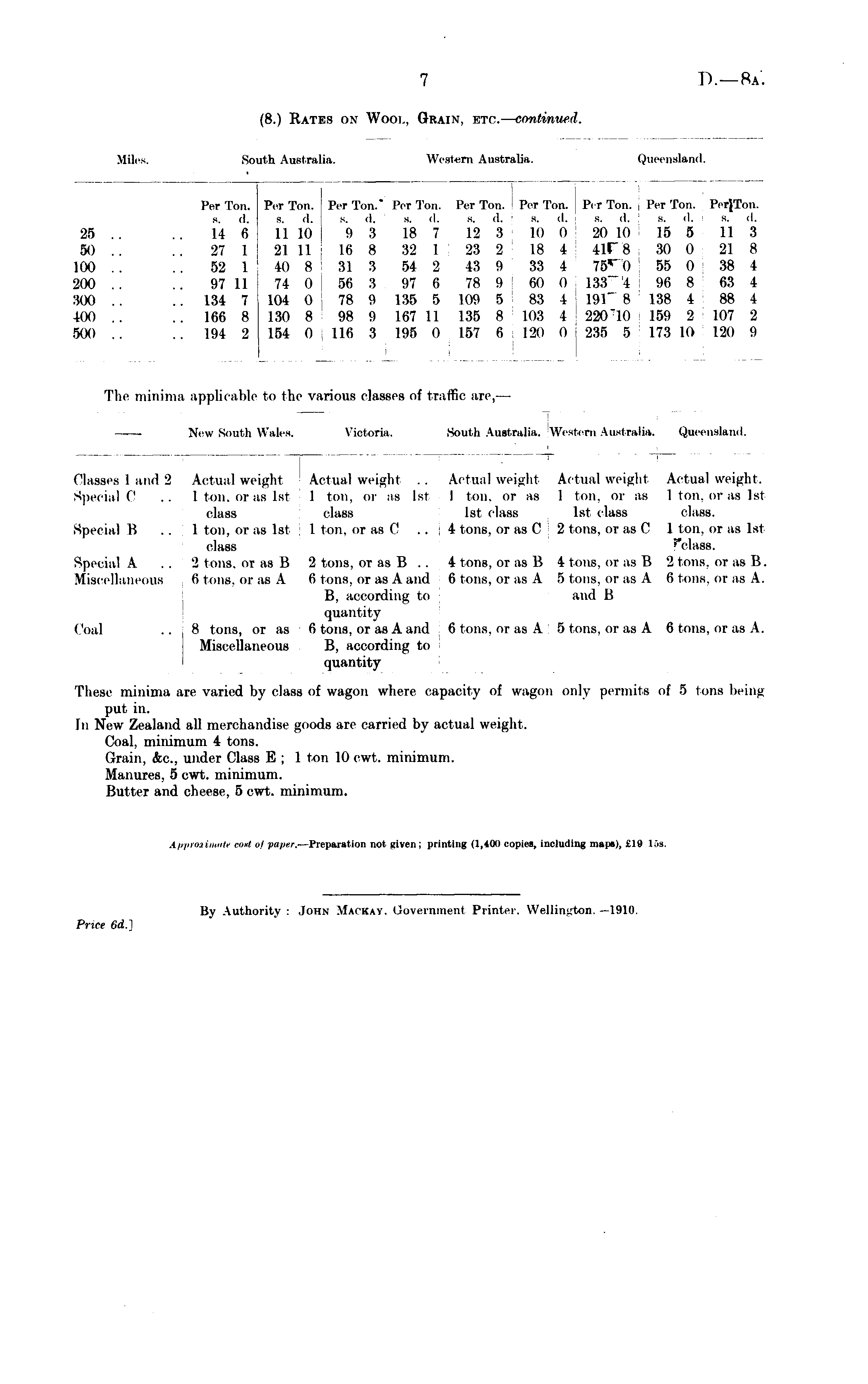 These minima arc varied by class of wagon where capacity of wagon only permits of 5 lons being put in. In New Zealand all merchandise goods are carried by actual weight. Coal, mimmum 4 tons. Grain, &c, under Class E ; 1 ton 10 cwt. minimum. Manures, 5 cwt. minimum. Butter and cheese, 5 cwt. minimum. Approximate eott «/ paper. —Preparation not given ; printing (1,40(1 copies, including maps), £19 10s.