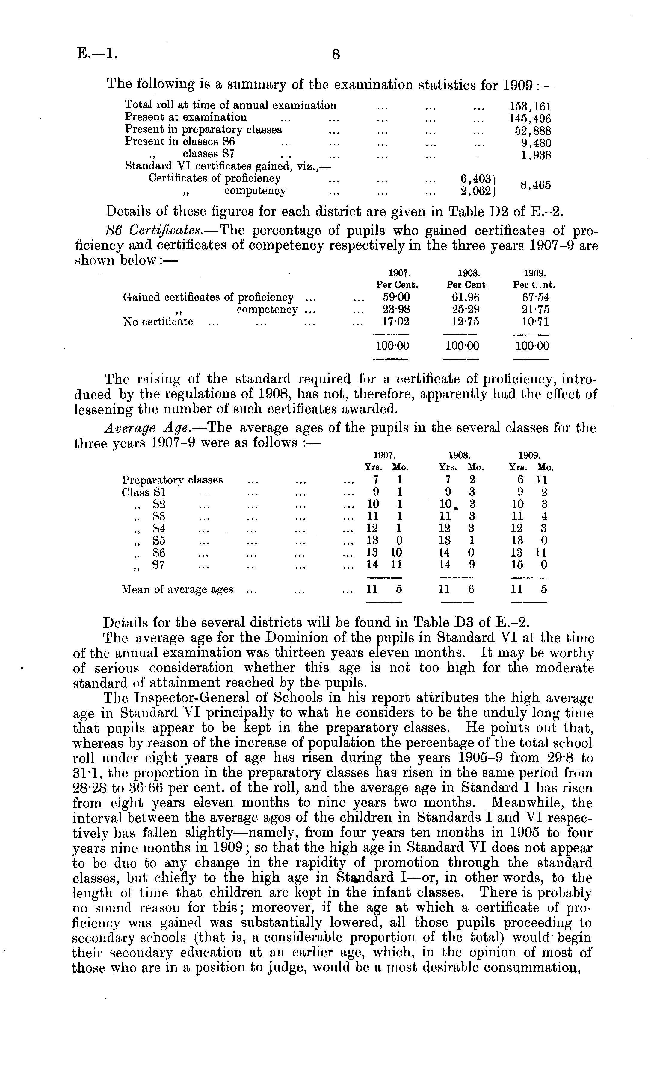 The following is a summary of the examination statistics for 1909 : — Total roll at time of annual examination ... ... ... 153,161 Present at examination ... ... ... ... ... 145,496 Present in preparatory classes ... ... ... ... 52,888 Present in classes S6 ... ... ... ... ... 9,480 classes S7 ... ... ... ... 1.938 Standard VI certificates gained, viz.,— Certificates of proficiency ... ... ... 6,4031 „ .„. competency ... ... ... 2,062) ' ° Details of these figures for each district are given in Table D 2 of E.-2. S6 Certificates. —The percentage of pupils who gained certificates of proficiency and certificates of competency respectively in the three years 1907-9 are shown below:— 1907. 1908. 1909. Per Cent. Per Cent. Per C.nt. Gained certificates of proficiency ... ... 59-00 61.96 67-54 competency ... ... 23-98 25-29 21-75 No certificate ... ... ' ... ... 17-02 12-75 1071 10000 10000 10000 The raising of the standard required for a certificate of proficiency, introduced by the regulations of 1908, has not, therefore, apparently had the effect of lessening the number of such certificates awarded. Average Age. —The average ages of the pupils in the several classes for the three years 1907-9 were as follows :-— 1907. 1908. 1909. Yrs. Mo. Yrs. Mo. Yrs. Mo. Preparatory classes ... ... ... 7 1 7 2 611 Class SI ... ... ... ... 9 1 9 3 9 2 „ S2 ... ... ... ... 10 1 10. 3 10 3 „ S3 ... ... ... ... 11 1 11 3 11 4 ~ S4 ... ... ... ... 12 1 12 3 12 3 „ S5 13 0 13 1 13 0 „ S6 ... ... ... ... 13 10 14 0 13 11 „ S7 14 11 14 9 15 0 Mean of average ages ... ... ... 11 5 11 6 11 5 Details for the several districts will be found in Table D 3 of E.-2. The average age for the Dominion of the pupils in Standard VI at the time of the annual examination was thirteen years eleven months. It may be worthy of serious consideration whether this age is not too high for the moderate standard of attainment reached by the pupils. The Inspector-General of Schools in his report attributes the high average age in Standard VI principally to what he considers to be the unduly long time that pupils appear to be kept in the preparatory classes. He points out that, whereas by reason of the increase of population the percentage of the total school roll under eight years of age has risen during the years 1905-9 from 29 - 8 to 31*1, the proportion in the preparatory classes has risen in the same period from 2828 to 36 - 66 per cent, of the roll, and the average age in Standard I has risen from eight years eleven months to nine years two months. Meanwhile, the interval between the average ages of the children in Standards I and VI respectively has fallen slightly—namely, from four years ten months in 1905 to four years nine months in 1909; so that the high age in Standard VI does not appear to be due to any change in the rapidity of promotion through the standard classes, but chiefly to the high age in Standard I-—or, in other words, to the length of time that children are kept in the infant classes. There is probably no sound reason for this; moreover, if the age at which a certificate of proficiency was gained was substantially lowered, all those pupils proceeding to secondary schools (that is, a considerable proportion of the total) would begin their secondary education at an earlier age, which, in the opinion of most of those who are in a position to judge, would be a most desirable consummation,