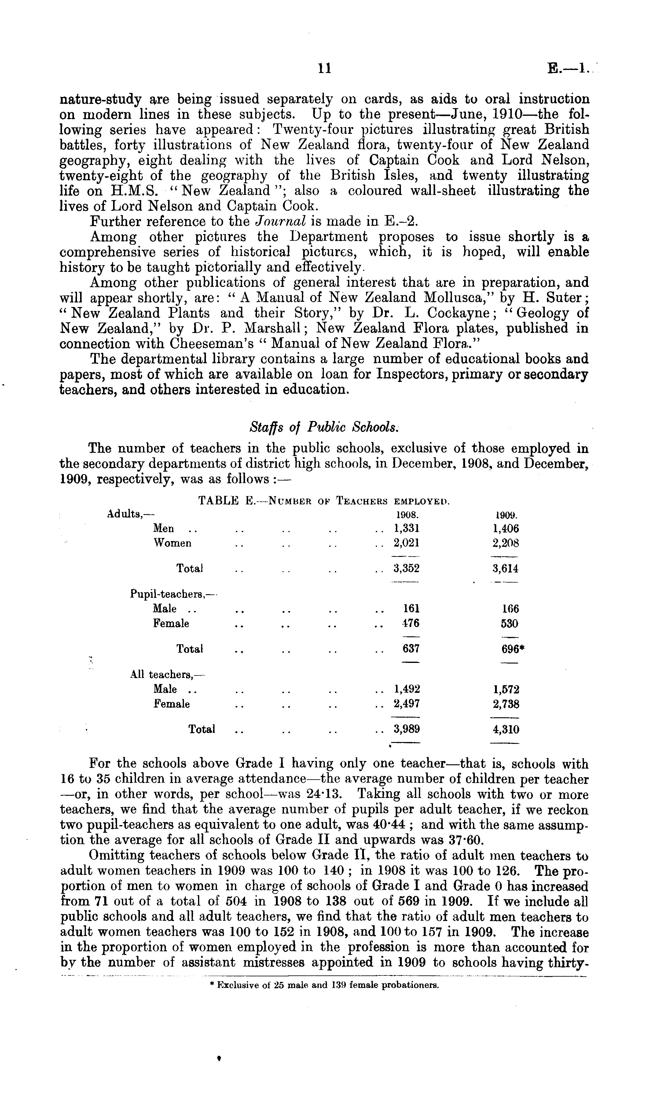 nature-study are being issued separately on cards, as aids to oral instruction on modern lines in these subjects. Up to the present—June, 1910 —the following series have appeared: Twenty-four pictures illustrating great British battles, forty illustrations of New Zealand flora, twenty-four of New Zealand geography, eight dealing with the lives of Captain Cook and Lord Nelson, twenty-eight of the geography of the British Isles, and twenty illustrating life on H.M.S. "New Zealand"; also a coloured wall-sheet illustrating the lives of Lord Nelson and Captain Cook. Further reference to the Journal is made in E.-2. Among other pictures the Department proposes to issue shortly is a comprehensive series of historical pictures, which, it is hoped, will enable history to be taught pictorially and effectively. Among other publications of general interest that are in preparation, and will appear shortly, are: " A Manual of New Zealand Mollusca," by H. Suter; "New Zealand Plants and their Story," by Dr. L. Cockayne; "Geology of New Zealand," by Dr. P. Marshall; New Zealand Flora plates, published in connection with Cheeseman's " Manual of New Zealand Flora." The departmental library contains a large number of educational books and papers, most of which are available on loan for Inspectors, primary or secondary teachers, and others interested in education. Staffs of Public Schools. The number of teachers in the public schools, exclusive of those employed in the secondary departments of district high schools, in December, 1908, and December, 1909, respectively, was as follows : — TABLE E.—Number of Teachers employed. Adults, — 1908. 1909. Men .. .. .. 1,331 1,406 Women .. .. .. .. 2,021 2,208 Total .. .. .. .. 3,352 3,614 Pupil-teachers,— Male .. .. .. .. ..161 166 Female .. .. .. 476 530 Total .. .. .. 637 696* All teachers, — Male .. .. .. .. .. 1,492 1,572 Female .. .. .. .. 2,497 2,738 Total .. .. .. .. 3,989 4,310 For the schools above Grade I having only one teacher—that is, schools with 16 to 35 children in average attendance—the average number of children per teacher —or, in other words, per school—was 24-13. Taking all schools with two or more teachers, we find that the average number of pupils per adult teacher, if we reckon two pupil-teachers as equivalent to one adult, was 40*44 ; and with the same assumption the average for all schools of Grade II and upwards was 37*60. Omitting teachers of schools below Grade 11, the ratio of adult men teachers to adult women teachers in 1909 was 100 to 140 ; in 1908 it was 100 to 126. The proportion of men to women in charge of schools of Grade I and Grade 0 has increased from 71 out of a total of 504 in 1908 to 138 out of 569 in 1909. If we include all public schools and all adult teachers, we find that the ratio of adult men teachers to adult women teachers was 100 to 152 in 1908, and 100 to 157 in 1909. The increase in the proportion of women employed in the profession is more than accounted for by the number of assistant mistresses appointed in 1909 to schools having thirty -