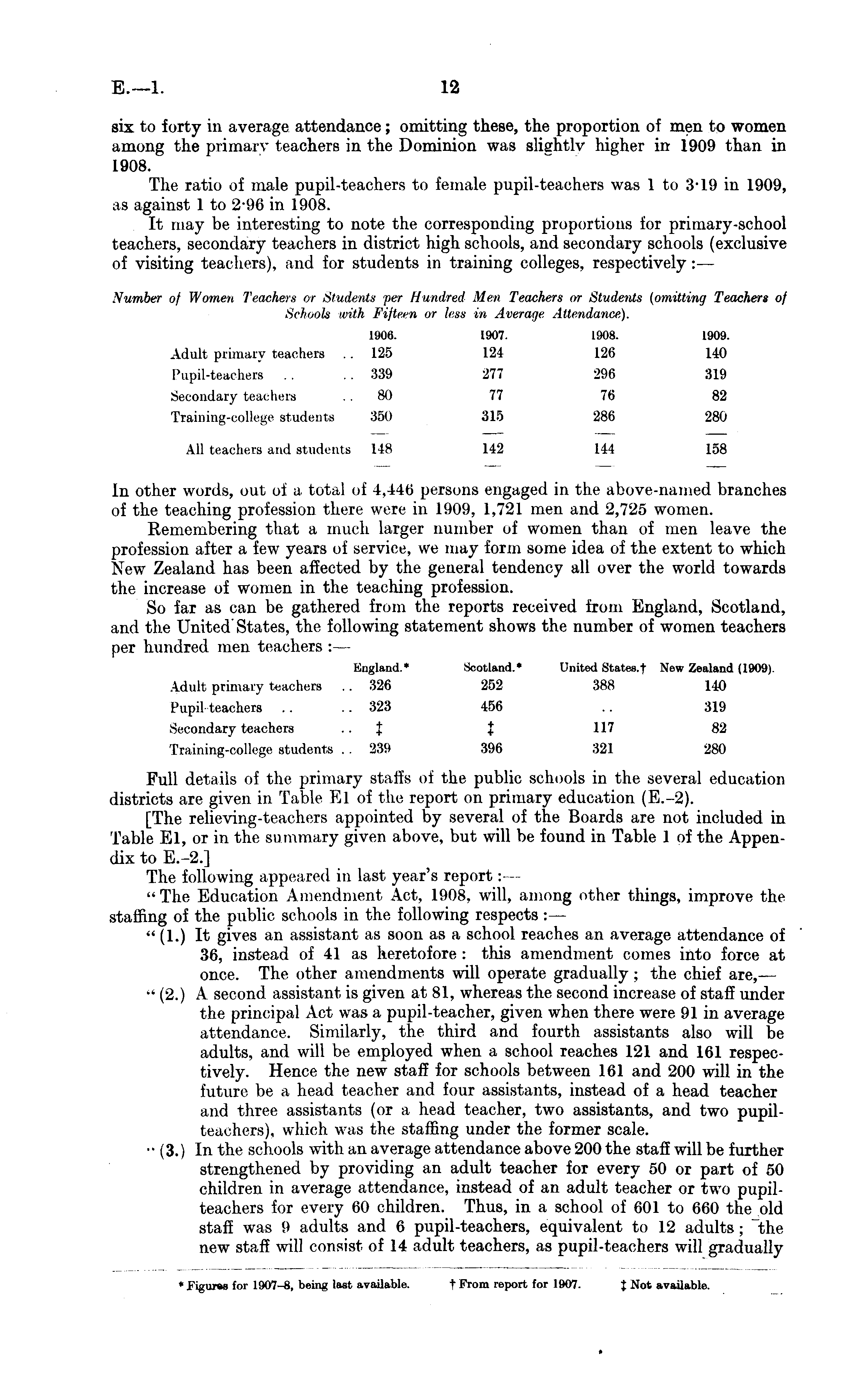 six to forty in average attendance; omitting these, the proportion of men to women among the primary teachers in the Dominion was sliahtlv higher in 1909 than in 1908. The ratio of male pupil-teachers to female pupil-teachers was 1 to 3*19 in 1909, as against 1 to 2*96 in 1908. It may be interesting to note the corresponding proportions for primary-school teachers, secondary teachers in district high schools, and secondary schools (exclusive of visiting teachers), and for students in training colleges, respectively:— Number of Women Teachers or Students per Hundred Men Teachers or Students (omitting Teachers of Schools irith Fifteen or lass in Average Attendance). 1906. 1907. 1908. 1909. Adult primary teachers .. 125 124 126 140 Pupil-teachers .. ..339 277 296 319 Secondary teachers 80 77 76 82 Training-college students 350 315 286 280 All teachers and students 148 142 144 158 In other words, out of a total of 4,446 persons engaged in the above-named branches of the teaching profession there were in 1909, 1,721 men and 2,725 women. Remembering that a much larger number of women than of men leave the profession after a few years of service, we may form some idea of the extent to which New Zealand has been affected by the general tendency all over the world towards the increase of women in the teaching profession. So far as can be gathered from the reports received from England, Scotland, and the United' States, the following statement shows the number of women teachers per hundred men teachers :— England.* Scotland.* United States.! New Zealand (1909). Adult primary teachers .. 326 252 388 140 Pupil teachers .. ..323 456 .. 319 Secondary teachers ■ ■ t t H? 82 Training-college students . . 239 396 321 280 Full details of the primary staffs of the public schools in the several education districts are given in Table El of the report on primary education (E.-2). [The relieving-teachers appointed by several of the Boards are not included in Table El, or in the summary given above, but will be found in Table 1 of the Appendix to E.-2.] The following appeared in last year's report: — " The Education Amendment Act, 1908, will, among other things, improve the staffing of the public schools in the following respects :— " (1.) It gives an assistant as soon as a school reaches an average attendance of 36, instead of 41 as heretofore : this amendment comes into force at once. The other amendments will operate gradually ; the chief are,— •' (2.) A second assistant is given at 81, whereas the second increase of staff under the principal Act was a pupil-teacher, given when there were 91 in average attendance. Similarly, the third and fourth assistants also will be adults, and will be employed when a school reaches 121 and 161 respectively. Hence the new staff for schools between 161 and 200 will in the future be a head teacher and four assistants, instead of a head teacher and three assistants (or a head teacher, two assistants, and two pupilteachers), which was the staffing under the former scale. •• (3.) In the schools with an average attendance above 200 the staff will be further strengthened by providing an adult teacher for every 50 or part of 50 children in average attendance, instead of an adult teacher or two pupilteachers for every 60 children. Thus, in a school of 601 to 660 the old staff was 9 adults and 6 pupil-teachers, equivalent to 12 adults; the new staff will consist of 14 adult teachers, as pupil-teachers will gradually
