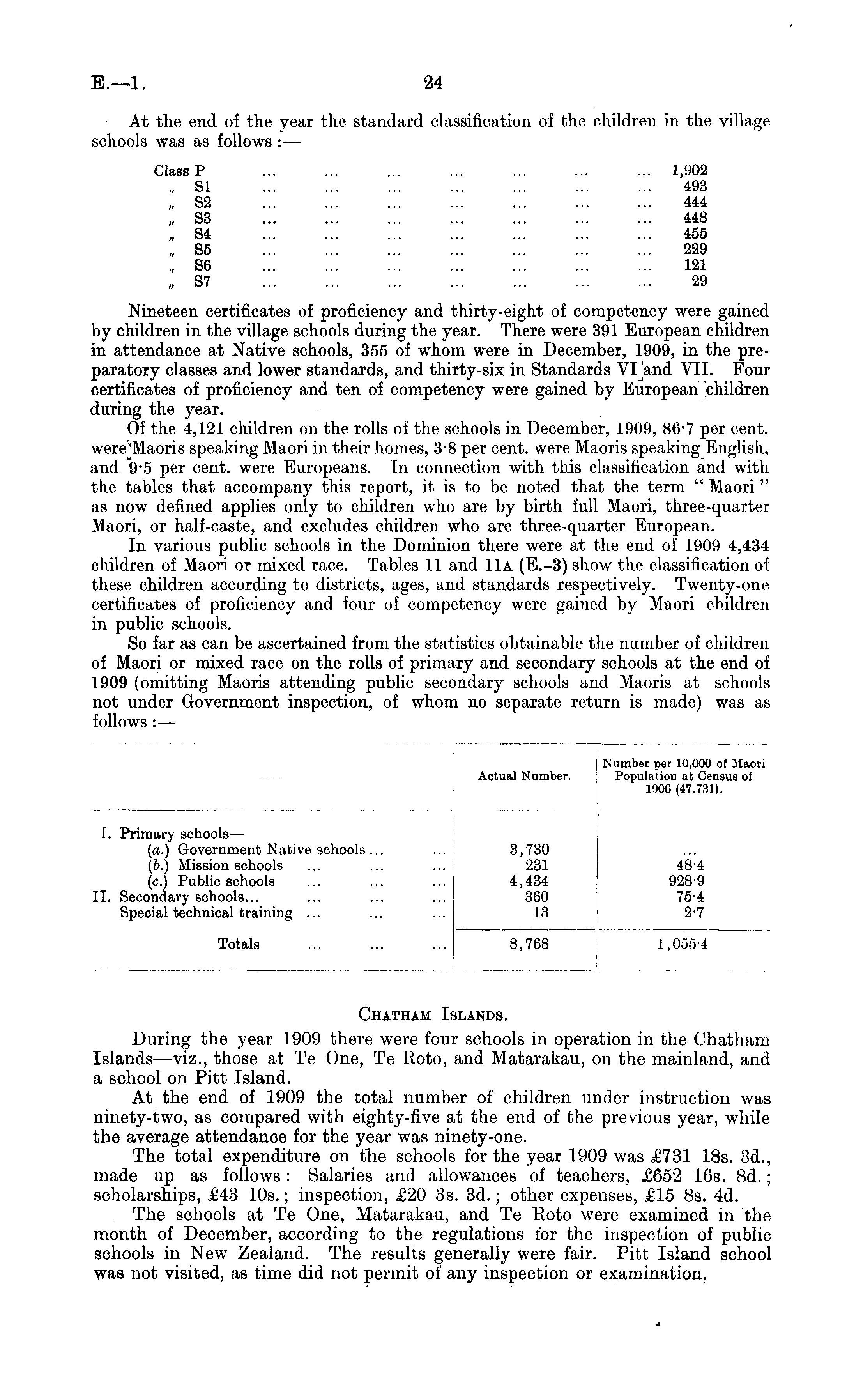At the end of the year the standard classification of the children in the village schools was as follows :— Class P 1,902 „ SI ... 493 „ S2 444 „ S3 448 „ S4 455 „ S5 229 „ S6 121 „ S7 29 Nineteen certificates of proficiency and thirty-eight of competency were gained by children in the village schools during the year. There were 391 European children in attendance at Native schools, 355 of whom were in December, 1909, in the preparatory classes and lower standards, and thirty-six in Standards VFand VII. Four certificates of proficiency and ten of competency were gained by European children during the year. Of the 4,121 children on the rolls of the schools in December, 1909, 86*7 per cent. were] Maoris speaking Maori in their homes, 3*B per cent, were Maoris speaking English. and 9*5 per cent, were Europeans. In connection with this classification and with the tables that accompany this report, it is to be noted that the term " Maori " as now defined applies only to children who are by birth full Maori, three-quarter Maori, or half-caste, and excludes children who are three-quarter European. In various public schools in the Dominion there were at the end of 1909 4,434 children of Maori or mixed race. Tables 11 and Ha (E.-3) show the classification of these children according to districts, ages, and standards respectively. Twenty-one certificates of proficiency and four of competency were gained by Maori children in public schools. So far as can be ascertained from the statistics obtainable the number of children of Maori or mixed race on the rolls of primary and secondary schools at the end of 1909 (omitting Maoris attending public secondary schools and Maoris at schools not under Government inspection, of whom no separate return is made) was as follows : — Number per 10,000 of Maori Actual Number. Population at Census of 1906 (47.731). I. Primary schools— (a.) Government Native schools... ... 3,730 (b.) Mission schools ... ... ... 231 48-4 (c.) Public schools ... ... ... 4,434 928-9 11. Secondary schools... ... ... ... 360 75-4 Special technical training ... ... ... 13 2-7 Totals ... ... ... 8,768 1,055-4 Chatham Islands. During the year 1909 there were four schools in operation in the Chatham Islands —viz., those at Te One, Te Roto, and Matarakau, on the mainland, and a school on Pitt Island. At the end of 1909 the total number of children under instruction was ninety-two, as compared with eighty-five at the end of the previous year, while the average attendance for the year was ninety-one. The total expenditure on the schools for the year 1909 was £731 18s. 3d., made up as follows: Salaries and allowances of teachers, £652 16s. Bd.; scholarships, £43 10s.; inspection, £20 3s. 3d.; other expenses, £15 Bs. 4d. The schools at Te One, Matarakau, and Te Roto were examined in the month of December, according to the regulations for the inspection of public schools in New Zealand. The results generally were fair. Pitt Island school was not visited, as time did not permit of any inspection or examination.