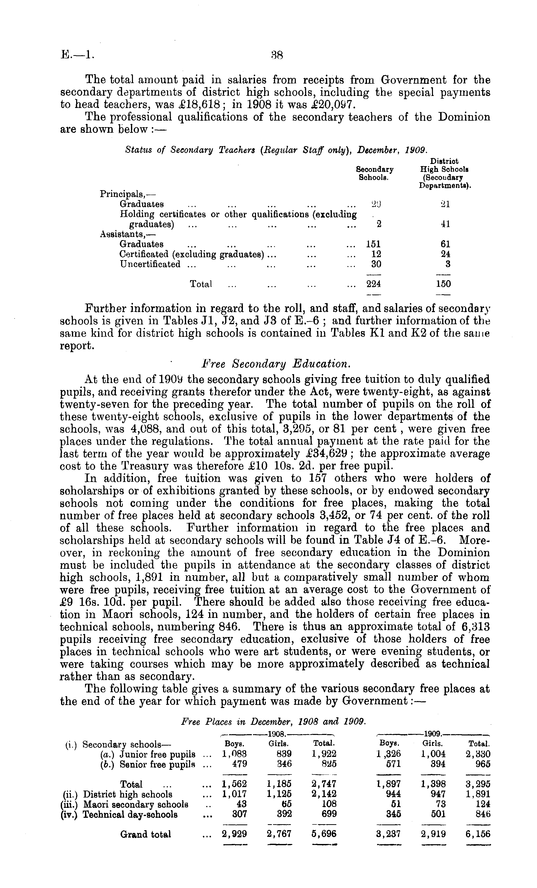 The total amount paid in salaries from receipts from Government for the secondary departments of district high schools, including the special payments to head teachers, was £18,618; in 1908 it was £20,097. The professional qualifications of the secondary teachers of the Dominion are shown below :— Status of Secondary Teachers (Regular Staff only), December, 1909. Distriot Secondary High Sohools Schools. (Secondary Departments). Principals,— Graduates ... ... ... ... ... 29 21 Holding certificates or other qualifications (excluding graduates) ... ... ... ... ... 2 41 Assistants, — Graduates ... ... ... ... ... 151 61 Certificated (excluding graduates)... ... ... 12 24 Uncertificated ... ... ... ... ... 30 3 Total ... ... ... ... 224 150 Further information in regard to the roll, and staff, and salaries of secondary schools is given in Tables Jl, J2, and J3 of E.-6 ; and further information of the same kind for district high schools is contained in Tables Xl and K2 of the same report. Free Secondary Education. At the end of 1909 the secondary schools giving free tuition to duly qualified pupils, and receiving grants therefor under the Act, were twenty-eight, as against twenty-seven for the preceding year. The total number of pupils on the roll of these twenty-eight schools, exclusive of pupils in the lower departments of the schools, was 4,088, and out of this total, 3,295, or 81 per cent , were given free places under the regulations. The total annual payment at the rate paid for the last term of the year would be approximately £34,629 ; the approximate average cost to the Treasury was therefore £10 10s. 2d. per free pupil. In addition, free tuition was given to 157 others who were holders of scholarships or of exhibitions granted by these schools, or by endowed secondary schools not coining under the conditions for free places, making the total number of free places held at secondary schools 3,452, or 74 per cent, of the roll of all these schools. Further information in regard to the free places and scholarships held at secondary schools will be found in Table J4 of E.-6. Moreover, in reckoning the amount of free secondary education in the Dominion must be included the pupils in attendance at the secondary classes of district high schools, 1,891 in number, all but a comparatively small number of whom were free pupils, receiving free tuition at an average cost to the Government of £9 16s. lOd. per pupil. There should be added also those receiving free education in Maori schools, 124 in number, and the holders of certain free places in technical schools, numbering 846. There is thus an approximate total of 6,313 pupils receiving free secondary education, exclusive of those holders of free places in technical schools who were art students, or were evening students, or were taking courses which may be more approximately described as technical rather than as secondary. The following table gives a summary of the various secondary free places at the end of the year for which payment was made by Government: — Free Places in December, 1908 and 1909. 1908. , 1909. (i.) Secondary schools— Boys. Girls. Total. Boys. Girls. Total. (a.) Junior free pupils ... 1,083 839 1,922 1,326 1,004 2,330 (b.) Senior free pupils ... 479 346 825 571 394 965 Total 1,562 1,185 2,747 1,897 1,398 3,295 (ii.) District high schools ... 1,017 1,125 2,142 944 947 1,891 (iii.) Maori secondary schools 43 65 108 51 73 124 (iv.) Technical day-schools ... 307 392 699 345 501 846 Grand total ... 2,929 2,767 5,696 3,237 2,919 6,156
