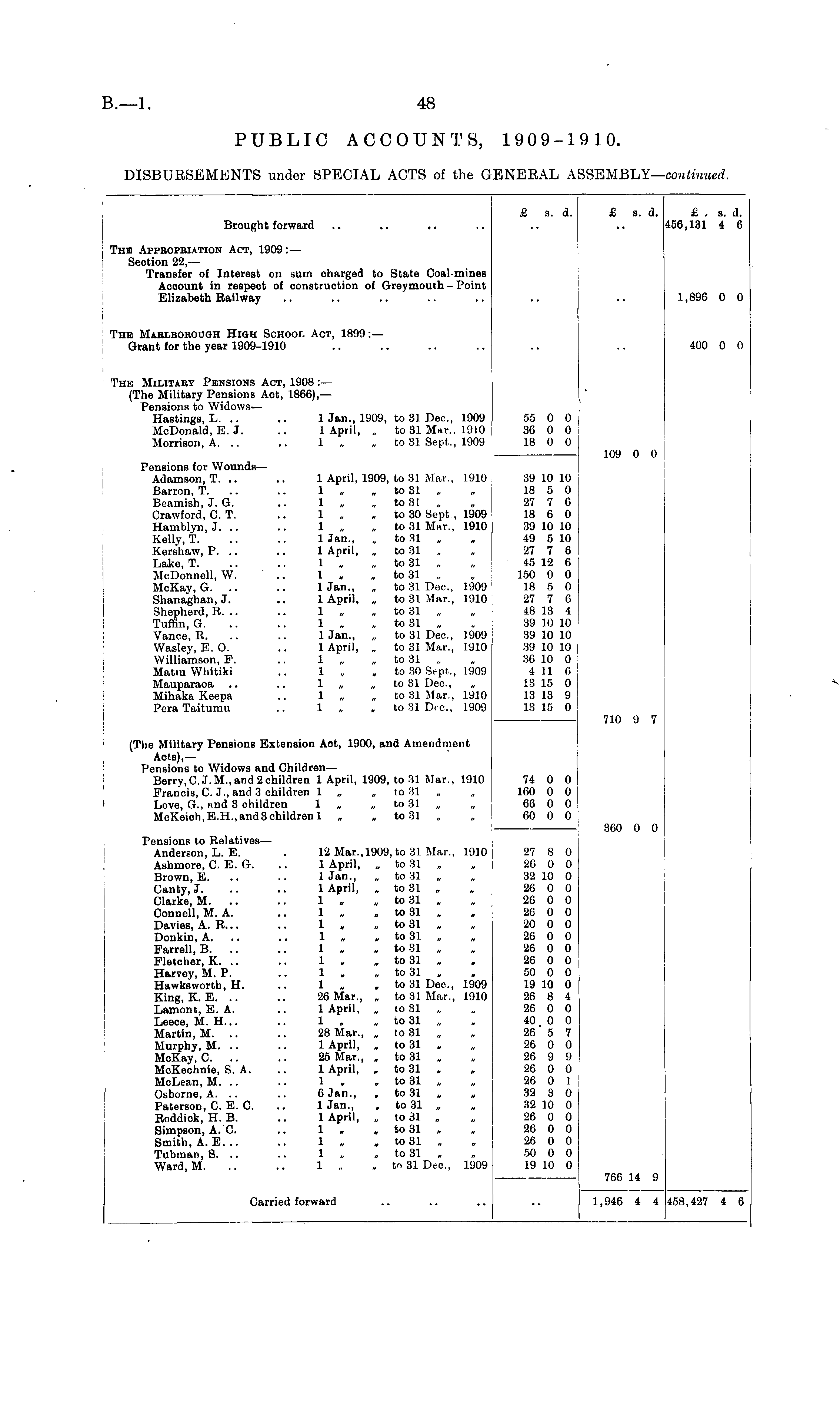 Brought forward £ s. d. £ s. d. £ , s. d. 456,131 4 6 The Appropriation Act, 1909: — Section 22,— Transfer of Interest on sum charged to State Coal-mines Acoount in respect of construction of Greymouth-Point Elizabeth Railway 1,896 0 0 The Marlborough High School Act, 1899:— Grant for the year 1909-1910 400 0 0 The Military Pensions Act, 1908 :— (The Military Pensions Act, 1866),— Pensions to Widows— Hastings, L. .. .. 1 Jan., 1909, to 31 Dec, 1909 McDonald, E. J. .. 1 April, „ to 31 Mar.. 1910 Morrison, A. .. .. 1 „ „ to 31 Sept., 1909 55 0 0 36 0 0 18 0 0 I 109 0 0 Pensions for Wounds — Adamson, T. .. .. 1 April, 1909, to 31 Mar., 1910 Barron, T. .. .. 1 „ . to 81 . Beamish, J. G. .. 1 „ „ to 31 „ Crawford, C. T. .. 1 „ . to 30 Sept , 1909 Hamblyn, J. .. .. 1 „ . to 31 Mar., 1910 Kelly, T. .. .. IJan., „ to 31 „ Kershaw, P. .. .. 1 April, „ to 31 Lake, T. .. .. 1 „ „ to 31 ,. McDonnell, W. .. 1 . . to 31 „ McKay, G. .. .. IJan., . to 31 Dec, 1909 Shanaghan, J. .. 1 April, „ to 31 Mar., 1910 Shepherd, R. .. .. 1 „ „ to 31 . Tuffin, G. .. .. 1 „ „ to 31 „ Vance, R. .. .. IJan., „ to 31 Dec, 1909 Wasley, E. O. .. 1 April, „ to 31 Mar., 1910 Williamson, F. .. 1 „ to 31 „ Matiu Whitiki .. 1 „ . to 30 Sept., 1909 Mauparaoa .. .. 1 „ to 31 Dec, „ Mihaka Keepa .. 1 „ „ to 81 Mar., 1910 PeraTaitumu .. 1 „ . to 31 Dec, 1909 39 10 10 18 5 0 27 7 6 18 6 0 39 10 10 49 5 10 27 7 6 45 12 6 150 0 0 18 5 0 27 7 0 48 13 4 89 10 10 39 10 10 39 10 10 36 10 0 4 11 6 13 15 0 13 13 9 13 15 0 710 9 7 (The Military Pensions Extension Act, 1900, and Amendment Acts),— Pensions to Widows and ChildrenBerry, C.J. M., and 2 children 1 April, 1909, to 31 Mar., 1910 Francis, C. J., and 3 children 1 „ „ to 31 Love, G., and 3 children 1 „ „ to 31 McKeich.E.H.,and3children 1 „ , to 31 . 74 0 0 100 0 0 66 0 0 60 0 0 360 0 0 Pensions to Relatives — Anderson, L. E. . 12 Mar., 1909, to 31 Mar., 1910 Ashmore, C. E. G. .. 1 April, „ to 81 . Brown, E. .. .. IJan., „ to 31 Canty, J. .. .. 1 April, . to 31 „ Clarke, M. .. .. 1 . „ to 81 „ Connell, M. A. .. 1 „ . to 31 „ Davies, A. R... .. 1 „ . to 31 , Donkin, A. .. .. 1 „ „ to 31 „ Farrell, B. .. .. 1 . . to 81 . Fletcher, K. .. .. 1 . . to 31 „ Harvey, M. P. .. 1 . . to 31 . Hawksworth, H. .. 1 . . to 31 Dec, 1909 King, K. E. .. .. 26 Mar., „ to 31 Mar., 1910 Lamont, E. A. .. 1 April, „ to 31 Leece, M. H... .. 1 „ „ to 31 „ Martin, M. .. .. 28 Mar., , to 31 „ Murphy, M. .. .. 1 April, , to 31 McKay, C. .. .. 25 Mar., „ to 31 „ McKoehnie, S. A. .. 1 April, . to 31 „ McLean, M. .. .. 1 . . to 31 „ Osborne, A. .. .. 6 Jan., . to 31 Paterson, C. E. C. .. IJan., . to 31 „ Roddick, H. B. .. 1 April, , to 31 „ Simpson, A. C. .. 1 to 31 Smith, A. E. .. .. 1 . „ to 31 , Tubman, S. .. .. 1 „ „ to 31 „ Ward.M. .. .. 1 „ ,, to 31 Dec, 1909 27 8 0 26 0 0 32 10 0 26 0 0 26 0 0 26 0 0 20 0 0 26 0 0 26 0 0 26 0 0 50 0 0 19 10 0 26 8 4 26 0 0 40 0 0 26 5 7 26 0 0 26 9 9 26 0 0 26 0 1 32 3 0 32 10 0 26 0 0 26 0 0 26 0 0 50 0 0 19 10 0 766 14 9 Carried forward 1,946 [458,427 4 6