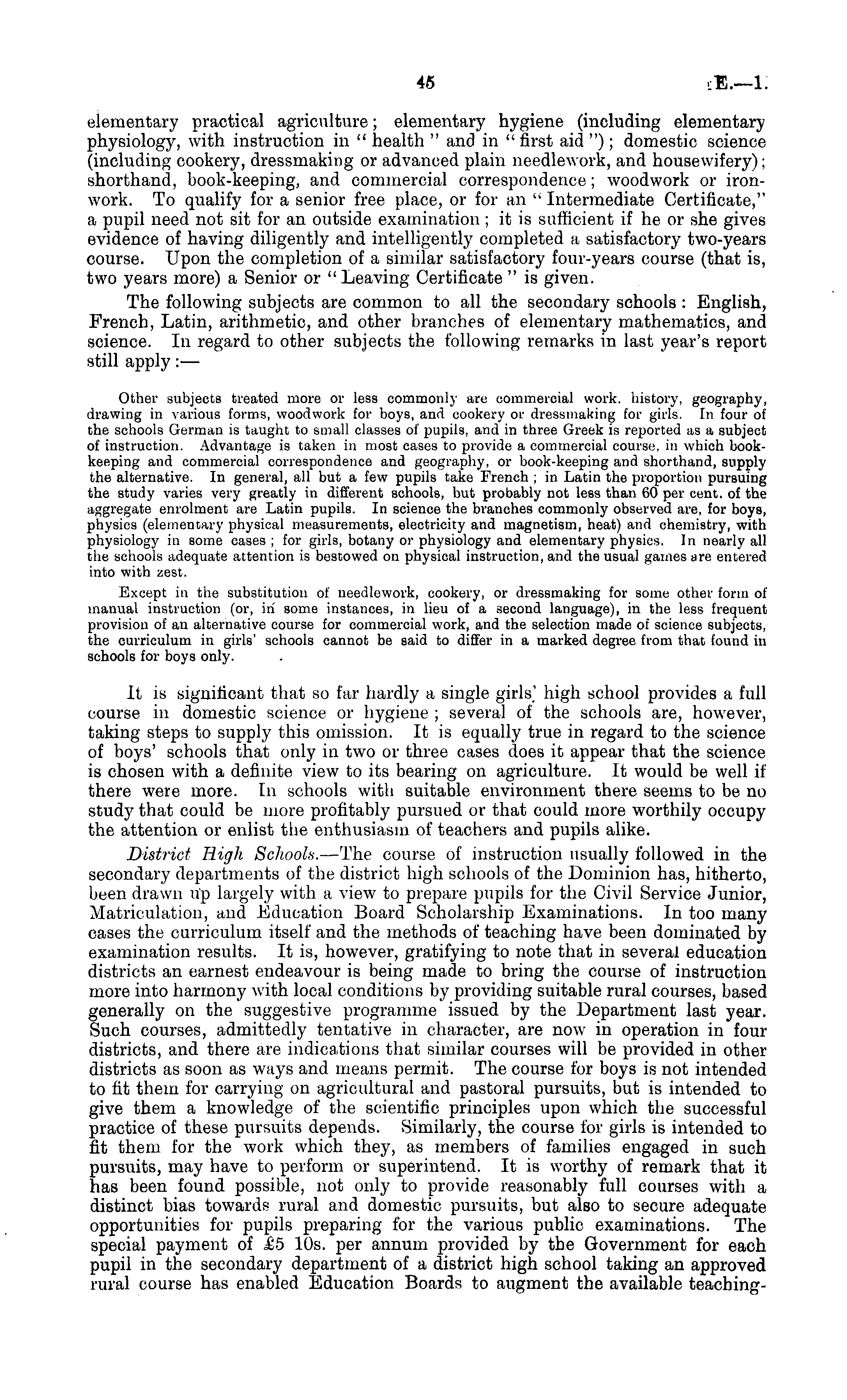 elementary practical agriculture; elementary hygiene (including elementaryphysiology, with instruction in " health " and in "first aid "); domestic science (including cookery, dressmaking or advanced plain needlework, and housewifery); shorthand, book-keeping, and commercial correspondence; woodwork or ironwork. To qualify for a senior free place, or for an "Intermediate Certificate," a pupil need not sit for an outside examination; it is sufficient if he or she gives evidence of having diligently and intelligently completed a satisfactory two-years course. Upon the completion of a similar satisfactory four-years course (that is, two years more) a Senior or " Leaving Certificate " is given. The following subjects are common to all the secondary schools : English, French, Latin, arithmetic, and other branches of elementary mathematics, and science. In regard to other subjects the following remarks in last year's report still apply:— Other subjects treated more or less commonly are commercial work, history, geography, drawing in various forms, woodwork for boys, and cookery or dressmaking for girls. In four of the schools German is taught to small classes of pupils, and in three Greek is reported as a subject of instruction. Advantage is taken in most cases to provide a commercial course, in which bookkeeping and commercial correspondence and geography, or book-keeping and shorthand, supply the alternative. In general, all but a few pupils take French ;in Latin the proportion pursuing the study varies very greatly in different schools, but probably not less than 60 per cent, of the aggregate enrolment are Latin pupils. In science the branches commonly observed are, for boys, physics (elementary physical measurements, electricity and magnetism, heat) and chemistry, with physiology in some cases ; for girls, botany or physiology and elementary physics. In nearly all the schools adequate attention is bestowed on physical instruction, and the usual games are entered into with zest. Except in the substitution of needlework, cookery, or dressmaking for some other form of manual instruction (or, in some instances, in lieu of a second language), in the less frequent provision of an alternative course for commercial work, and the selection made of science subjects, the curriculum in girls' schools cannot be said to differ in a marked degree from that found in schools for boys only. It is significant that so far hardly a single girls' high school provides a full course in domestic science or hygiene ; several of the schools are, however, taking steps to supply this omission. It is equally true in regard to the science of boys' schools that only in two or three cases does it appear that the science is chosen with a definite view to its bearing on agriculture. It would be well if there were more. In schools with suitable environment there seems to be no study that could be more profitably pursued or that could more worthily occupy the attention or enlist the enthusiasm of teachers and pupils alike. District High Schools. —The course of instruction usually followed in the secondary departments of the district high schools of the Dominion has, hitherto, been drawn up largely with a view to prepare pupils for the Civil Service Junior, Matriculation, and Education Board Scholarship Examinations. In too many cases the curriculum itself and the methods of teaching have been dominated by examination results. It is, however, gratifying to note that in several education districts an earnest endeavour is being made to bring the course of instruction more into harmony with local conditions by providing suitable rural courses, based generally on the suggestive programme issued by the Department last year. Such courses, admittedly tentative in character, are now in operation in four districts, and there are indications that similar courses will be provided in other districts as soon as ways and means permit. The course for boys is not intended to fit them for carrying on agricultural and pastoral pursuits, but is intended to give them a knowledge of the scientific principles upon which the successful practice of these pursuits depends. Similarly, the course for girls is intended to fit them for the work which they, as members of families engaged in such pursuits, may have to perform or superintend. It is worthy of remark that it has been found possible, not only to provide reasonably full courses with a distinct bias towards rural and domestic pursuits, but also to secure adequate opportunities for pupils preparing for the various public examinations. The special payment of £5 10s. per annum provided by the Government for each pupil in the secondary department of a district high school taking an approved rural course has enabled Education Boards to augment the available teaching-