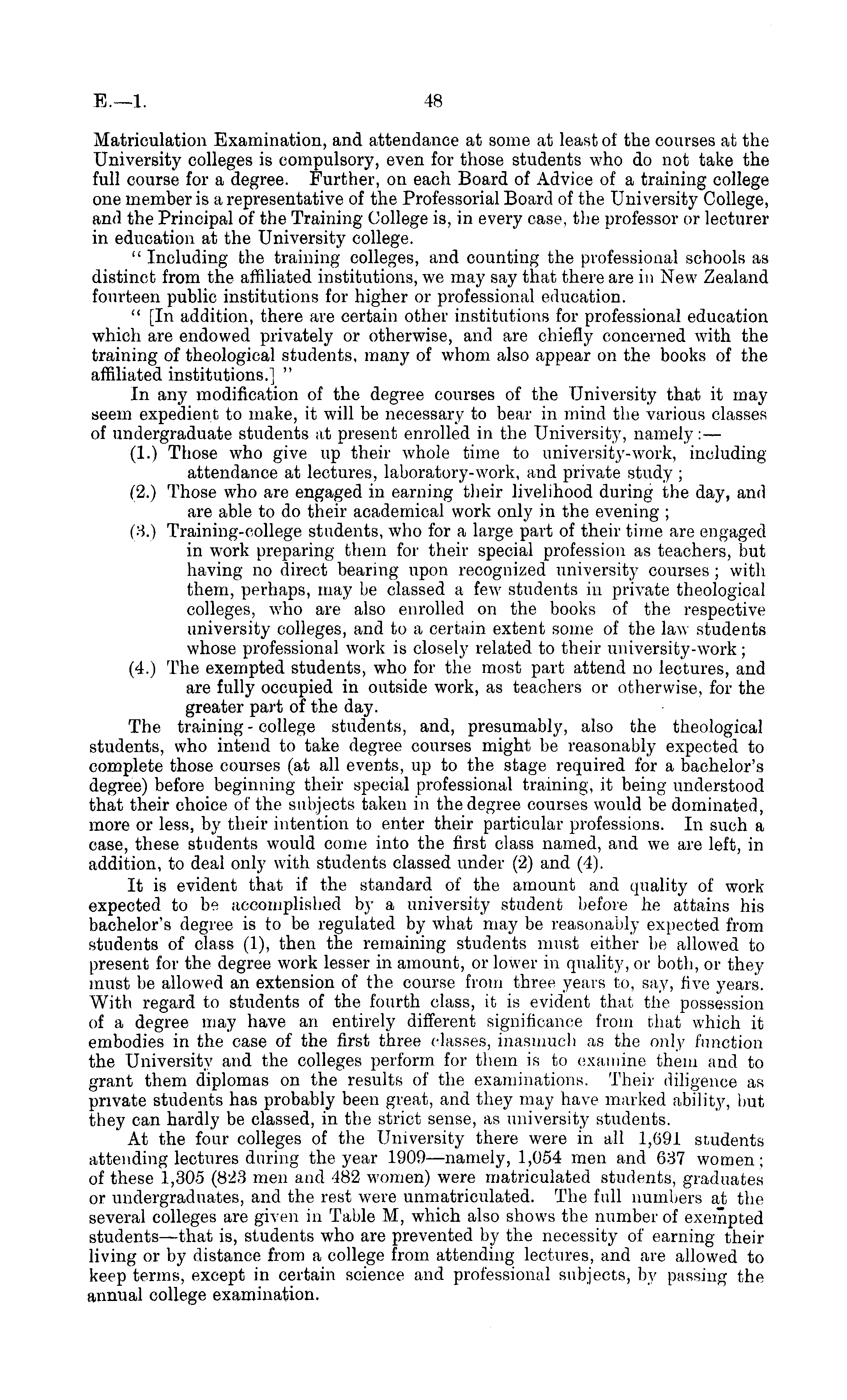 Matriculation Examination, and attendance at some at least of the courses at the University colleges is compulsory, even for those students who do not take the full course for a degree. Further, on each Board of Advice of a training college one member is a representative of the Professorial Board of the University College, and the Principal of the Training College is, in every case, the professor or lecturer in education at the University college. " Including the training colleges, and counting the professional schools as distinct from the affiliated institutions, we may say that there are in New Zealand fourteen public institutions for higher or professional education. " [In addition, there are certain other institutions for professional education which are endowed privately or otherwise, and are chiefly concerned with the training of theological students, many of whom also appear on the books of the affiliated institutions.] " In any modification of the degree courses of the University that it mayseem expedient to make, it will be necessary to bear in mind the various classes of undergraduate students at present enrolled in the University, namely:— (1.) Those who give up their whole time to university-work, including attendance at lectures, laboratory-work, and private study ; (2.) Those who are engaged in earning their livelihood during the day, and are able to do their academical work only in the evening ; (3.) Training-college students, who for a large part of their time are engaged in work preparing them for their special profession as teachers, but having no direct bearing upon recognized university courses ; with them, perhaps, may be classed a few students in private theological colleges, who are also enrolled on the books of the respective university colleges, and to a certain extent some of the law students whose professional work is closely related to their university-work; (4.) The exempted students, who for the most part attend no lectures, and are fully occupied in outside work, as teachers or otherwise, for the greater part of the day. The training-college students, and, presumably, also the theological students, who intend to take degree courses might be reasonably expected to complete those courses (at all events, up to the stage required for a bachelor's degree) before beginning their special professional training, it being understood that their choice of the subjects taken in the degree courses would be dominated, more or less, by their intention to enter their particular professions. In such a case, these students would come into the first class named, and we are left, in addition, to deal only with students classed under (2) and (4). It is evident that if the standard of the amount and quality of work expected to be accomplished by a university student before he attains his bachelor's degree is to be regulated by what may be reasonably expected from students of class (1), then the remaining students must either be allowed to present for the degree work lesser in amount, or lower in quality, or both, or they must be allowed an extension of the course from three years to, say, five years. With regard to students of the fourth class, it is evident that the possession of a degree may have an entirely different significance from that which it embodies in the case of the first three classes, inasmuch as the only function the University and the colleges perform for them is to examine them and to grant them diplomas on the results of the examinations. Their diligence as private students has probably been great, and they may have marked ability, but they can hardly be classed, in the strict sense, as university students. At the four colleges of the University there were in all 1,691 students attending lectures during the year 1909—namely, 1,054 men and 637 women; of these 1,305 (823 men and 482 women) were matriculated students, graduates or undergraduates, and the rest were unmatriculated. The full numbers at the several colleges are given in Table M, which also shows the number of exempted students —that is, students who are prevented by the necessity of earning their living or by distance from a college from attending lectures, and are allowed to keep terms, except in certain science and professional subjects, by passing the annual college examination.
