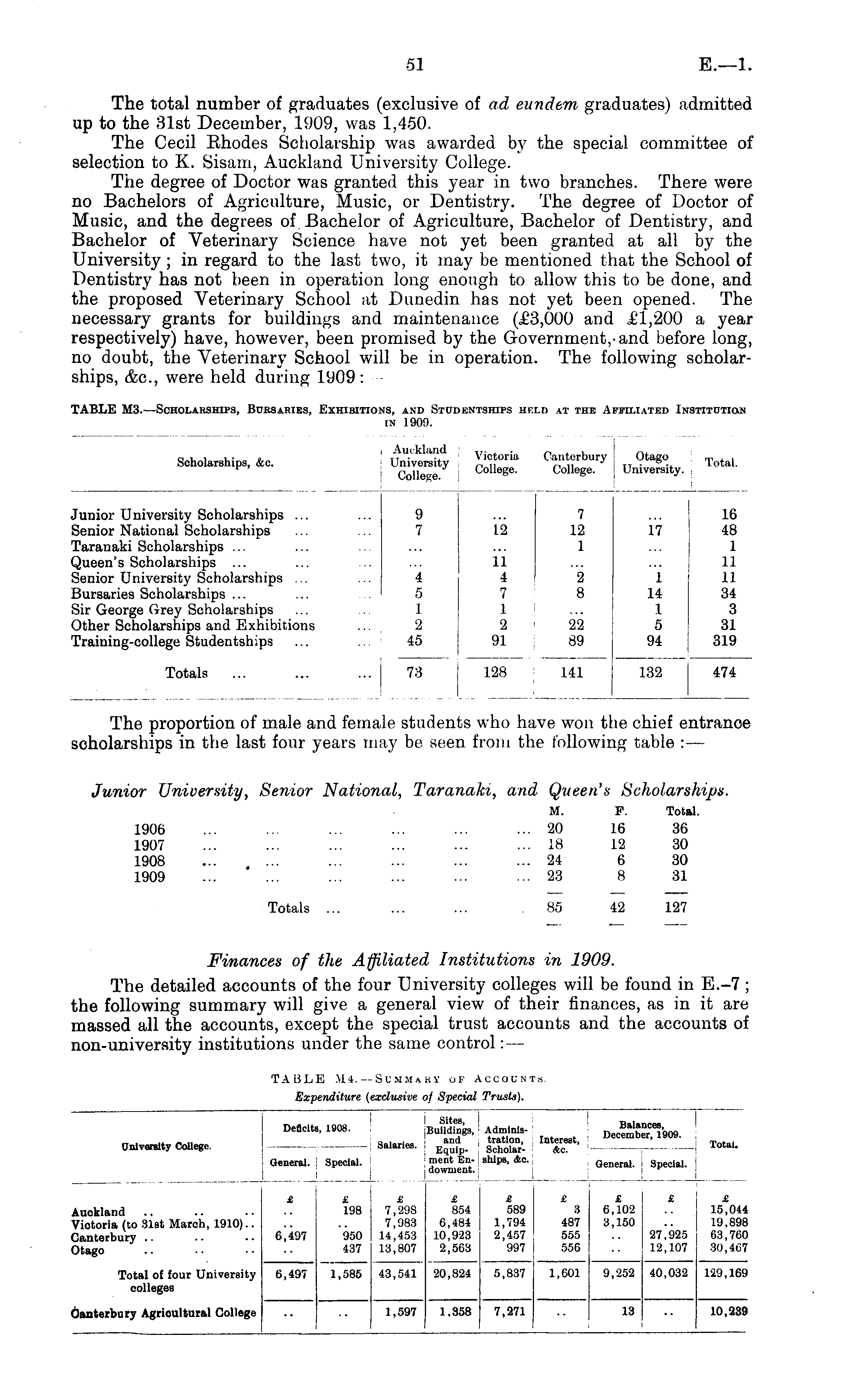 The total number of graduates (exclusive of ad eundem graduates) admitted up to the 31st December, 1909, was 1,450. The Cecil Khodes Scholarship was awarded by the special committee of selection to K. Sisam, Auckland University College. The degree of Doctor was granted this year in two branches. There were no Bachelors of Agriculture, Music, or Dentistry. The degree of Doctor of Music, and the degrees of Bachelor of Agriculture, Bachelor of Dentistry, and Bachelor of Veterinary Science have not yet been granted at all by the University; in regard to the last two, it may be mentioned that the School of Dentistry has not been in operation long enough to allow this to be done, and the proposed Veterinary School at Dunedin has not yet been opened. The necessary grants for buildings and maintenance (£3,000 and £1,200 a year respectively) have, however, been promised by the Government,-and before long, no doubt, the Veterinary School will be in operation. The following scholarships, &c, were held during 1909 :