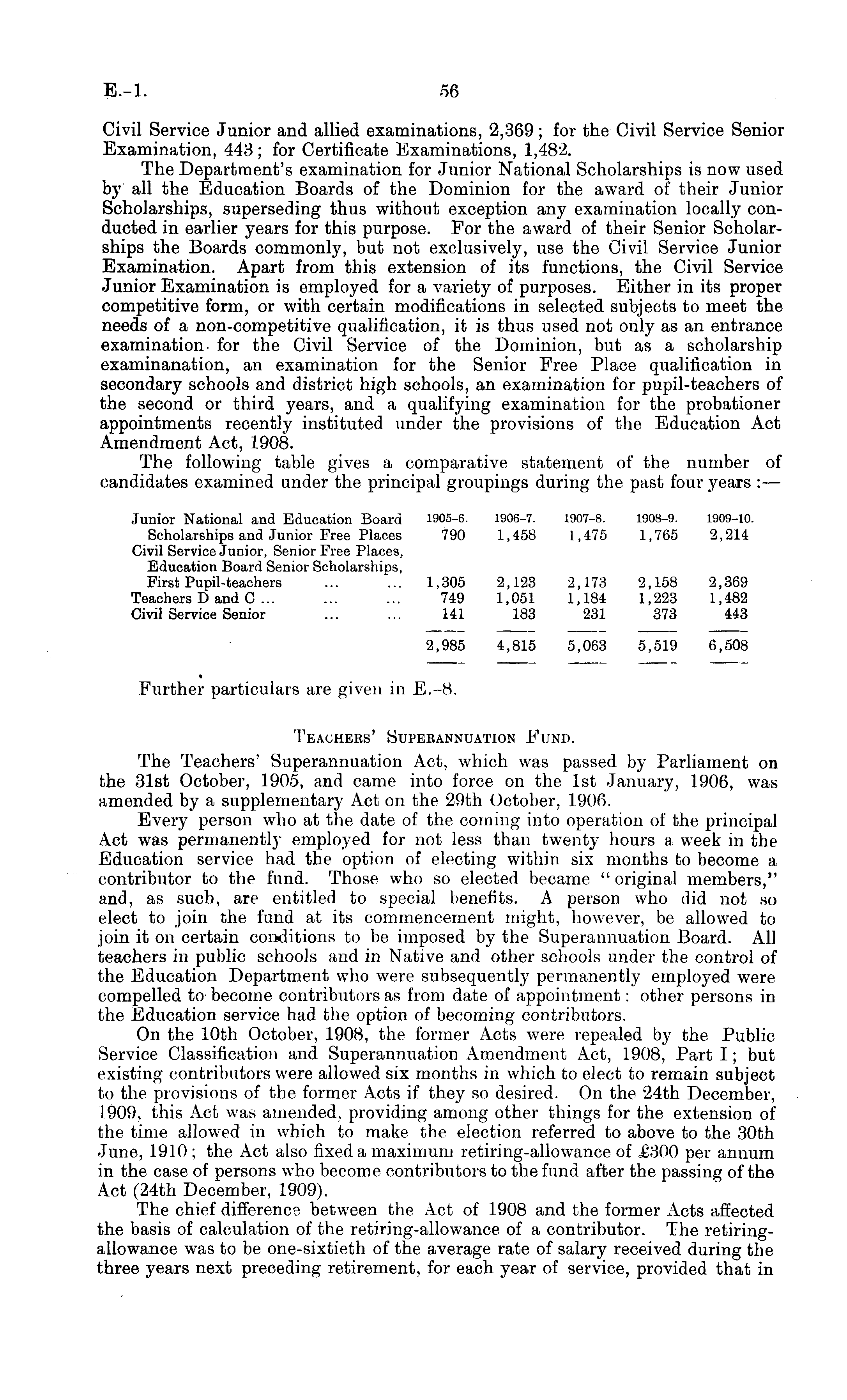 Civil Service Junior and allied examinations, 2,369; for the Civil Service Senior Examination, 443; for Certificate Examinations, 1,482. The Department's examination for Junior National Scholarships is now used b}' all the Education Boards of the Dominion for the award of their Junior Scholarships, superseding thus without exception any examination locally conducted in earlier years for this purpose. For the award of their Senior Scholarships the Boards commonly, but not exclusively, use the Civil Service Junior Examination. Apart from this extension of its functions, the Civil Service Junior Examination is employed for a variety of purposes. Either in its proper competitive form, or with certain modifications in selected subjects to meet the needs of a non-competitive qualification, it is thus used not only as an entrance examination for the Civil Service of the Dominion, but as a scholarship examinanation, an examination for the Senior Free Place qualification in secondary schools and district high schools, an examination for pupil-teachers of the second or third years, and a qualifying examination for the probationer appointments recently instituted under the provisions of the Education Act Amendment Act, 1908. The following table gives a comparative statement of the number of candidates examined under the principal groupings during the past four years : — Junior National and Education Board 1905-6. 1906-7. 1907-8. 1908-9. 1909-10. Scholarships and Junior Free Places 790 1,458 1,475 1,765 2,214 Civil Service Junior, Senior Free Places, Education Board Senior Scholarships, First Pupil-teachers ... ... 1,305 2,123 2,173 2,158 2,369 Teachers D and C ... ... ... 749 1,051 1,184 1,223 1,482 Civil Service Senior ... ... 141 183 231 373 443 2,985 4,815 5,063 5,519 6,508 Further particulars are given in E.-8. Teachers' Superannuation Fund. The Teachers' Superannuation Act, which was passed by Parliament on the 31st October, 1905, and came into force on the Ist January, 1906, was amended by a supplementary Act on the 29th October, 1906. Every person who at the date of the coining into operation of the principal Act was permanently employed for not less than twenty hours a week in the Education service had the option of electing within six months to become a contributor to the fund. Those who so elected became " original members," and, as such, are entitled to special benefits. A person who did not so elect to join the fund at its commencement might, however, be allowed to join it on certain conditions to be imposed by the Superannuation Board. AH teachers in public schools and in Native and other schools under the control of the Education Department who were subsequently permanently employed were compelled to become contributors as from date of appointment: other persons in the Education service had the option of becoming contributors. On the 10th October, 1908, the former Acts were repealed by the Public Service Classification and Superannuation Amendment Act, 1908, Part I; but existing contributors were allowed six months in which to elect to remain subject to the provisions of the former Acts if they so desired. On the 24th December, 1909, this Act was amended, providing among other things for the extension of the time allowed in which to make the election referred to above to the 30th June, 1910 ; the Act also fixed a maximum retiring-allowance of £300 per annum in the case of persons who become contributors to the fund after the passing of the Act (24th December, 1909). The chief difference between the Act of 1908 and the former Acts affected the basis of calculation of the retiring-allowance of a contributor. The retiringallowance was to be one-sixtieth of the average rate of salary received during the three years next preceding retirement, for each year of service, provided that in
